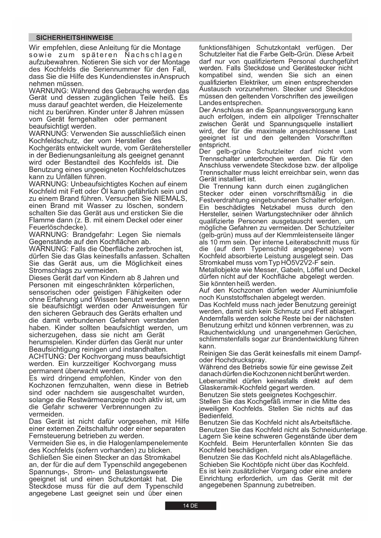 Die Installation eines Haushaltsgeräts kann unter Umständen eine komplexe Arbeit sein; wenn diese nicht korrekt ausgeführt wird, könnte es zu schweren Beeinträchtigungen der Sicherheit des Benutzers kommen. Das ist der Grund, warum sie von einem qualifizierten Fachmann unter Einhaltung der geltenden technischen Regeln durchgeführt werden soll. Falls diese Empfehlung nicht beachtet und die Installation des Gerätes durch eine nicht qualifizierte Person durchgeführt werden sollte, lehnt der Hersteller jede Verantwortung für eventuelle technische Fehler des Produktes ab, gleichviel, ob es zu Schäden an Personen oder Sachen führt. 2.1. ELEKTRISCHER ANSCHLUSS Vor dem elektrischen Anschluss ist die einwandfreie Erdung der elektrischen Hausinstallation zu prüfen. Die Erdung des Gerätes ist gesetzlich vorgeschrieben. Der Hersteller weist jede Verantwortung für Sach- oder Personenschäden zurück, die auf fehlende bzw. mangelhafte Erdung zurückzuführen sind. Bei den Modellen, die ohne Stecker geliefert werden, ist ein genormter Stecker an das Kabel zu montieren, welcher für die auf das Matrikelschild angegebene Überprüfen Sie die auf dem Matrikelschild angegebenen Daten. Das Matrikelschild befindet sich auf der unteren Seite des Gerätegehäuses. Notieren Sie alle Daten wie Matrikel- und Seriennummer am besten direkt auf dem Deckblatt der Bedienungsanleitung, da diese Angaben in einem eventuellen Servicefall vom Kundendienst benötigt werden. Überprüfen Sie, dass die Netzspannung und die Leistung für den Betrieb des Gerätes geeignet sind. Belastung geeignet ist. Der Erdleiter ist durch das gelb-grüne Kabel gekennzeichnet. Der Stecker muss in jedem Fall zugänglich sein. Soll das Gerät an einer festen Anschlussdose angeschlossen werden, ist zwischen dem Gerät und dem Versorgungsnetz eine der Last entsprechende, genormte Abschaltvorrichtung einzubauen. Sollte das Netzkabel beschädigt sein, muss dieser durch einen qualifizierten Fachmann ausgewechselt werden. Der gelb-grüne Erdleiter muss mindestens 10 mm länger sein als die Phasenleiter. Der Querschnitt der Kabel muss der Leistung der Kochmulde entsprechen (s. Matrikelschild). Benutzen Sie ausschließlich ein Netzkabel des Typs 3x0.75 mm² H05 V2V2-F. PHASE ERDE NULL