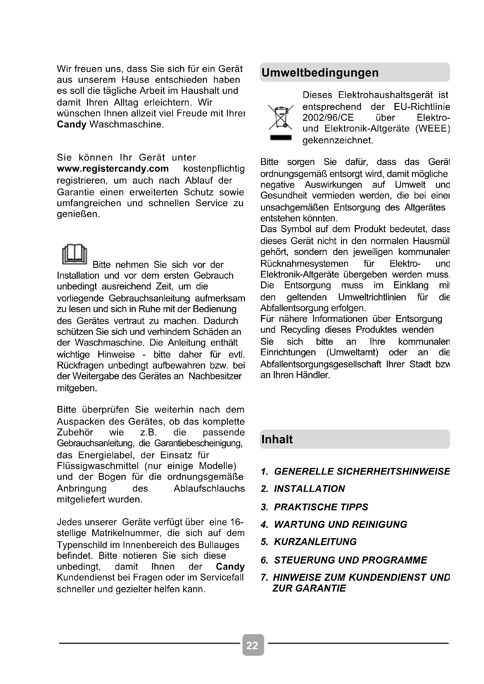 Wir freuen uns, dass Sie sich für ein Gerät aus unserem Hause entschieden haben es soll die tägliche Arbeit im Haushalt und damit ihren Alltag erleichtern. Wir wünschen Ohnen allzeit viel Freude mit ihrer Candy Waschmaschine.