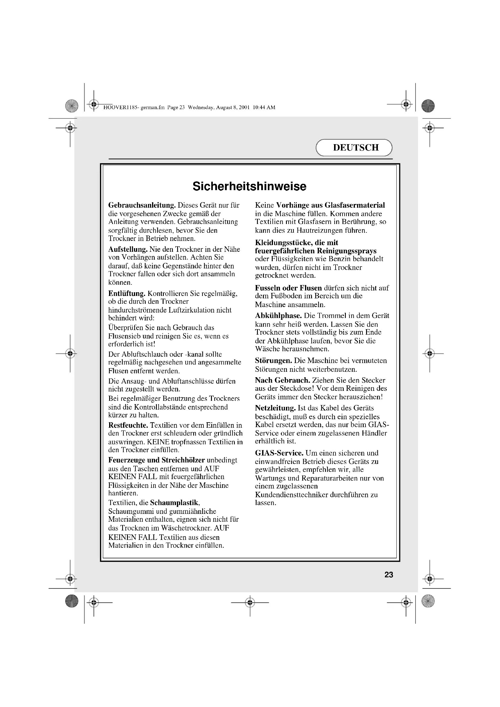 Sicherheitshinweise Gebrauchsanleitung. Dieses Gerät nur für die vorgesehenen Zwecke gemäß der Anleitung verwenden. Gebrauchsanleitung sorgfältig durchlesen, bevor Sie den Trockner in Betrieb nehmen. Aufstellung. Nie den Trockner in der Nähe von Vorhängen aufstellen. Achten Sie darauf, daß keine Gegenstände hinter den Trockner fallen oder sich dort ansammeln können. Entlüftung. Kontrollieren Sie regelmäßig, ob die durch den Trockner hindurchströmende Luftzirkulation nicht behindert wird: Überprüfen Sie nach Gebrauch das Flusensieb und reinigen Sie es, wenn es erforderlich ist! Der Abluftschlauch oder -kanal sollte regelmäßig nachgesehen und angesammelte Flusen entfernt werden. Die Ansaug- und Abluftanschlüsse dürfen nicht zugestellt werden. Bei regelmäßiger Benutzung des Trockners sind die Kontrollabstände entsprechend kürzer zu halten. Restfeuchte. Textilien vor dem Einfüllen in den Trockner erst schleudern oder gründlich auswringen. KEINE tropfnassen Textilien in den Trockner einfüllen. Feuerzeuge und Streichhölzer unbedingt aus den Taschen entfernen und AUF KEINEN FALL mit feuergefährlichen Flüssigkeiten in der Nähe der Maschine hantieren. Textilien, die Schaumplastik, Schaumgummi und gummiähnliche Materialien enthalten, eignen sich nicht für das Trocknen im Wäschetrockner. AUF KEINEN FALL Textilien aus diesen Materialien in den Trockner einfüllen. Keine Vorhänge aus Glasfasermaterial in die Maschine füllen. Kommen andere Textilien mit Glasfasern in Berührung, so kann dies zu Hautreizungen führen. Kleidungsstücke, die mit feuergefährlichen Reinigungssprays oder Flüssigkeiten wie Benzin behandelt wurden, dürfen nicht im Trockner getrocknet werden. Fusseln oder Flusen dürfen sich nicht auf dem Fußboden im Bereich um die Maschine ansammeln. Abkühlphase. Die Trommel in dem Gerät kann sehr heiß werden. Lassen Sie den Trockner stets vollständig bis zum Ende der Abkühlphase laufen, bevor Sie die Wäsche herausnehmen. Störungen. Die Maschine bei vermuteten Störungen nicht weiterbenutzen. Nach Gebrauch. Ziehen Sie den Stecker aus der Steckdose! Vor dem Reinigen des Geräts immer den Stecker herausziehen! Netzleitung. Ist das Kabel des Geräts beschädigt, muß es durch ein spezielles Kabel ersetzt werden, das nur beim GIAS- Service oder einem zugelassenen Händler erhältlich ist. GIAS-Service. Um einen sicheren und einwandfreien Betrieb dieses Geräts zu gewährleisten, empfehlen wir, alle Wartungs und Reparaturarbeiten nur von einem zugelassenen Kundendiensttechniker durchführen zu lassen. HOOVER1185- german.fm Page 23 Wednesday, August 8, 2001 10:44 AMDEUTSCH