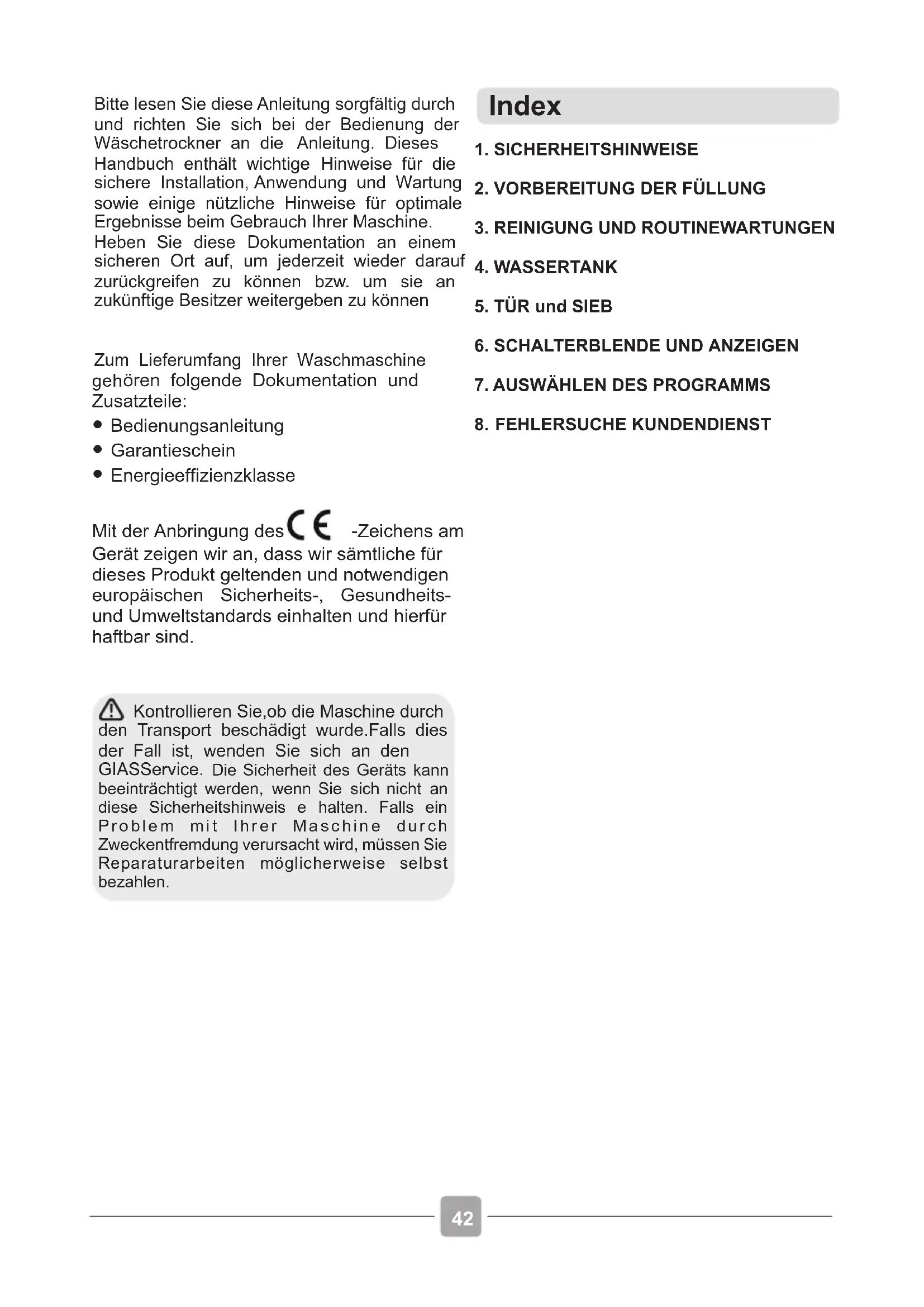 Vor jedem Waschgang die Filter reinigen. Index Bitte lesen Sie diese Anleitung sorgfältig durch und richten Sie sich bei der Bedienung der Wäschetrockner an die Anleitung. Dieses Handbuch enthält wichtige Hinweise für die sichere Installation, Anwendung und Wartung sowie einige nützliche Hinweise für optimale Ergebnisse beim Gebrauch Ihrer Maschine. Heben Sie diese Dokumentation an einem sicheren Ort auf, um jederzeit wieder darauf zurückgreifen zu können bzw. um sie an zukünftige Besitzer weitergeben zu können Zum Lieferumfang Ihrer Waschmaschine geh ören folgende Dokumentation und Zusatzteile: