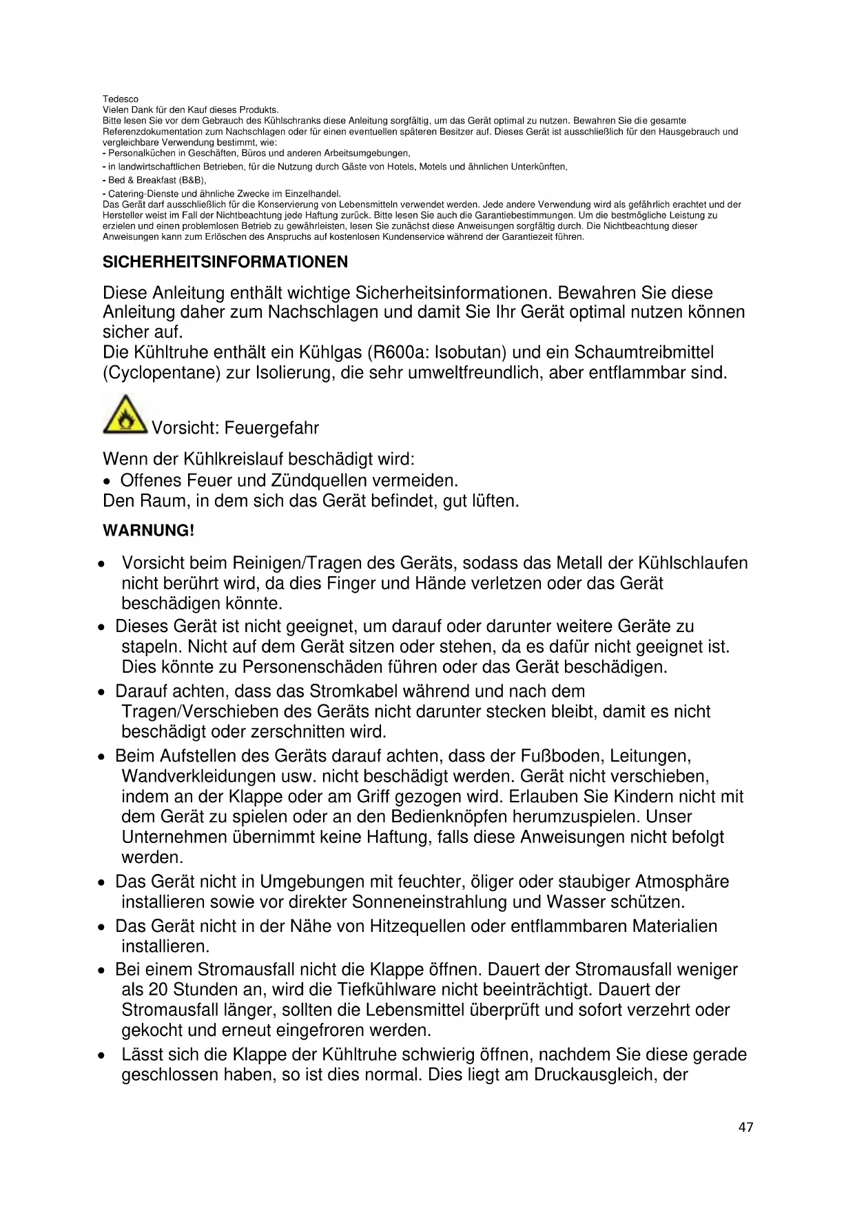 Nützliche Tipps und Tricks ................................................................................. 53 Den Gefrierschrank auftauen ............................................................................. 54 ENTSORGUNG ................................................................................................... 5547 Tedesco Vielen Dank für den Kauf dieses Produkts. Bitte lesen Sie vor dem Gebrauch des Kühlschranks diese Anleitung sorgfältig, um das Gerät optimal zu nutzen. Bewahren Sie die gesamte Referenzdokumentation zum Nachschlagen oder für einen eventuellen späteren Besitzer auf. Dieses Gerät ist ausschließlich für den Hausgebrauch und vergleichbare Verwendung bestimmt, wie: - Personalküchen in Geschäften, Büros und anderen Arbeitsumgebungen, - in landwirtschaftlichen Betrieben, für die Nutzung durch Gäste von Hotels, Motels und ähnlichen Unterkünften, - Bed & Breakfast (B&B), - Catering-Dienste und ähnliche Zwecke im Einzelhandel. Das Gerät darf ausschließlich für die Konservierung von Lebensmitteln verwendet werden. Jede andere Verwendung wird als gefährlich erachtet und der Hersteller weist im Fall der Nichtbeachtung jede Haftung zurück. Bitte lesen Sie auch die Garantiebestimmungen. Um die bestmögliche Leistung zu erzielen und einen problemlosen Betrieb zu gewährleisten, lesen Sie zunächst diese Anweisungen sorgfältig durch. Die Nichtbeachtung dieser Anweisungen kann zum Erlöschen des Anspruchs auf kostenlosen Kundenservice während der Garantiezeit führen. SICHERHEITSINFORMATIONEN Diese Anleitung enthält wichtige Sicherheitsinformationen. Bewahren Sie diese Anleitung daher zum Nachschlagen und damit Sie Ihr Gerät optimal nutzen können sicher auf. Die Kühltruhe enthält ein Kühlgas (R600a: Isobutan) und ein Schaumtreibmittel (Cyclopentane) zur Isolierung, die sehr umweltfreundlich, aber entflammbar sind. Vorsicht: Feuergefahr Wenn der Kühlkreislauf beschädigt wird: