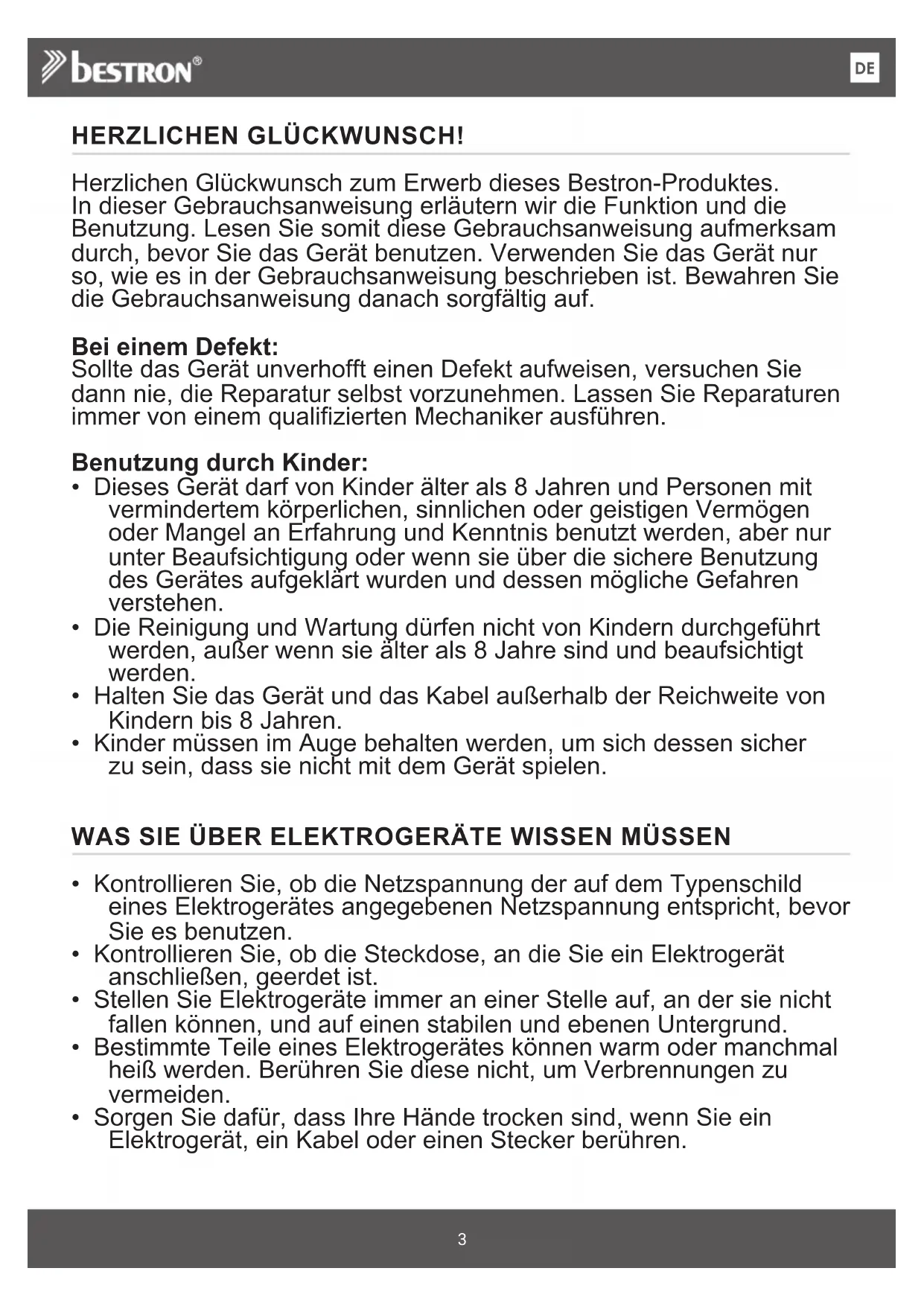 - Tauchen Sie das Heizelement niemals in Wasser oder andere Flüssigkeiten und stellen Sie es nicht unter fließendes Wasser. GARANTIEBESTIMMUNGEN Bestron handhabt unter den folgenden Bedingungen eine Garantie von 60 Monaten ab Kaufdatum gegen Defekte, die durch Herstellungs- und/oder Materialfehler entstanden sind.