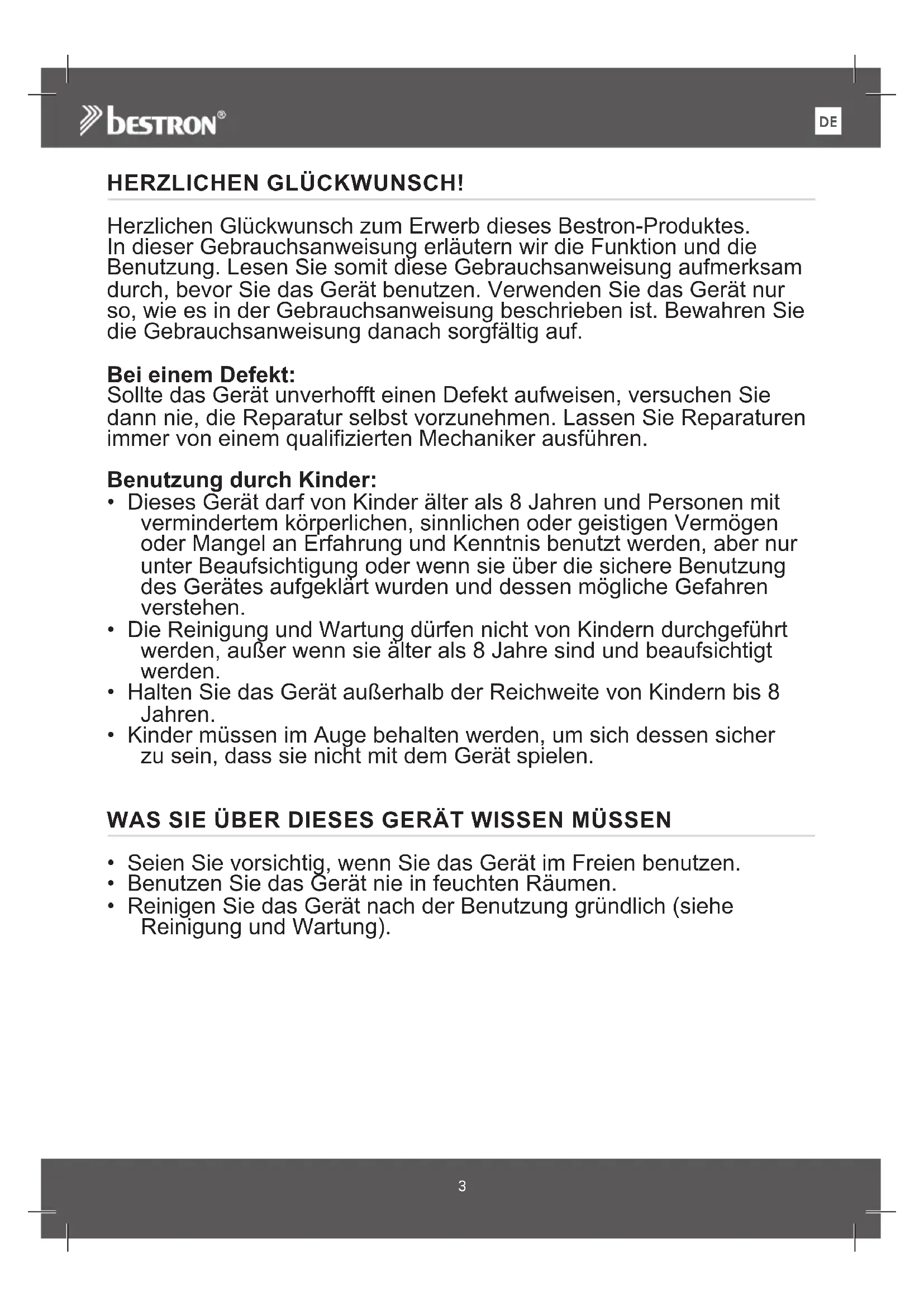 - Defekte Zubehörteile oder bei Umtausch die defekten Geräte selbst werden automatisch Eigentum von Bestron.