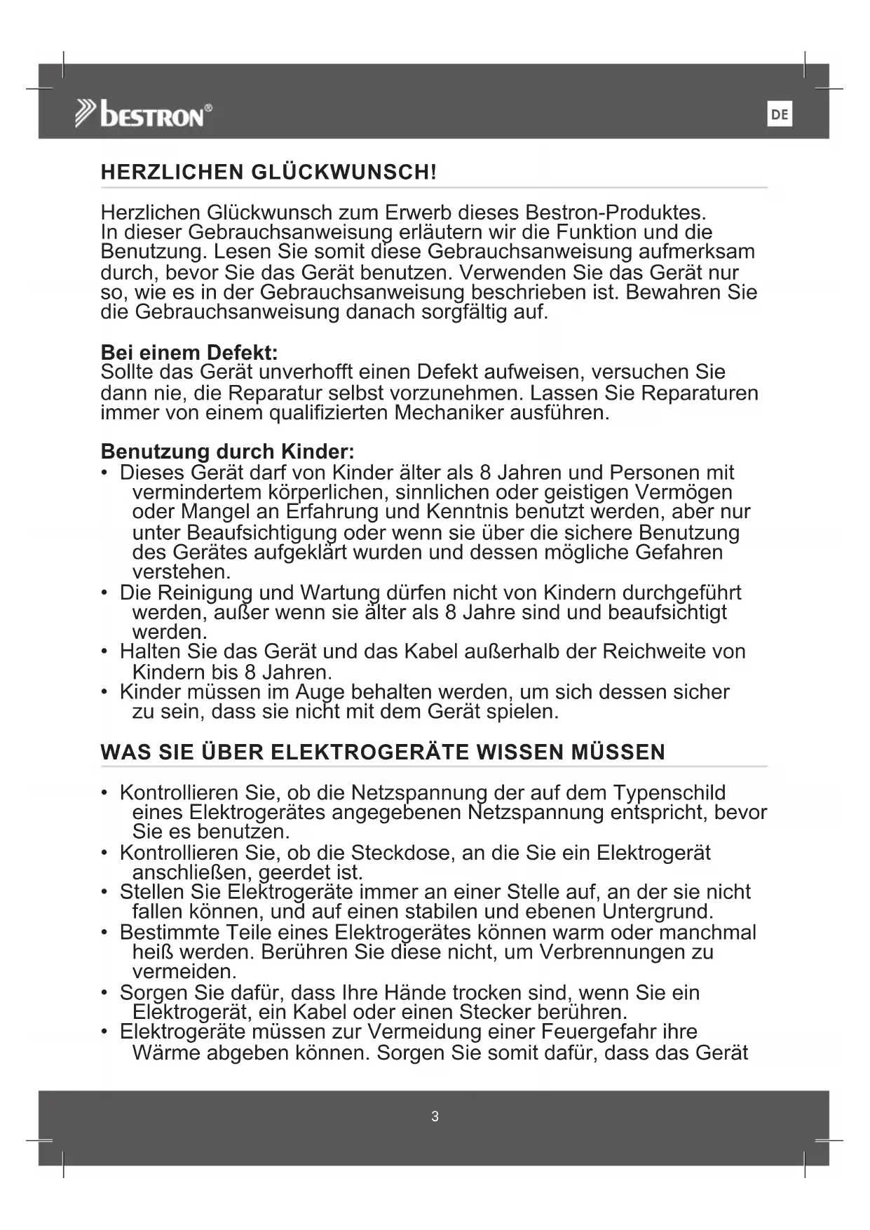 geltend gemacht werden. Senden Sie ein Gerät nicht ohne vorherige Rücksprache zurück. Das Paket kann dann abgelehnt werden und eventuelle Kosten gehen zu Ihren Lasten. Nehmen Sie erst für Anweisungen, wie Sie das Gerät einpacken und versenden müssen, Kontakt auf. Jedem Garantieanspruch muss der Kaufbeleg beigefügt werden. SERVICE Sollte sich unverhofft eine Störung ergeben, dann können Sie mit dem BESTRON-Kundendienst Kontakt aufnehmen: www.bestron.com/service