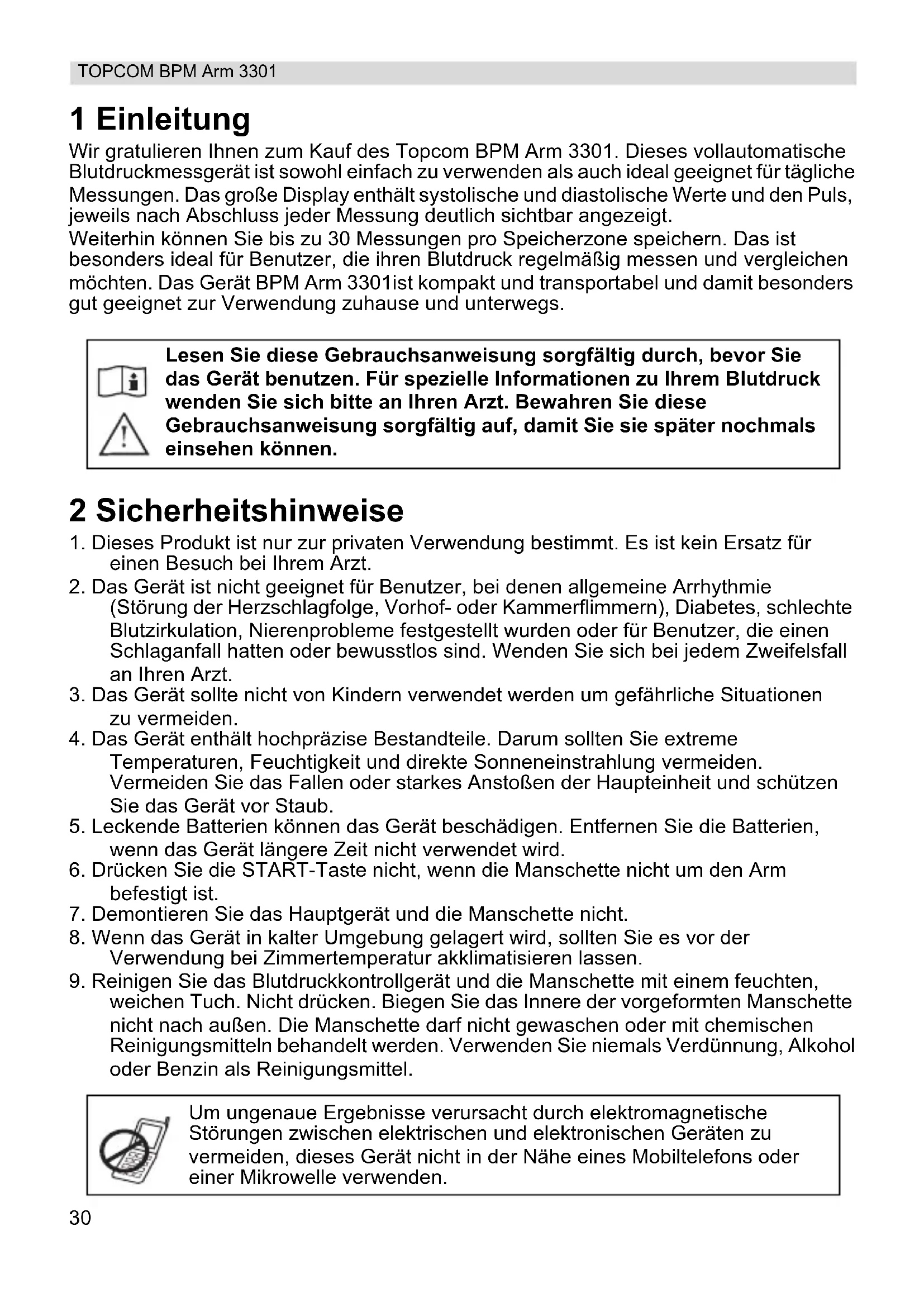 weichen Tuch. Nicht drücken. Biegen Sie das Innere der vorgeformten Manschette nicht nach außen. Die Manschette darf nicht gewaschen oder mit chemischen Reinigungsmitteln behandelt werden. Verwenden Sie niemals Verdünnung, Alkohol oder Benzin als Reinigungsmittel. Lesen Sie diese Gebrauchsanweisung sorgfältig durch, bevor Sie das Gerät benutzen. Für spezielle Informationen zu Ihrem Blutdruck wenden Sie sich bitte an Ihren Arzt. Bewahren Sie diese Gebrauchsanweisung sorgfältig auf, damit Sie sie später nochmals einsehen können. Um ungenaue Ergebnisse verursacht durch elektromagnetische Störungen zwischen elektrischen und elektronischen Geräten zu vermeiden, dieses Gerät nicht in der Nähe eines Mobiltelefons oder einer Mikrowelle verwenden.31 DEUTSCH TOPCOM BPM Arm 3301 3 Nützliche Hinweise Nachfolgend finden Sie einige nützliche Hinweise für noch genauere Messwerte: