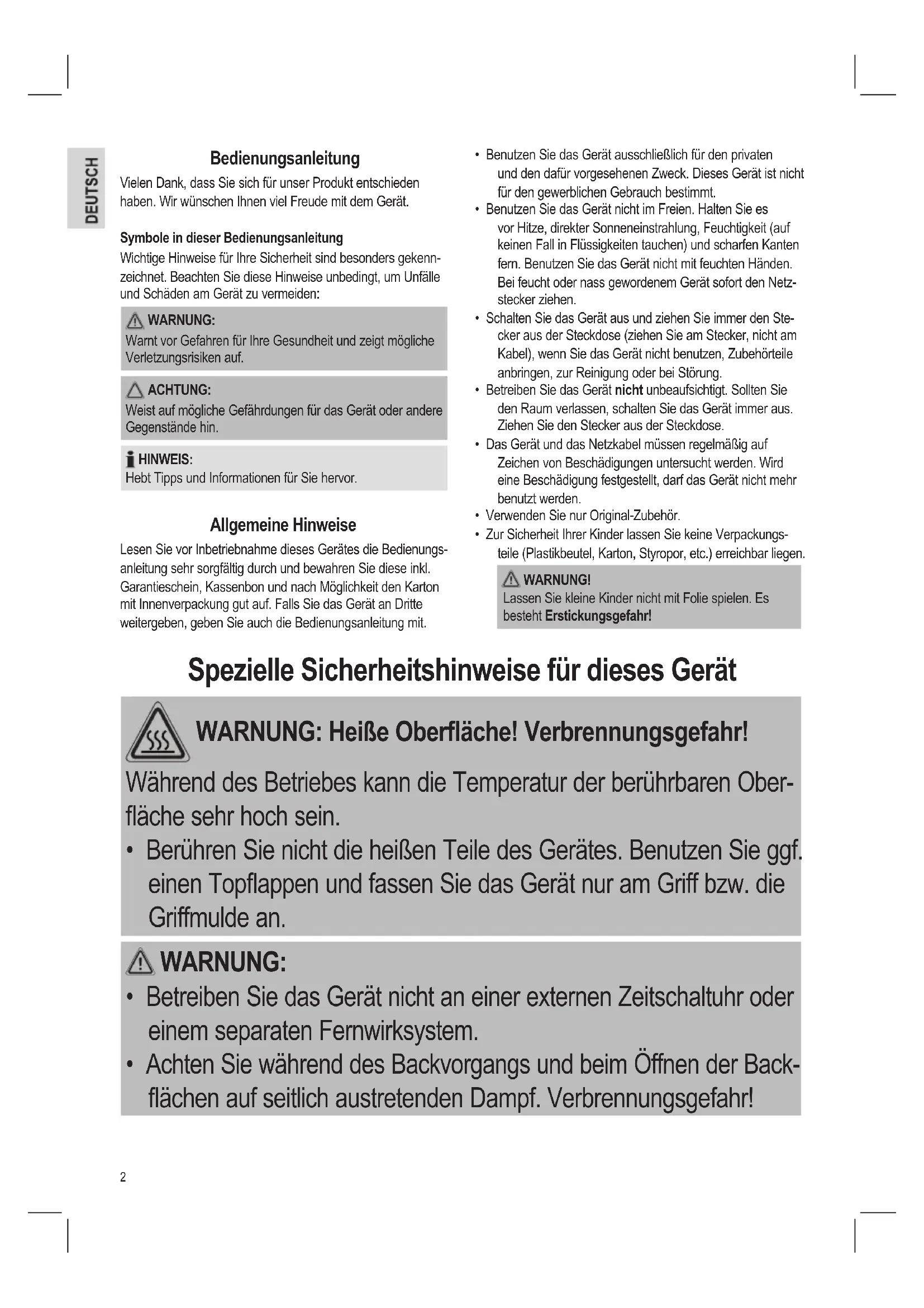 - Zur Sicherheit Ihrer Kinder lassen Sie keine Verpackungs- teile (Plastikbeutel, Karton, Styropor, etc.) erreichbar liegen. WARNUNG! Lassen Sie kleine Kinder nicht mit Folie spielen. Es besteht Erstickungsgefahr! Spezielle Sicherheitshinweise für dieses Gerät WARNUNG: Heiße Oberäche! Verbrennungsgefahr! Während des Betriebes kann die Temperatur der berührbaren Ober- äche sehr hoch sein.