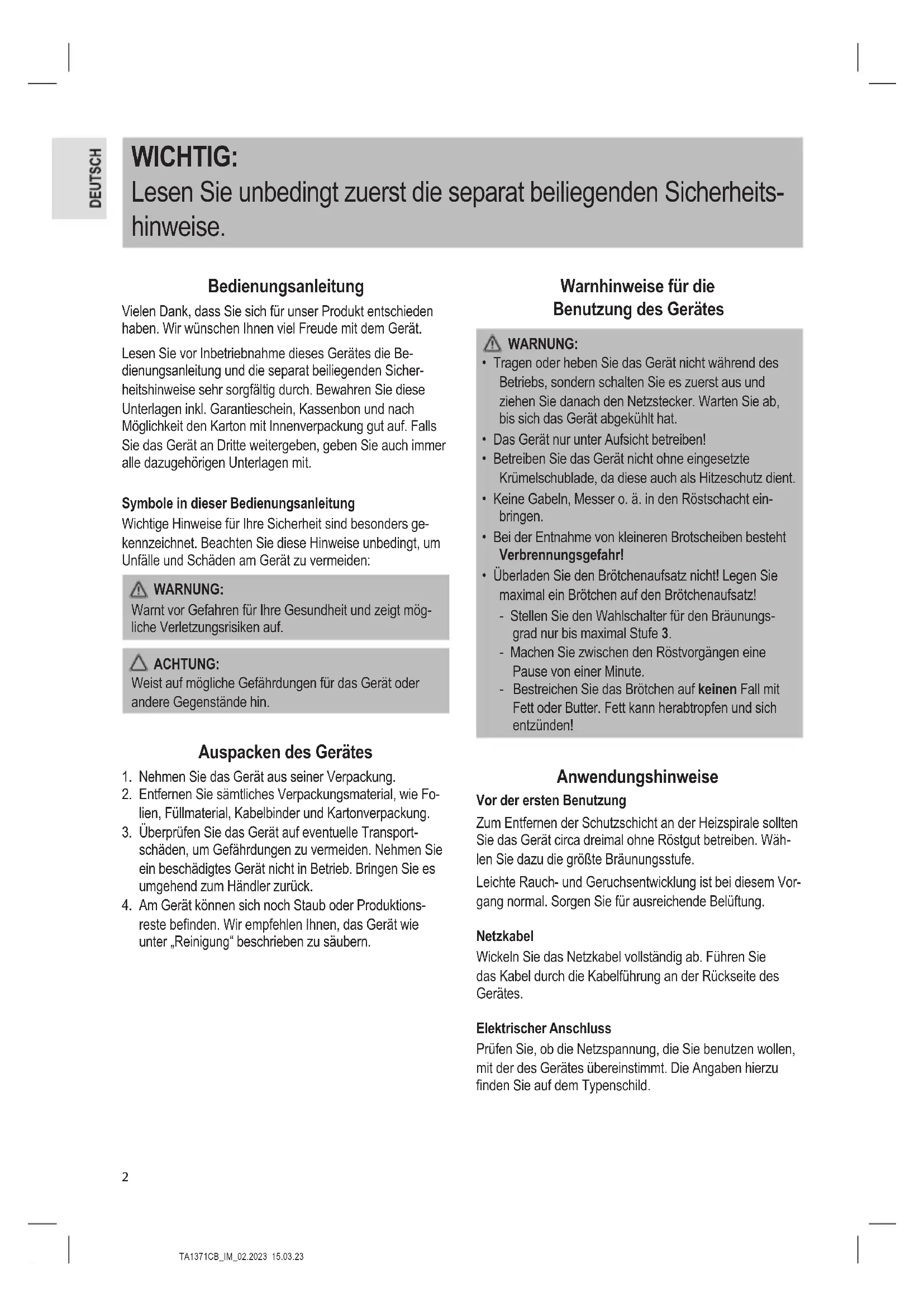 TA 1371 CB TA1371CB_IM_02.2023 15.03.23 Bedienungsanleitung Instruction Manual • Gebruiksaanwijzing • Mode d’emploi Manual de instrucciones • Istruzioni per l’uso • Instrukcja obsługi / Gwarancja Használati utasítás • Руководство по эксплуатации • TOASTER Toaster • Broodrooster • Grille-pain Tostadora • Tostapane • Toster Kenyérpirító • Тостер •2 TA1371CB_IM_02.2023 15.03.23 WICHTIG: Lesen Sie unbedingt zuerst die separat beiliegenden Sicherheits- hinweise. Bedienungsanleitung Vielen Dank, dass Sie sich für unser Produkt entschieden haben. Wir wünschen Ihnen viel Freude mit dem Gerät. Lesen Sie vor Inbetriebnahme dieses Gerätes die Be- dienungsanleitung und die separat beiliegenden Sicher- heitshinweise sehr sorgfältig durch. Bewahren Sie diese Unterlagen inkl. Garantieschein, Kassenbon und nach Möglichkeit den Karton mit Innenverpackung gut auf. Falls Sie das Gerät an Dritte weitergeben, geben Sie auch immer alle dazugehörigen Unterlagen mit. Symbole in dieser Bedienungsanleitung Wichtige Hinweise für Ihre Sicherheit sind besonders ge- kennzeichnet. Beachten Sie diese Hinweise unbedingt, um Unfälle und Schäden am Gerät zu vermeiden: WARNUNG: Warnt vor Gefahren für Ihre Gesundheit und zeigt mög- liche Verletzungsrisiken auf. ACHTUNG: Weist auf mögliche Gefährdungen für das Gerät oder andere Gegenstände hin. Auspacken des Gerätes