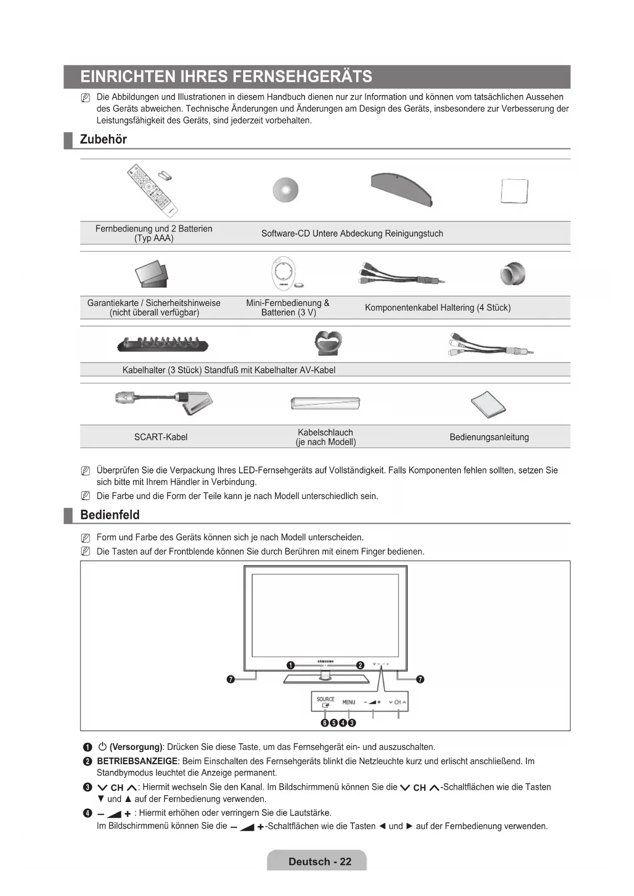 Die Abbildungen und Illustrationen in diesem Handbuch dienen nur zur Information und können vom tatsächlichen Aussehen des Geräts abweichen. Technische Änderungen und Änderungen am Design des Geräts, insbesondere zur Verbesserung der Leistungsfähigkeit des Geräts, sind jederzeit vorbehalten. Zubehör Fernbedienung und 2 Batterien (Typ AAA) Software-CD Untere Abdeckung Reinigungstuch Garantiekarte / Sicherheitshinweise (nicht überall verfügbar) Mini-Fernbedienung & Batterien (3 V) Komponentenkabel Haltering (4 Stück) Kabelhalter (3 Stück) Standfuß mit Kabelhalter AV-Kabel SCART-Kabel Kabelschlauch (je nach Modell) Bedienungsanleitung Überprüfen Sie die Verpackung Ihres LED-Fernsehgeräts auf Vollständigkeit. Falls Komponenten fehlen sollten, setzen Sie sich bitte mit Ihrem Händler in Verbindung. Die Farbe und die Form der Teile kann je nach Modell unterschiedlich sein. Bedienfeld Form und Farbe des Geräts können sich je nach Modell unterscheiden. Die Tasten auf der Frontblende können Sie durch Berühren mit einem Finger bedienen.