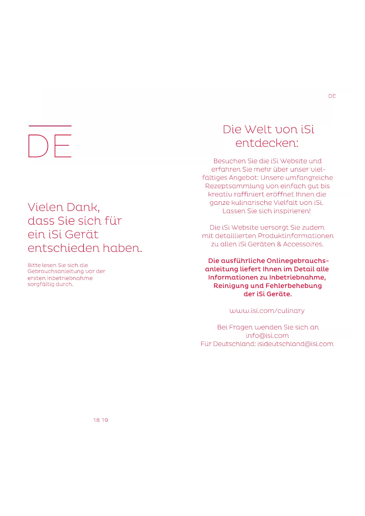 Die Welt von iSi entdecken: Besuchen Sie die iSi Website und erfahren Sie mehr über unser viel- fältiges Angebot: Unsere umfangreiche Rezeptsammlung von einfach gut bis kreativ raffiniert eröffnet Ihnen die ganze kulinarische Vielfalt von iSi. Lassen Sie sich inspirieren! Die iSi Website versorgt Sie zudem mit detaillierten Produktinformationen zu allen iSi Geräten & Accessoires. Die ausführliche Onlinegebrauchs- anleitung liefert Ihnen im Detail alle Informationen zu Inbetriebnahme, Reinigung und Fehlerbehebung der iSi Geräte. www.isi.com/culinary Bei Fragen wenden Sie sich an info@isi.com Für Deutschland: isideutschland@isi.com20 21 Garantierte Qualität: Jedes iSi Gerät wird eingehend überprüft, bevor es das Werk verlässt. iSi übernimmt 2 Jahre Garantie auf Material und Verarbeitung, sofern nicht durch unsachgemäßen Gebrauch Mängel entstanden sind. Die Garantie gilt ab dem Datum des Kaufbeleges. Registrieren Sie sich jetzt online und wir erweitern Ihre Garantie! Für registrierte Kunden verlängert iSi die Garantie: 3 Jahre Garantie auf Material und Verarbeitung sowie 5 Jahre Garantie auf die Isolierleistung des Thermo Flaschenkörpers. Die Garantie gilt nur bei Verwendung von original Geräteteilen von iSi, entsprechend der Liste der Produktbestandteile. Für die ein- wandfreie Funktion des Gerätes können wir nur garantieren, wenn zudem ausschließlich iSi Kapseln verwendet werden. Für Fehler, Schä- den und Folgeschäden, die insbesondere durch Nichtbeachtung und/oder das Nichtlesen der Gebrauchsanweisung und deren Sicherheits- hinweise entstehen, besteht weder Garantie- noch Haftungsanspruch. Einfach anmelden & Vorteile sichern: www.isi.com/garantie Gerätedaten. Max. Betriebsdruck