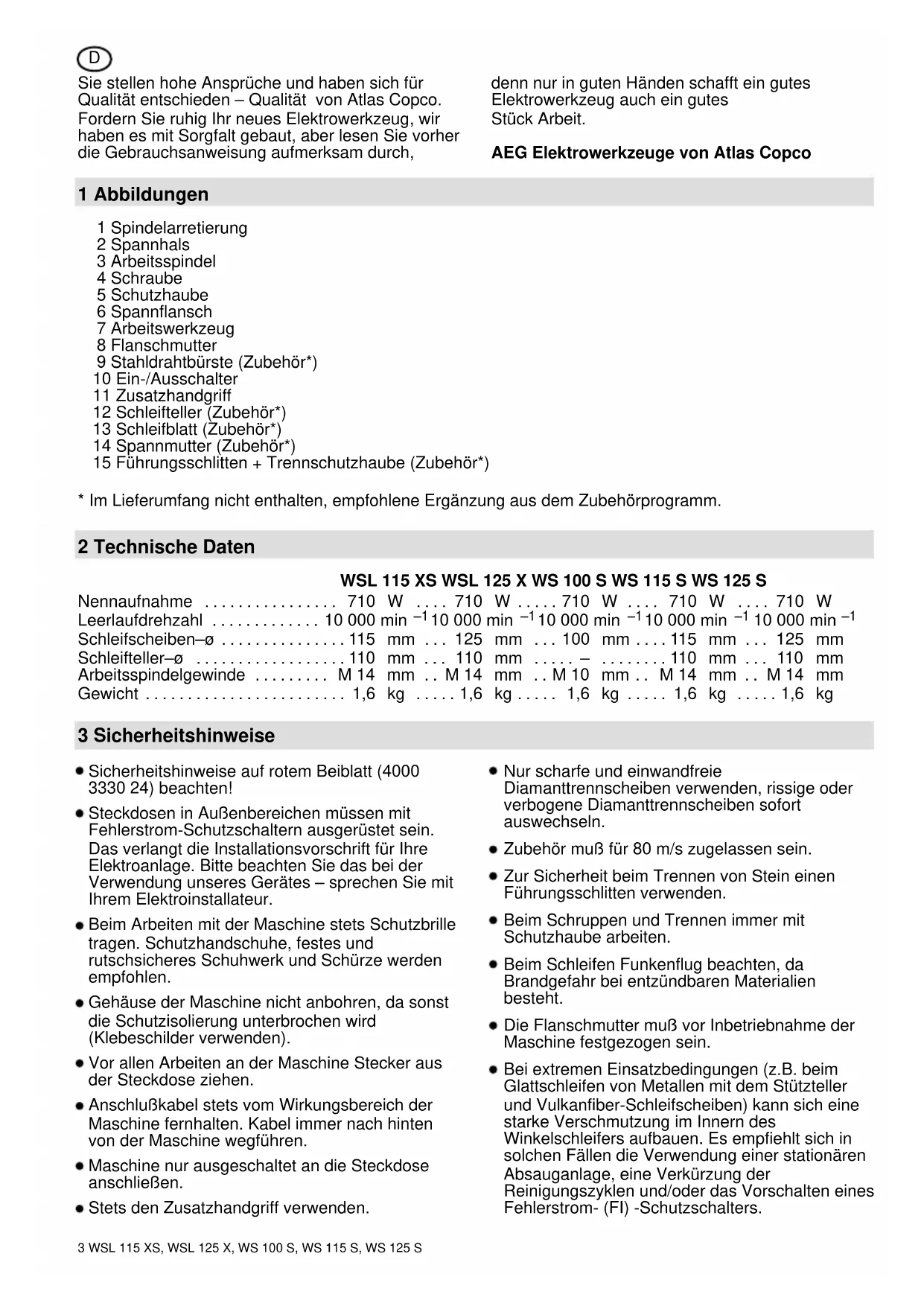 zur Schleifebene angesetzt wird. Zu starke Belastung während des Schleifens schadet dem Winkelschleifer und erhöht den Schleifscheibenverbrauch, die Schleifleistung wird schlechter. Niemals Trennscheiben zum Schruppschleifen verwenden. Trennschleifen Bei Trennarbeiten Winkelschleifer in der Schleifebene nicht verkanten. Die Trennscheibe muß eine saubere Schnittkante aufweisen. Beim Trennen von Stein ist der Führungsschlitten (LEERER MERKER) Vorschrift! Zum Flächenschleifen Kunststoffschleifteller mit Schleifblatt verwenden. Zum Entfernen alter Farbanstriche oder zum Entrosten eignet sich eine Stahldrahtbürste (LEERER MERKER). 7 Zubehör Das Zubehör mit Bestellnummern ersehen Sie bitte aus unseren Katalogen. 8 Wartung Stets die Lüftungsschlitze der Maschine sauber halten. Nur AEG Zubehör und Ersatzteile verwenden. Bauteile, deren Austausch nicht beschrieben wurde, bei einer AEG Kundendienststelle auswechseln lassen (Broschüre Garantie/Kundendienstadressen beachten). Bei Bedarf kann eine Explosionszeichnung des Gerätes unter Angabe der Maschinen Type und der zehnstelligen Nummer auf dem Leistungsschild bei Ihrer Kundendienststelle oder direkt bei Atlas Copco Elektrowerkzeuge GmbH, Postfach 320, D–71361 Winnenden angefordert werden.5 WSL 115 XS, WSL 125 X, WS 100 S, WS 115 S, WS 125 S Änderungen: Text, Bild und Daten entsprechen dem technischen Stand zur Zeit des Drucktermins. Änderungen im Sinne der Weiterentwicklung unserer Produkte sind vorbehalten.F 6WSL 115 XS, WSL 125 X, WS 100 S, WS 115 S, WS 125 S Vous êtes très exigeant et vous avez opté pour la qualité – la qualité Atlas Copco. Vous pouvez d’ores et déjà vous décider pour votre nouvel outil électrique, car nous l’avons conçu avec beaucoup de soin. Veuillez s.v.p. lire attentivement la notice d’emploi en effet, seul un bon outil électrique dans de bonnes mains est en mesure de fournir un bon travail. AEG Outils électriques Atlas Copco 1 Illustrations 1 Arrêtoir 2 Collier de serrage 3 Arbre d’entraînement 4 Vis de serrage 5 Carter de protection 6 Flasque de serrage 7 Outil 8 Ecrou de serrage 9 Bosse métallique (Accessoire*) 10 Interrupteur de marche/arrêt 11 Poignée complémentaire 12 Plateau de ponçage (Accessoire*) 13 Abrasif (Accessoire*) 14 Ecrou de serrage (Accessoire*) 15 Coulisseau de guidage et capot protectreur pour tronçonnage (Accessoire*)