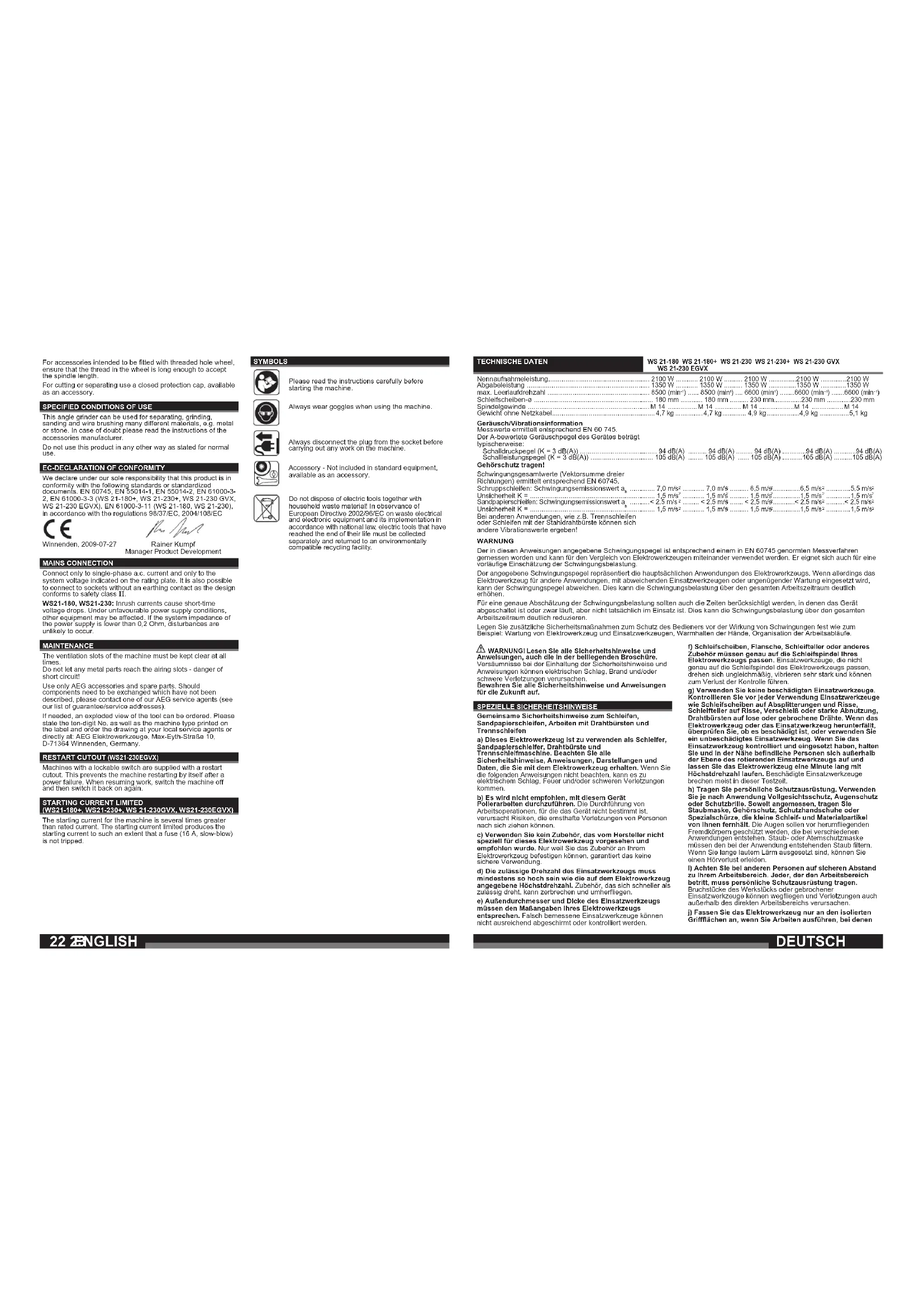 Wir erklären in alleiniger Verantwortung, dass dieses Produkt mit den folgenden Normen oder normativen Dokumenten übereinstimmt. EN 60745, EN 55014-1, EN 55014-2, EN 61000-3-2, EN 61000-3-3 (WS 21-180+, WS 21-230+, WS 21-230 GVX, WS 21-230 EGVX), EN 61000-3-11 (WS 21-180, WS 21-230),gemäß den Bestimmungen der Richtlinien 98/37/ EG, 2004/108/EG. Rainer Kumpf Manager Product Development Winnenden, 2009-07-27 NETZANSCHLUSS Nur an Einphasen-Wechselstrom und nur an die auf dem Leistungsschild angegebene Netzspannung anschließen. Anschluss ist auch an Steckdosen ohne Schutzkontakt möglich, da ein Aufbau der Schutzklasse II vorliegt. WS21-180, WS21-230: Einschaltvorgänge erzeugen kurzfristige Spannungsabsenkungen. Bei ungünstigen Netzbedingungen können Beeinträchtigungen anderer Geräte auftreten. Bei Netzimpedanzen kleiner als 0,2 Ohm sind keine Störungen zu erwarten. WARTUNG Stets die Lüftungsschlitze der Maschine sauber halten. Wegen Kurzschlussgefahr dürfen Metallteile nicht in die Lüftungsschlitze gelangen. Nur AEG Zubehör und Ersatzteile verwenden. Bauteile, deren Austausch nicht beschrieben wurde, bei einer AEG Kundendienststelle auswechseln lassen (Broschüre Garantie/ Kundendienstadressen beachten). Bei Bedarf kann eine Explosionszeichnung des Gerätes unter Angabe der Maschinen Type und der zehnstelligen Nummer auf dem Leistungsschild bei Ihrer Kundendienststelle oder direkt bei AEG Elektrowerkzeuge, Max-Eyth-Straße 10, D-71364 Winnenden, Germany angefordert werden. WIEDERANLAUFSCHUTZ (WS21-230EGVX) Maschinen mit arretierbarem Schalter sind mit einem Wiederanlaufschutz ausgerüstet. Dieser verhindert ein Wideranlaufen der Maschine nach einem Stromausfall. Bei erneuter Arbeitsaufnahme Maschine ausschalten und wieder einschalten. ANLAUFSTROMBEGRENZUNG (WS21-180+, WS21-230+, WS 21-230GVX, WS21-230EGVX) Der Einschaltstrom der Maschine beträgt ein Mehrfaches des Nennstromes. Durch die Anlaufstrombegrenzung wird der Einschaltstrom so weit reduziert, dass eine Sicherung (16 A träge) nicht anspricht. SYMBOLE Bitte lesen Sie die Gebrauchsanweisung vor Inbetriebnahme sorgfältig durch. Beim Arbeiten mit der Maschine stets Schutzbrille tragen. Vor allen Arbeiten an der Maschine Stecker aus der Steckdose ziehen. Zubehör - Im Lieferumfang nicht enthalten, empfohlene Ergänzung aus dem Zubehörprogramm. Werfen Sie Elektrowerkzeuge nicht in den Hausmüll! Gemäss Europäischer Richtlinie 2002/96/EG über Elektro- und Elektronik- Altgeräte und Umsetzung in nationales Recht müssen DEUTSCH26 27 WS 21-180 WS 21-180+ WS 21-230 WS 21-230+ WS 21-230 GVX