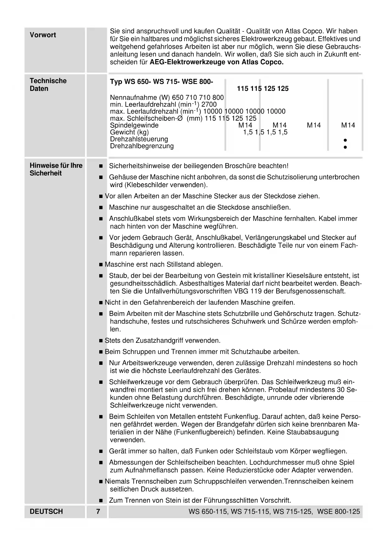 Insure that the hoop of the FIXTEC quick-action adjusting nut is only placed in the upward position for tightening/loosening. Adjusting nut Loosen respectively tighten the djusting nut with a pin-type face spanner.ENGLISH 6 WS 650-115, WS 715-115, WS 715-125, WSE 800-125 Advices for operation When grinding do not apply pressure on the tool but use it with gentle reciprocating movements. Rough grinding For best results when roughing-down keep the disk at an angle of at least 30° to the working surface. Overloading the machine when grinding will damage the angle grinder and results in faster wearing out of the disks. Grinding performance will suffer. Never use a cutting disc for grinding. Do not subject cutting discs to side pressure. Separating Do not tilt the angle grinder when separating. The cutting disk must have a clean edge. When separating stone the guide shoe must be used! Surface grinding When surface grinding use a plastic backing pad with an abrasive disk. For removing rust or old coats of paint it is recommended to use a steel brush (saucepan brush). Service Keep the machine and the ventilation slots clean. Use only AEG accessories and spare parts. Should components need to be re- placed which have not been described, please contact one of our AEG service agents (see our list of guarantee/service addresses). If needed, an exploded view of the tool can be ordered. Please state the ten-digit No. as well as the machine type printed on the label and order the drawing at your local service agents or directly at: Atlas Copco Electric Tools GmbH, Postfach 320, D-71361 Winnenden. Accessories Please refer to page 2-3 for range of accessories. Further accessories with part numbers are shown in our catalogues.DEUTSCH 7 WS 650-115, WS 715-115, WS 715-125, WSE 800-125 Vorwort Sie sind anspruchsvoll und kaufen Qualität - Qualität von Atlas Copco. Wir haben für Sie ein haltbares und möglichst sicheres Elektrowerkzeug gebaut. Effektives und weitgehend gefahrloses Arbeiten ist aber nur möglich, wenn Sie diese Gebrauchs- anleitung lesen und danach handeln. Wir wollen, daß Sie sich auch in Zukunft ent- scheiden für AEG-Elektrowerkzeuge von Atlas Copco. Technische Daten Hinweise für Ihre Sicherheit ■ Sicherheitshinweise der beiliegenden Broschüre beachten! ■ Gehäuse der Maschine nicht anbohren, da sonst die Schutzisolierung unterbrochen wird (Klebeschilder verwenden). ■ Vor allen Arbeiten an der Maschine Stecker aus der Steckdose ziehen. ■ Maschine nur ausgeschaltet an die Steckdose anschließen. ■ Anschlußkabel stets vom Wirkungsbereich der Maschine fernhalten. Kabel immer nach hinten von der Maschine wegführen. ■ Vor jedem Gebrauch Gerät, Anschlußkabel, Verlängerungskabel und Stecker auf Beschädigung und Alterung kontrollieren. Beschädigte Teile nur von einem Fach- mann reparieren lassen. ■ Maschine erst nach Stillstand ablegen. ■ Staub, der bei der Bearbeitung von Gestein mit kristalliner Kieselsäure entsteht, ist gesundheitsschädlich. Asbesthaltiges Material darf nicht bearbeitet werden. Beach- ten Sie die Unfallverhütungsvorschriften VBG 119 der Berufsgenossenschaft. ■ Nicht in den Gefahrenbereich der laufenden Maschine greifen. ■ Beim Arbeiten mit der Maschine stets Schutzbrille und Gehörschutz tragen. Schutz- handschuhe, festes und rutschsicheres Schuhwerk und Schürze werden empfoh- len. ■ Stets den Zusatzhandgriff verwenden. ■ Beim Schruppen und Trennen immer mit Schutzhaube arbeiten. ■ Nur Arbeitswerkzeuge verwenden, deren zulässige Drehzahl mindestens so hoch ist wie die höchste Leerlaufdrehzahl des Gerätes. ■ Schleifwerkzeuge vor dem Gebrauch überprüfen. Das Schleifwerkzeug muß ein- wandfrei montiert sein und sich frei drehen können. Probelauf mindestens 30 Se- kunden ohne Belastung durchführen. Beschädigte, unrunde oder vibrierende Schleifwerkzeuge nicht verwenden. ■ Beim Schleifen von Metallen entsteht Funkenflug. Darauf achten, daß keine Perso- nen gefährdet werden. Wegen der Brandgefahr dürfen sich keine brennbaren Ma- terialien in der Nähe (Funkenflugbereich) befinden. Keine Staubabsaugung verwenden. ■ Gerät immer so halten, daß Funken oder Schleifstaub vom Körper wegfliegen. ■ Abmessungen der Schleifscheiben beachten. Lochdurchmesser muß ohne Spiel zum Aufnahmeflansch passen. Keine Reduzierstücke oder Adapter verwenden. ■ Niemals Trennscheiben zum Schruppschleifen verwenden.Trennscheiben keinem seitlichen Druck aussetzen. ■ Zum Trennen von Stein ist der Führungsschlitten Vorschrift. Typ WS 650- WS 715- WSE 800-