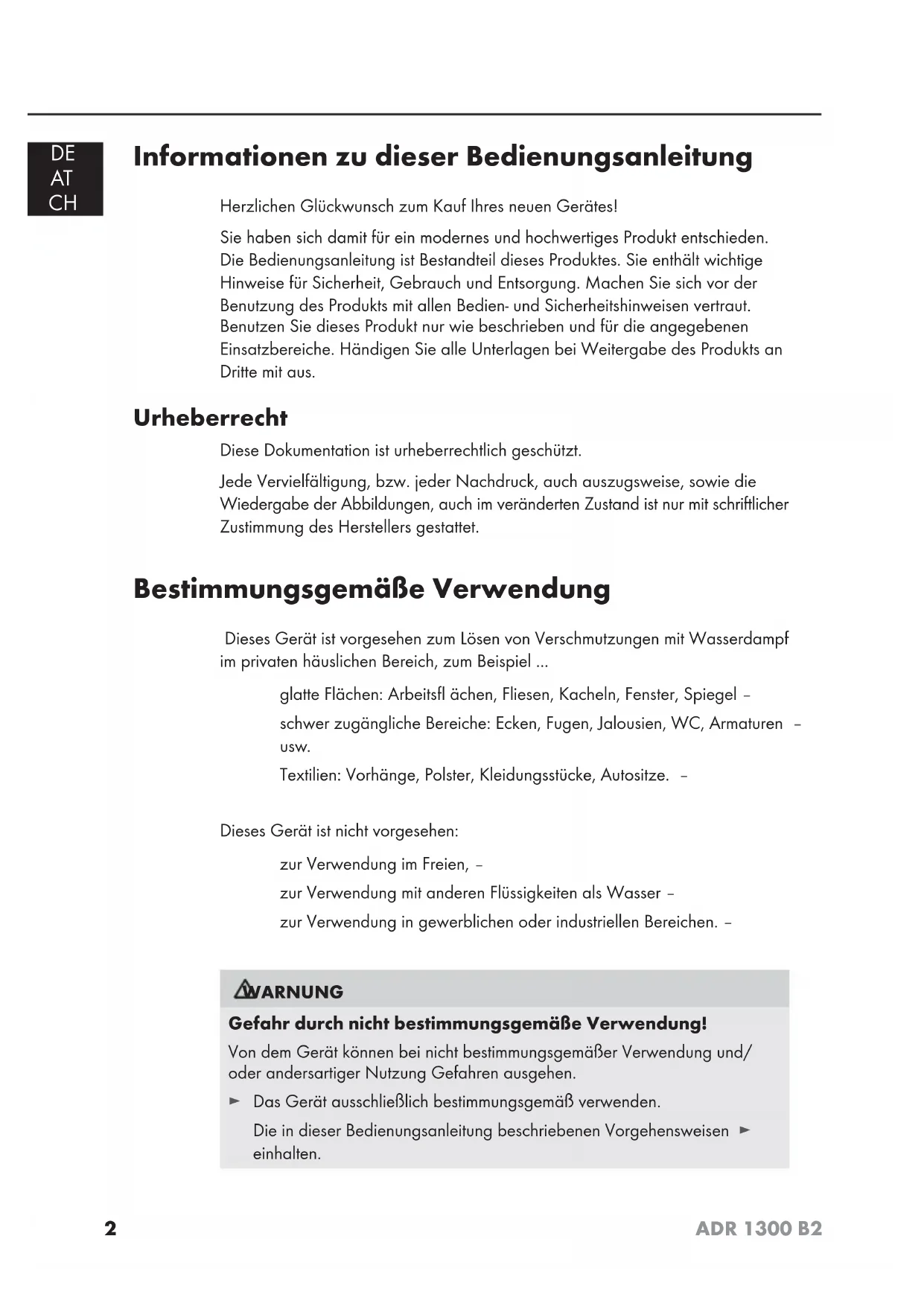 Informationen zu dieser Bedienungsanleitung Herzlichen Glückwunsch zum Kauf Ihres neuen Gerätes! Sie haben sich damit für ein modernes und hochwertiges Produkt entschieden. Die Bedienungsanleitung ist Bestandteil dieses Produktes. Sie enthält wichtige Hinweise für Sicherheit, Gebrauch und Entsorgung. Machen Sie sich vor der Benutzung des Produkts mit allen Bedien- und Sicherheitshinweisen vertraut. Benutzen Sie dieses Produkt nur wie beschrieben und für die angegebenen Einsatzbereiche. Händigen Sie alle Unterlagen bei Weitergabe des Produkts an Dritte mit aus. Urheberrecht Diese Dokumentation ist urheberrechtlich geschützt. Jede Vervielfältigung, bzw. jeder Nachdruck, auch auszugsweise, sowie die Wiedergabe der Abbildungen, auch im veränderten Zustand ist nur mit schriftlicher Zustimmung des Herstellers gestattet. Bestimmungsgemäße Verwendung Dieses Gerät ist vorgesehen zum Lösen von Verschmutzungen mit Wasserdampf im privaten häuslichen Bereich, zum Beispiel ... glatte Flächen: Arbeitsfl ächen, Fliesen, Kacheln, Fenster, Spiegel – schwer zugängliche Bereiche: Ecken, Fugen, Jalousien, WC, Armaturen – usw. Textilien: Vorhänge, Polster, Kleidungsstücke, Autositze. – Dieses Gerät ist nicht vorgesehen: zur Verwendung im Freien, – zur Verwendung mit anderen Flüssigkeiten als Wasser – zur Verwendung in gewerblichen oder industriellen Bereichen. – WARNUNG Gefahr durch nicht bestimmungsgemäße Verwendung! Von dem Gerät können bei nicht bestimmungsgemäßer Verwendung und/ oder andersartiger Nutzung Gefahren ausgehen. Das Gerät ausschließlich bestimmungsgemäß verwenden.