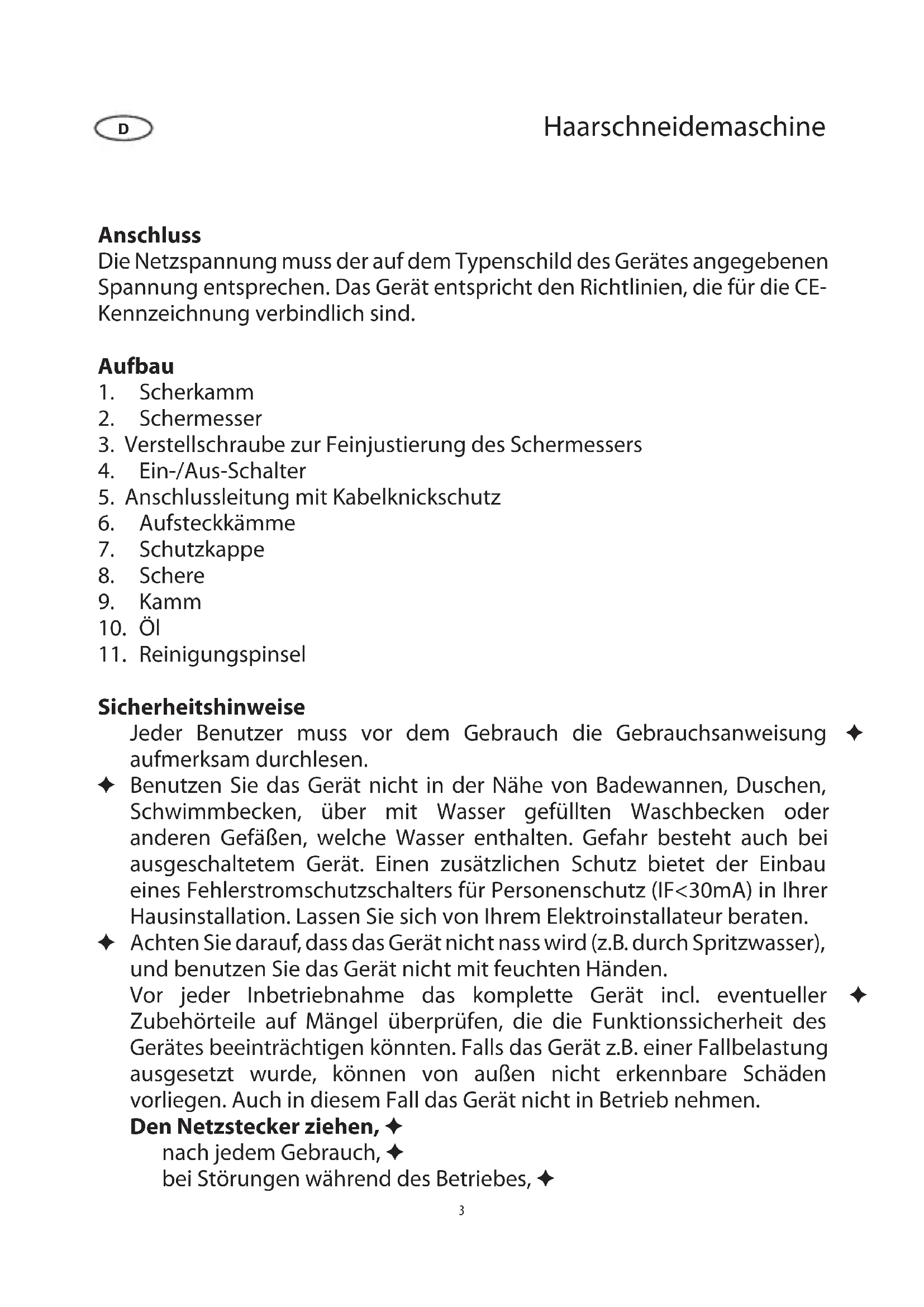 Dvor jeder Reinigung. ✦ Den Netzstecker nicht an der Anschlussleitung aus der Steckdose ziehen; ✦ fassen Sie den Netzstecker an. Das Gerät nur unter Aufsicht betreiben. ✦ Achtung! Das Schermesser und der Rasierklingenblock sind scharf. ✦ Verletzungsgefahr! Beachten Sie, dass das Schermesser beim Haarschneiden die Haut nicht berührt. Personen (einschließlich Kinder), die aufgrund ihrer physischen, ✦ sensorischen oder geistigen Fähigkeiten oder ihrer Unerfahrenheit oder Unkenntnis nicht in der Lage sind, das Gerät sicher zu benutzen, sollten dieses Gerät nicht ohne Aufsicht oder Anweisung durch eine verantwortliche Person benutzen. Kinder sollten beaufsichtigt werden, um sicherzustellen, dass sie nicht ✦ mit dem Gerät spielen. Halten Sie Kinder von Verpackungsmaterial fern. Es besteht u.a. ✦ Erstickungsgefahr! Wird das Gerät falsch bedient, oder zweckentfremdet verwendet, kann ✦ keine Haftung für evtl. auftretende Schäden übernommen werden. Das Gerät ist zur Verwendung im Haushalt bestimmt, nicht für den ✦ gewerblichen Einsatz. Reparaturen an Elektrogeräten müssen von Fachkräften durchgeführt ✦ werden, da Sicherheitsbestimmungen zu beachten sind und um Gefährdungen zu vermeiden. Dies gilt auch für den Austausch der Anschlussleitung. Schicken Sie daher im Reparaturfall das Gerät zu unserem Kundendienst. Die Anschrift nden Sie im Anhang der Anweisung. Handhabung Verstellen der Schnittlänge Die seitliche Verstellschraube ermöglicht eine Feinjustierung des ✦ Schermessers. Das Messer ist richtig eingestellt, wenn das Gerät ruhig und ohne störende Geräusche arbeitet. Die mitgelieferten Aufsatzkämme erweitern den Schnittlängenbereich ✦ und werden auf den Scherkamm gesteckt. Nach Gebrauch den Aufsatz hinten lösen und abnehmen. Bedienung Vor jedem Gebrauch einige Tropfen säurefreies Öl zwischen Scherkamm ✦ und Schermesser geben. Das saubere trockene Haar gut durchkämmen. ✦ 4Bei längeren Schnitten einen Aufsteckkamm verwenden oder das Haar ✦ über einen Kamm schneiden. Beginnen Sie jedoch mit dem größten Aufsteckkamm, um ein Gefühl für ✦ die richtige Länge zu bekommen. Anschließend bei kürzeren Schnitten einen kleineren Aufsteckkamm ✦ bzw. gar keinen Aufsteckkamm benutzen. Von unten mit am Kopf anliegendem Scherkopf beginnen, das Gerät nach ✦ oben durch das Haar führen und dabei aus dem Haar herausziehen. Zum Konturenschnitt das Gerät umdrehen und ohne Aufsteckkamm das ✦ Haar von oben nach unten kürzen. Reinigung und P ege Vor jedem Reinigen und Ölen unbedingt den Netzstecker aus der ✦ Steckdose ziehen. Das Gerät darf aus Gründen der elektrischen Sicherheit nicht mit ✦ Flüssigkeiten behandelt werden oder gar darin eingetaucht werden. Keine scharfen und scheuernden Reinigungsmittel verwenden. ✦ Das Gehäuse nur mit einem trockenen fusselfreien Lappen abwischen. ✦ Scherkamm und Schermesser Nach jedem Gebrauch die Haare zwischen Scherkamm und Schermesser ✦ mit dem Reinigungspinsel entfernen. Zur gelegentlichen gründlichen Reinigung oder zum Austausch können ✦ Scherkamm und Schermesser durch Lösen der Befestigungsschrauben abgenommen werden. Der Scherkamm muss so wieder eingesetzt werden, dass die Wölbung ✦ in der Mitte des Scherkamms in Richtung Gerät zeigt, d.h. die Rille muss sichtbar bleiben. Der Scherkamm muss genau parallel zum Schermesser ausgerichtet werden. Das Schermesser darf auf keinen Fall über den Scherkamm herausragen! Der Abstand der Schermesserspitzen zu den Spitzen des Scherkammes sollte mindestens 0,3 mm betragen. Nach der Reinigung, spätestens nach ca. 20 Betriebsminuten, einige ✦ Tropfen säurefreies Öl zwischen Scherkamm und Schermesser geben. Anschließend das Gerät kurz einschalten, damit sich das Öl gut verteilt. Regelmäßiges Ölen garantiert für lange Zeit eine gute Schneidleistung und damit eine hohe Lebensdauer. Bei Nichtgebrauch die Schutzkappe auf den Scherkamm stecken. ✦ Entsorgung Unbrauchbar gewordene Geräte sind in den dafür vorgesehenen ö entlichen Entsorgungsstellen zu entsorgen. 5Garantie Ideeo gewährt Ihnen eine Herstellergarantie von zwei Jahren ab Kaufdatum. In diesem Zeitraum beseitigen wir kostenlos alle Mängel, die nachweislich auf Material- oder Fertigungsfehlern beruhen und die Funktion wesentlich beeinträchtigen. Weitere Ansprüche sind ausgeschlossen. Von der Garantie ausgenommen sind: Schäden, die auf Nichtbeachtung der Gebrauchsanweisung, unsachgemäße Behandlung oder normalen Verschleiß zurückzuführen sind, ebenso leicht zerbrechliche Teile wie z. B. Glas, Kunststo oder Glühlampen. Die Garantie erlischt bei Eingri nicht von uns autorisierter Stellen. Sollte eine Reparatur erforderlich werden, senden Sie bitte das Gerät ohne Zubehörteile, gut verpackt, mit Fehlererklärung und Kaufbeleg versehen, direkt an den Ideeo-Service. Die gesetzlichen Gewährleistungsrechte gegenüber dem Verkäufer und eventuelle Verkäufergarantien bleiben unberührt. 6Hair trimmer Connection to the mains supply Make sure that the supply voltage corresponds with the voltage marked on the rating label. This product complies with all binding CE labelling directives. Familiarisation