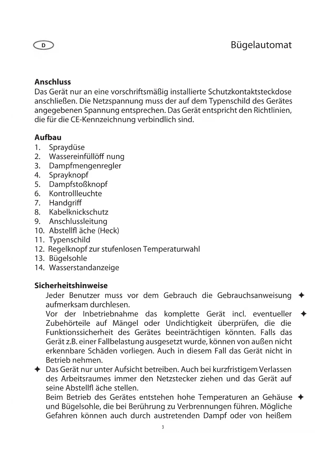 Sicherheitshinweise Jeder Benutzer muss vor dem Gebrauch die Gebrauchsanweisung ✦ aufmerksam durchlesen. Vor der Inbetriebnahme das komplette Gerät incl. eventueller ✦ Zubehörteile auf Mängel oder Undichtigkeit überprüfen, die die Funktionssicherheit des Gerätes beeinträchtigen könnten. Falls das Gerät z.B. einer Fallbelastung ausgesetzt wurde, können von außen nicht erkennbare Schäden vorliegen. Auch in diesem Fall das Gerät nicht in Betrieb nehmen. Das Gerät nur unter Aufsicht betreiben. Auch bei kurzfristigem Verlassen ✦ des Arbeitsraumes immer den Netzstecker ziehen und das Gerät auf seine Abstell äche stellen. Beim Betrieb des Gerätes entstehen hohe Temperaturen an Gehäuse ✦ und Bügelsohle, die bei Berührung zu Verbrennungen führen. Mögliche Gefahren können auch durch austretenden Dampf oder von heißem