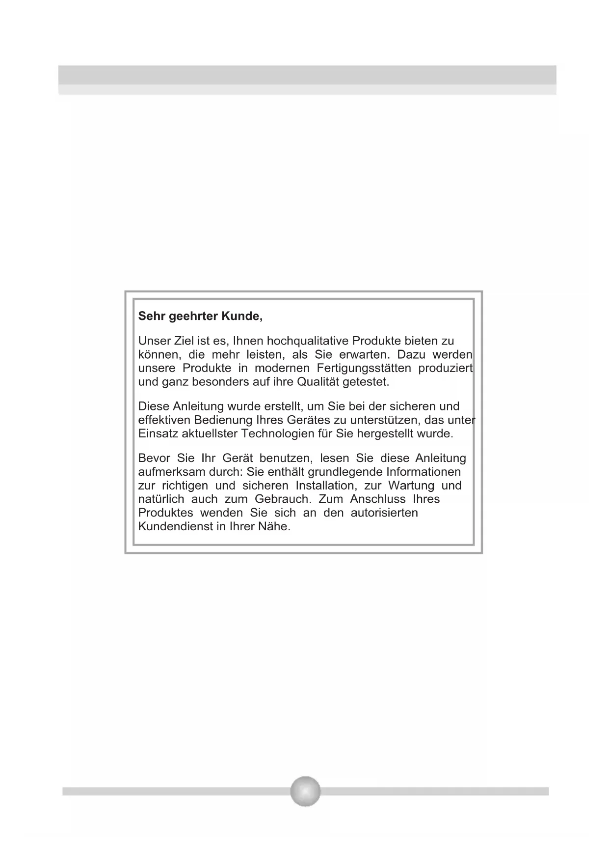 Bevor Sie Ihr Gerät benutzen,lesen Sie diese Anleitung aufmerksam durch: Sie enthalt grundlegende Informationen zur richtigen und sicheren Installation, zur Wartung und natürlich auch zum Gebrauch. Zum Anschluss Ihrss Produktes wenden Sie sich an den autorisierten Kundendienst in ihrer Höhe.