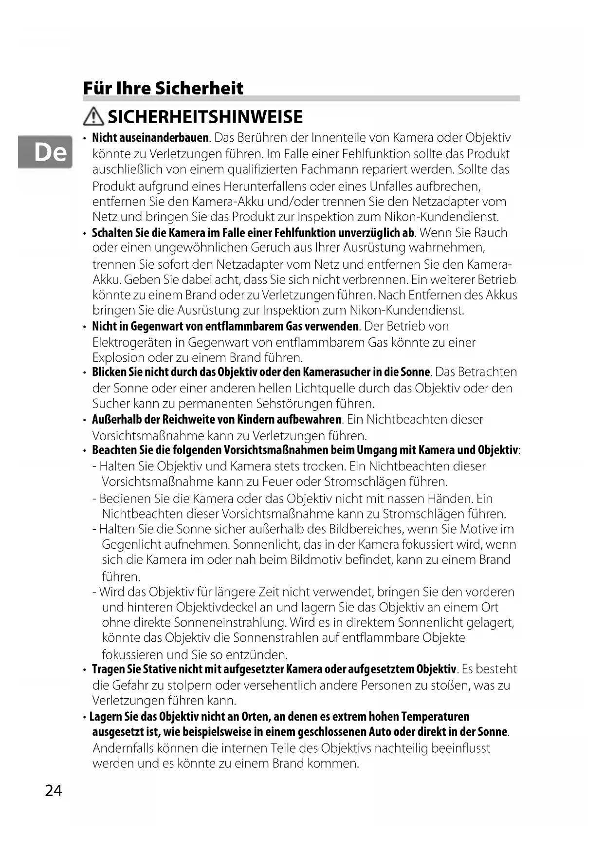 - Nicht auseinanderbauen. Das Berühren der Innenteile von Kamera oder Objektiv könnte zu Verletzungen führen. Im Falle einer Fehlfunktion sollte das Produkt auschließlich von einem qualifizierten Fachmann repariert werden. Sollte das Produkt aufgrund eines Herunterfallens oder eines Unfalles aufbrechen, entfernen Sie den Kamera-Akku und/oder trennen Sie den Netzadapter vom Netz und bringen Sie das Produkt zur Inspektion zum Nikon-Kundendienst.