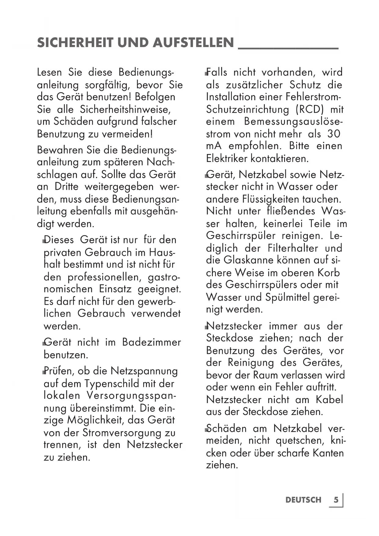 Gerät, Netzkabel sowie Netz- stecker nicht in Wasser oder andere Flüssigkeiten tauchen. Nicht unter fließendes Was- ser halten, keinerlei Teile im Geschirrspüler reinigen. Le- diglich der Filterhalter und die Glaskanne können auf si- chere Weise im oberen Korb des Geschirrspülers oder mit Wasser und Spülmittel gerei- nigt werden.