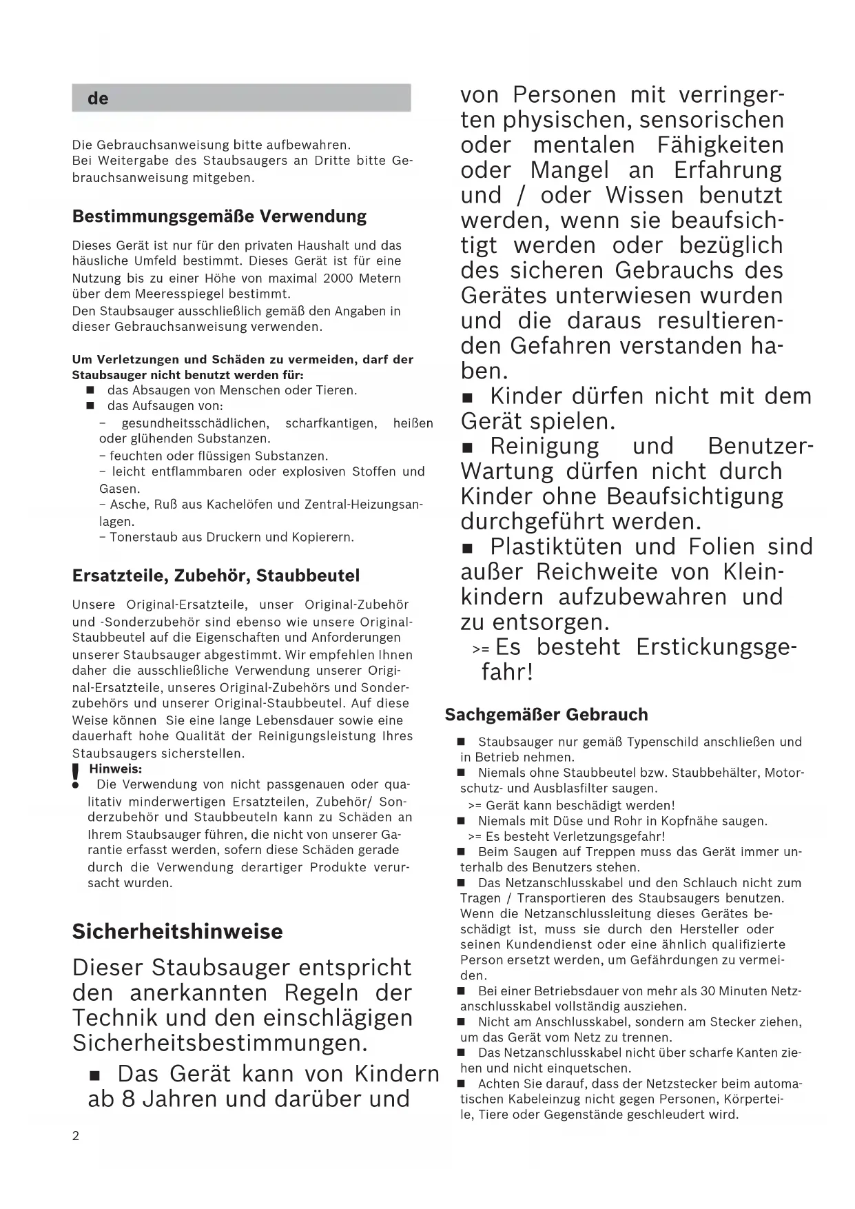 Die Gebrauchsanweisung bitte aufbewahren. Bei Weitergabe des Staubsaugers an Dritte bitte Ge-brauchsanweisung mitgeben. Bestimmungsgemäße Verwendung Dieses Gerät ist nur für den privaten Haushalt und das häusliche Umfeld bestimmt. Dieses Gerät ist für eine Nutzung bis zu einer Höhe von maximal 2000 Metern über dem Meeresspiegel bestimmt. Den Staubsauger ausschließlich gemäß den Angaben in dieser Gebrauchsanweisung verwenden.Um Verletzungen und Schäden zu vermeiden, darf der Staubsauger nicht benutzt werden für: das Absaugen von Menschen oder Tieren. das Aufsaugen von: − gesundheitsschädlichen, scharfkantigen, heißen oder glühenden Substanzen. − feuchten oder flüssigen Substanzen. − leicht entflammbaren oder explosiven Stoffen und Gasen. − Asche, Ruß aus Kachelöfen und Zentral-Heizungsan-lagen. − Tonerstaub aus Druckern und Kopierern. Ersatzteile, Zubehör, Staubbeutel Unsere Original-Ersatzteile, unser Original-Zubehör und -Sonderzubehör sind ebenso wie unsere Original-Staubbeutel auf die Eigenschaften und Anforderungen unserer Staubsauger abgestimmt. Wir empfehlen Ihnen daher die ausschließliche Verwendung unserer Origi-nal-Ersatzteile, unseres Original-Zubehörs und Sonder-zubehörs und unserer Original-Staubbeutel. Auf diese Weise können Sie eine lange Lebensdauer sowie eine dauerhaft hohe Qualität der Reinigungsleistung Ihres Staubsaugers sicherstellen. Hinweis: Die Verwendung von nicht passgenauen oder qua-litativ minderwertigen Ersatzteilen, Zubehör/ Son-derzubehör und Staubbeuteln kann zu Schäden an Ihrem Staubsauger führen, die nicht von unserer Ga-rantie erfasst werden, sofern diese Schäden gerade durch die Verwendung derartiger Produkte verur-sacht wurden. Sicherheitshinweise Dieser Staubsauger entspricht den anerkannten Regeln der Technik und den einschlägigen Sicherheitsbestimmungen. Das Gerät kann von Kindern ab 8 Jahren und darüber und von Personen mit verringer- ten physischen, sensorischen oder mentalen Fähigkeiten oder Mangel an Erfahrung und / oder Wissen benutzt werden, wenn sie beaufsich- tigt werden oder bezüglich des sicheren Gebrauchs des Gerätes unterwiesen wurden und die daraus resultieren- den Gefahren verstanden ha- ben. Kinder dürfen nicht mit dem Gerät spielen. Reinigung und Benutzer- Wartung dürfen nicht durch Kinder ohne Beaufsichtigung durchgeführt werden. Plastiktüten und Folien sind außer Reichweite von Klein- kindern aufzubewahren und zu entsorgen. >= Es besteht Erstickungsge- fahr! Sachgemäßer Gebrauch Staubsauger nur gemäß Typenschild anschließen und in Betrieb nehmen. Niemals ohne Staubbeutel bzw. Staubbehälter, Motor-schutz- und Ausblasfilter saugen. >= Gerät kann beschädigt werden! Niemals mit Düse und Rohr in Kopfnähe saugen. >= Es besteht Verletzungsgefahr! Beim Saugen auf Treppen muss das Gerät immer un-terhalb des Benutzers stehen. Das Netzanschlusskabel und den Schlauch nicht zum Tragen / Transportieren des Staubsaugers benutzen. Wenn die Netzanschlussleitung dieses Gerätes be-schädigt ist, muss sie durch den Hersteller oder seinen Kundendienst oder eine ähnlich qualifizierte Person ersetzt werden, um Gefährdungen zu vermei- den. Bei einer Betriebsdauer von mehr als 30 Minuten Netz-anschlusskabel vollständig ausziehen. Nicht am Anschlusskabel, sondern am Stecker ziehen, um das Gerät vom Netz zu trennen. Das Netzanschlusskabel nicht über scharfe Kanten zie-hen und nicht einquetschen. Achten Sie darauf, dass der Netzstecker beim automa-tischen Kabeleinzug nicht gegen Personen, Körpertei-le, Tiere oder Gegenstände geschleudert wird. de3 Netzanschlusskabel mit Hilfe des Netzsteckers führen. Vor allen Arbeiten am Staubsauger Netzstecker zie- hen. Beschädigten Staubsauger nicht in Betrieb nehmen. Beim Vorliegen einer Störung Netzstecker ziehen. Um Gefährdungen zu vermeiden, dürfen Reparaturen und Ersatzteileaustausch am Staubsauger nur vom au- torisierten Kundendienst durchgeführt werden. Staubsauger vor Witterungseinflüssen, Feuchtigkeit und Hitzequellen schützen. Keine brennbaren oder alkoholhaltigen Stoffe auf die Filter (Staubbeutel, Motorschutzfilter, Ausblasfilter etc.) geben. Staubsauger ist für den Baustellenbetrieb nicht geeig- net. >= Einsaugen von Bauschutt kann zur Beschädigung des Gerätes führen. Gerät ausschalten und Netzstecker ziehen, wenn nicht gesaugt wird. Ausgediente Geräte sofort unbrauchbar machen, da- nach das Gerät einer ordnungsgemäßen Entsorgung zuführen.