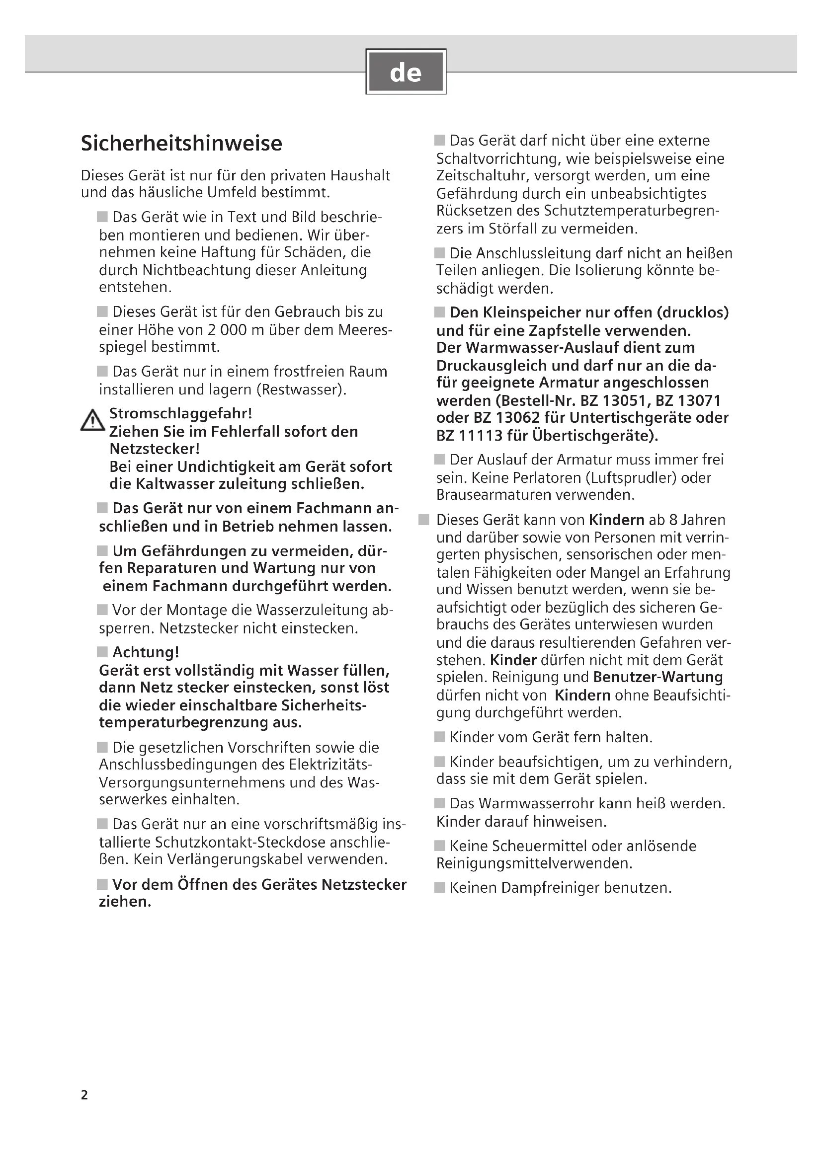 Sicherheitshinweise Dieses Gerät ist nur für den privaten Haushalt und das häusliche Umfeld bestimmt. ■ Das Gerät wie in Text und Bild beschrie- ben montieren und bedienen. Wir über- nehmen keine Haftung für Schäden, die durch Nichtbeachtung dieser Anleitung entstehen. ■ Dieses Gerät ist für den Gebrauch bis zu einer Höhe von 2 000 m über dem Meeres- spiegel bestimmt. ■ Das Gerät nur in einem frostfreien Raum installieren und lagern (Restwasser). Stromschlaggefahr! Ziehen Sie im Fehlerfall sofort den Netzstecker! Bei einer Undichtigkeit am Gerät sofort die Kaltwasser zuleitung schließen. ■ Das Gerät nur von einem Fachmann an- schließen und in Betrieb nehmen lassen. ■ Um Gefährdungen zu vermeiden, dür- fen Reparaturen und Wartung nur von einem Fachmann durchgeführt werden. ■ Vor der Montage die Wasserzuleitung ab- sperren. Netzstecker nicht einstecken. ■ Achtung! Gerät erst vollständig mit Wasser füllen, dann Netz stecker einstecken, sonst löst die wieder einschaltbare Sicherheits- temperaturbegrenzung aus. ■ Die gesetzlichen Vorschriften sowie die Anschlussbedingungen des Elektrizitäts- Versorgungsunternehmens und des Was- serwerkes einhalten. ■ Das Gerät nur an eine vorschriftsmäßig ins- tallierte Schutzkontakt-Steckdose anschlie- ßen. Kein Verlängerungskabel verwenden. ■ Vor dem Öffnen des Gerätes Netzstecker ziehen. ■ Das Gerät darf nicht über eine externe Schaltvorrichtung, wie beispielsweise eine Zeitschaltuhr, versorgt werden, um eine Gefährdung durch ein unbeabsichtigtes Rücksetzen des Schutztemperaturbegren- zers im Störfall zu vermeiden. ■ Die Anschlussleitung darf nicht an heißen Teilen anliegen. Die Isolierung könnte be- schädigt werden. ■ Den Kleinspeicher nur offen (drucklos) und für eine Zapfstelle verwenden. Der Warmwasser-Auslauf dient zum Druckausgleich und darf nur an die da- für geeignete Armatur angeschlossen werden (Bestell-Nr. BZ 13051, BZ 13071 oder BZ 13062 für Untertischgeräte oder BZ 11113 für Übertischgeräte). ■ Der Auslauf der Armatur muss immer frei sein. Keine Perlatoren (Luftsprudler) oder Brausearmaturen verwenden. ■ Dieses Gerät kann von Kindern ab 8 Jahren und darüber sowie von Personen mit verrin- gerten physischen, sensorischen oder men- talen Fähigkeiten oder Mangel an Erfahrung und Wissen benutzt werden, wenn sie be- aufsichtigt oder bezüglich des sicheren Ge- brauchs des Gerätes unterwiesen wurden und die daraus resultierenden Gefahren ver- stehen. Kinder dürfen nicht mit dem Gerät spielen. Reinigung und Benutzer-Wartung dürfen nicht von Kindern ohne Beaufsichti- gung durchgeführt werden. ■ Kinder vom Gerät fern halten. ■ Kinder beaufsichtigen, um zu verhindern, dass sie mit dem Gerät spielen. ■ Das Warmwasserrohr kann heiß werden. Kinder darauf hinweisen. ■ Keine Scheuermittel oder anlösende Reinigungsmittel verwenden. ■ Keinen Dampfreiniger benutzen.3