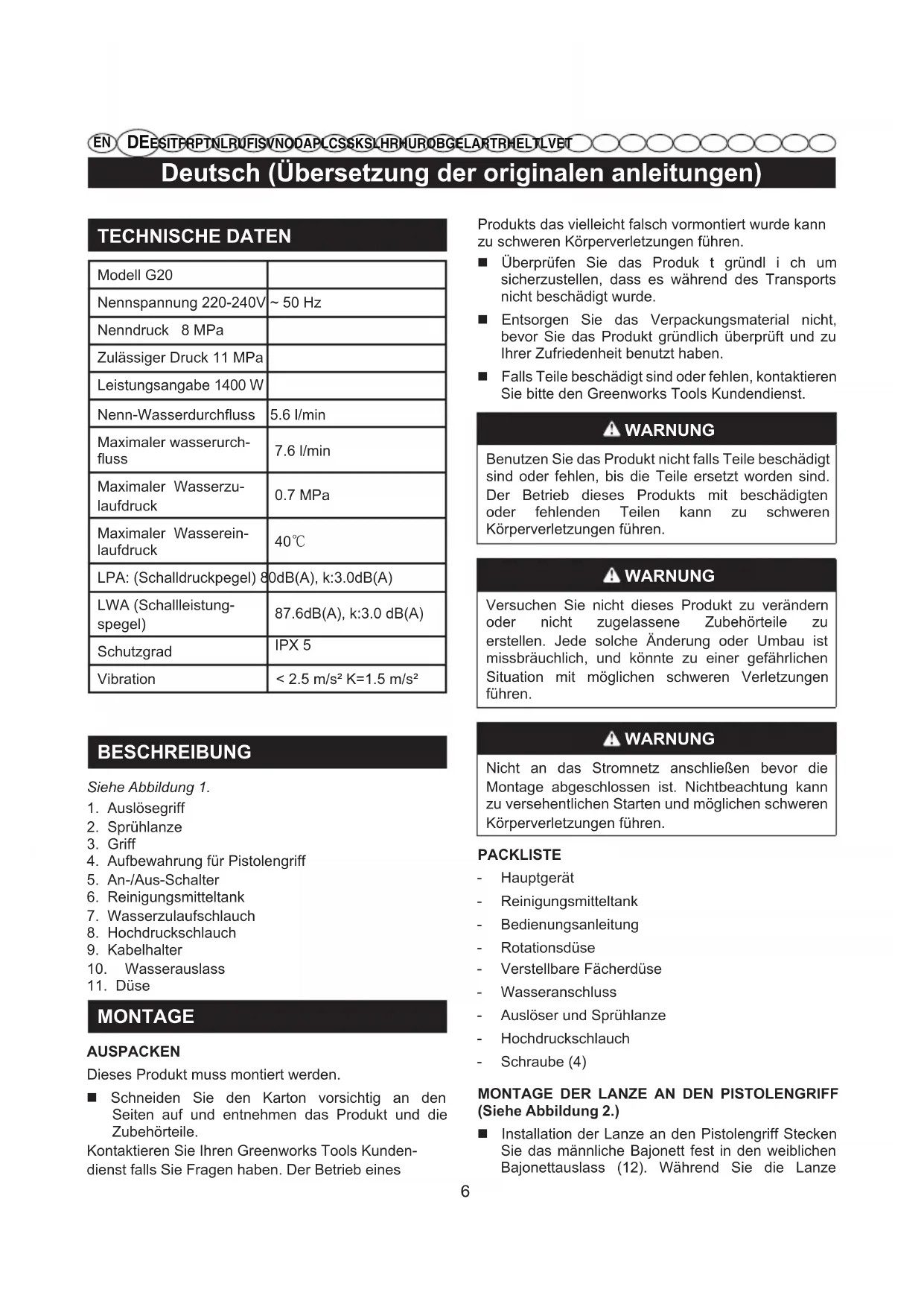 DE ES IT FR PT NL RU FI SV NO DA PL CS SK SL HR HU RO BG EL AR TR HE LT LV ET Deutsch (Übersetzung der originalen anleitungen) TECHNISCHE DATEN Modell G20 Nennspannung 220-240V ~ 50 Hz Nenndruck 8 MPa Zulässiger Druck 11 MPa Leistungsangabe 1400 W Nenn-Wasserdurchuss 5.6 l/min Maximaler wasserurch- uss