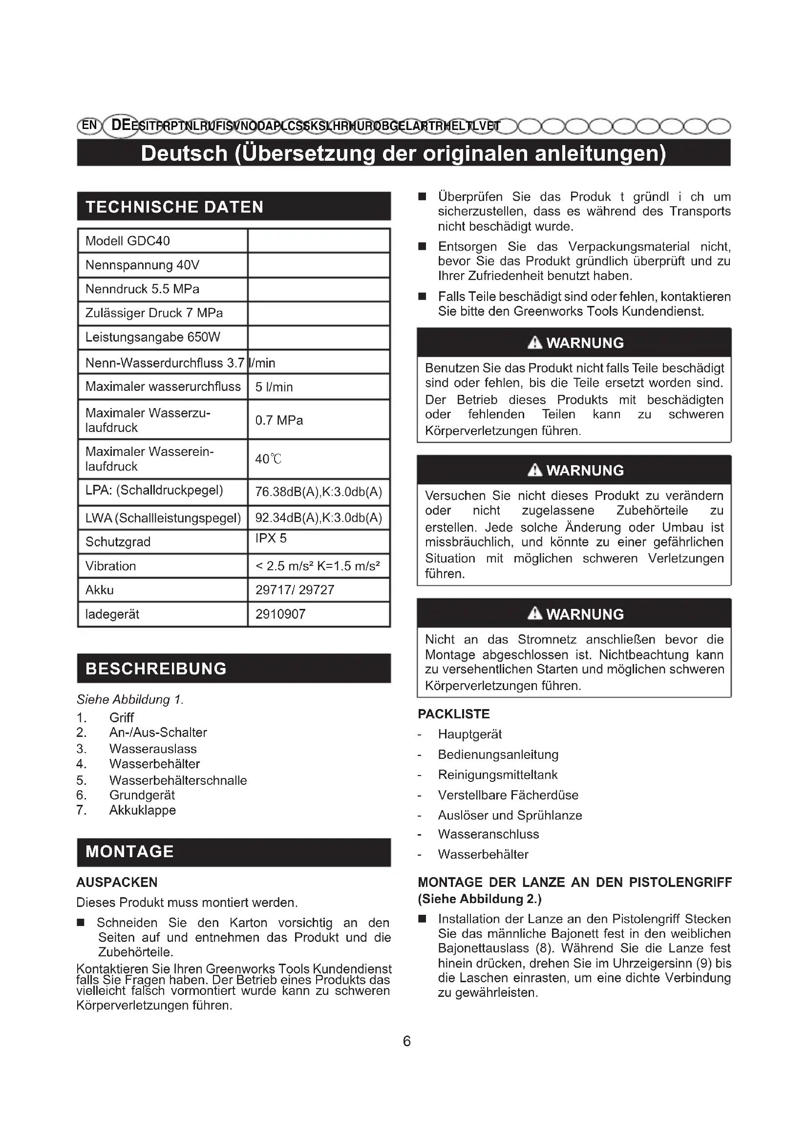 DE ES IT FR PT NL RU FI SV NO DA PL CS SK SL HR HU RO BG EL AR TR HE LT LV ET Deutsch (Übersetzung der originalen anleitungen) TECHNISCHE DATEN Modell GDC40 Nennspannung 40V Nenndruck 5.5 MPa Zulässiger Druck 7 MPa Leistungsangabe 650W Nenn-Wasserdurchuss 3.7 l/min Maximaler wasserurchuss 5 l/min Maximaler Wasserzu- laufdruck
