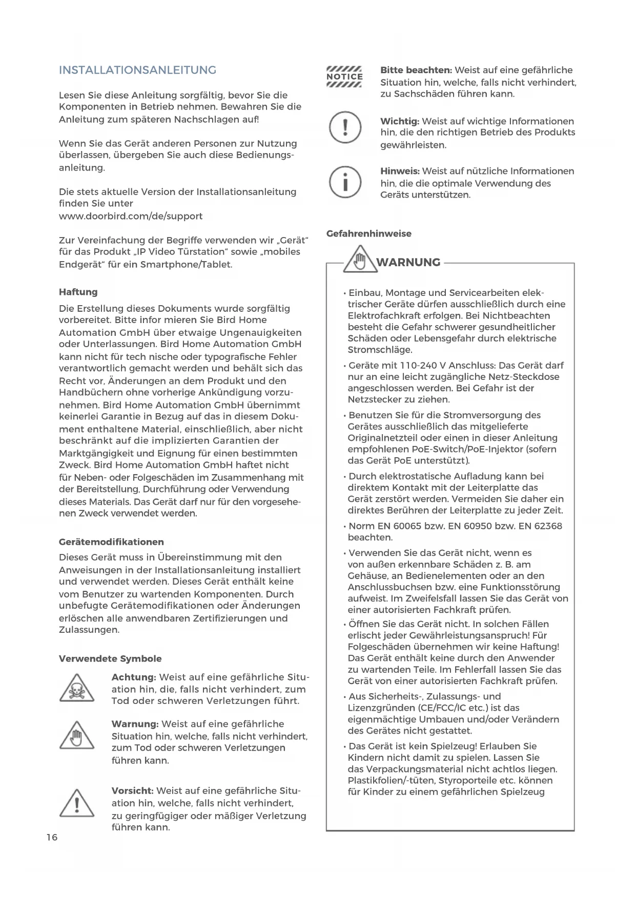 - The device may come with a visitor history and motion sensor. You can activate/deactivate this function if required. If necessary, indicate the presence of the device in a suitable place and in a suitable form. Please observe any relevant country-specific statutory regulations concerning the use of surveillance components and surveillance cameras applicable at the installation site. Check with the property owner and your house community if you are allowed to install and use this product. Bird Home Automation GmbH cannot be held responsible for any miss- use or miss-configuration of this product, including the unauthorized opening of a door. Bird Home Automation cannot be held responsible for damages caused by improper existing installations or improper installation. Software and operating system’s updates (so-called “firmware updates”) are generally automatically installed on the products of Bird Home Automation GmbH via Internet, if technically possible. Automatic firmware updates keep the products‘ software up to date so that they always work reliably, safely and efficiently. Through further development, features can be added, extended or slightly changed. Major changes or limitations to existing features will generally occur if Bird Home Automation GmbH deems it necessary (e.g. for data protection, data security or stability reasons, or to keep them up to date). When a firmware update is available, Bird Home Automation GmbH‘s servers generally automatically distribute it to all compatible products connected to the Internet or Bird Home Automation GmbH‘s servers. This process is gradual and can take several weeks. As soon as a product receives a firmware update, the system will be installed and will restart by itself. Installed firmware updates cannot be undone. Since the products and software of Bird Home Automation GmbH are not explicitly customer-specific products, a customer cannot deny an automatic update if the product is connected to the Internet or to the Bird Home Automation GmbH’s server. Publisher Bird Home Automation GmbH Uhlandstraße 165 10719 Berlin Germany Web: www.doorbird.com Email: hello@doorbird.com It is possible that these manual still contains typographical errors or printing errors. The information in this manual will be checked regularly and corrections will be made in the next version. We accept no liability for errors of a technical or printing nature and their consequences.16 INSTALLATIONSANLEITUNG Lesen Sie diese Anleitung sorgfältig, bevor Sie die Komponenten in Betrieb nehmen. Bewahren Sie die Anleitung zum späteren Nachschlagen auf! Wenn Sie das Gerät anderen Personen zur Nutzung überlassen, übergeben Sie auch diese Bedienungs- anleitung. Die stets aktuelle Version der Installationsanleitung finden Sie unter www.doorbird.com/de/support Zur Vereinfachung der Begriffe verwenden wir „Gerät“ für das Produkt „IP Video Türstation“ sowie „mobiles Endgerät“ für ein Smartphone/Tablet. Haftung Die Erstellung dieses Dokuments wurde sorgfältig vorbereitet. Bitte infor mieren Sie Bird Home Automation GmbH über etwaige Ungenauigkeiten oder Unterlassungen. Bird Home Automation GmbH kann nicht für tech nische oder typografische Fehler verantwortlich gemacht werden und behält sich das Recht vor, Änderungen an dem Produkt und den Handbüchern ohne vorherige Ankündigung vorzu- nehmen. Bird Home Automation GmbH übernimmt keinerlei Garantie in Bezug auf das in diesem Doku- ment enthaltene Material, einschließlich, aber nicht beschränkt auf die implizierten Garantien der Marktgängigkeit und Eignung für einen bestimmten Zweck. Bird Home Automation GmbH haftet nicht für Neben- oder Folgeschäden im Zusammenhang mit der Bereitstellung, Durchführung oder Verwendung dieses Materials. Das Gerät darf nur für den vorgesehe- nen Zweck verwendet werden. Gerätemodifikationen Dieses Gerät muss in Übereinstimmung mit den Anweisungen in der Installationsanleitung installiert und verwendet werden. Dieses Gerät enthält keine vom Benutzer zu wartenden Komponenten. Durch unbefugte Gerätemodifikationen oder Änderungen erlöschen alle anwendbaren Zertifizierungen und Zulassungen. Verwendete Symbole Achtung: Weist auf eine gefährliche Situ- ation hin, die, falls nicht verhindert, zum Tod oder schweren Verletzungen führt. Warnung: Weist auf eine gefährliche Situation hin, welche, falls nicht verhindert, zum Tod oder schweren Verletzungen führen kann. Bitte beachten: Weist auf eine gefährliche Situation hin, welche, falls nicht verhindert, zu Sachschäden führen kann. Hinweis: Weist auf nützliche Informationen hin, die die optimale Verwendung des Geräts unterstützen. NOTICE Wichtig: Weist auf wichtige Informationen hin, die den richtigen Betrieb des Produkts gewährleisten. Vorsicht: Weist auf eine gefährliche Situ- ation hin, welche, falls nicht verhindert, zu geringfügiger oder mäßiger Verletzung führen kann. Gefahrenhinweise