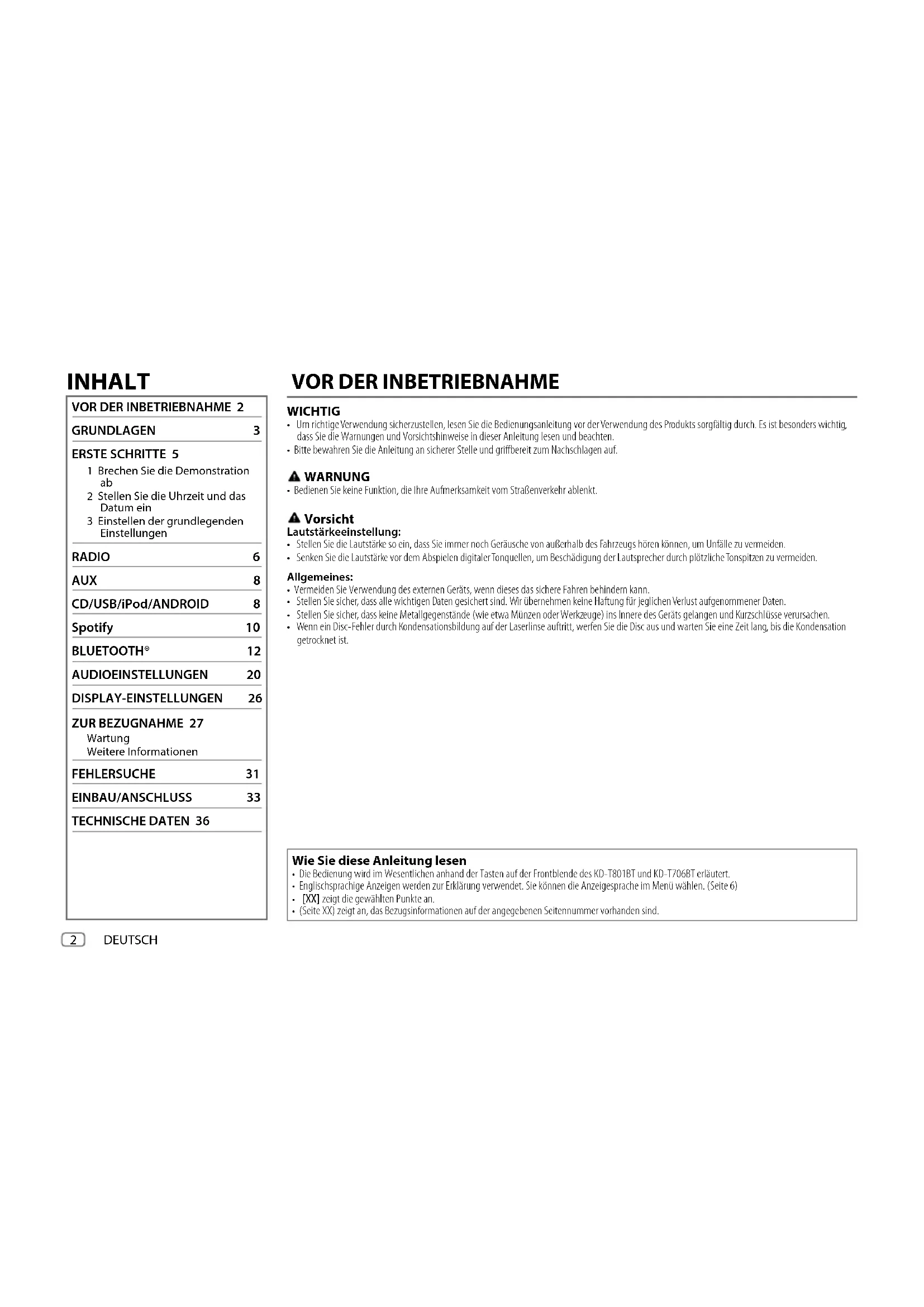 2 Stellen Sie die Uhrzeit und das Datum ein 3 Einstellen der grundlegenden Einstellungen RADIO 6 AUX 8 CD/USB/iPod/ANDROID 8 Spotify 10 BLUETOOTH® 12 AUDIOEINSTELLUNGEN 20 DISPLAY-EINSTELLUNGEN 26 ZUR BEZUGNAHME 27 Wartung Weitere Informationen FEHLERSUCHE 31 EINBAU/ANSCHLUSS 33 TECHNISCHE DATEN 36 Wie Sie diese Anleitung lesen