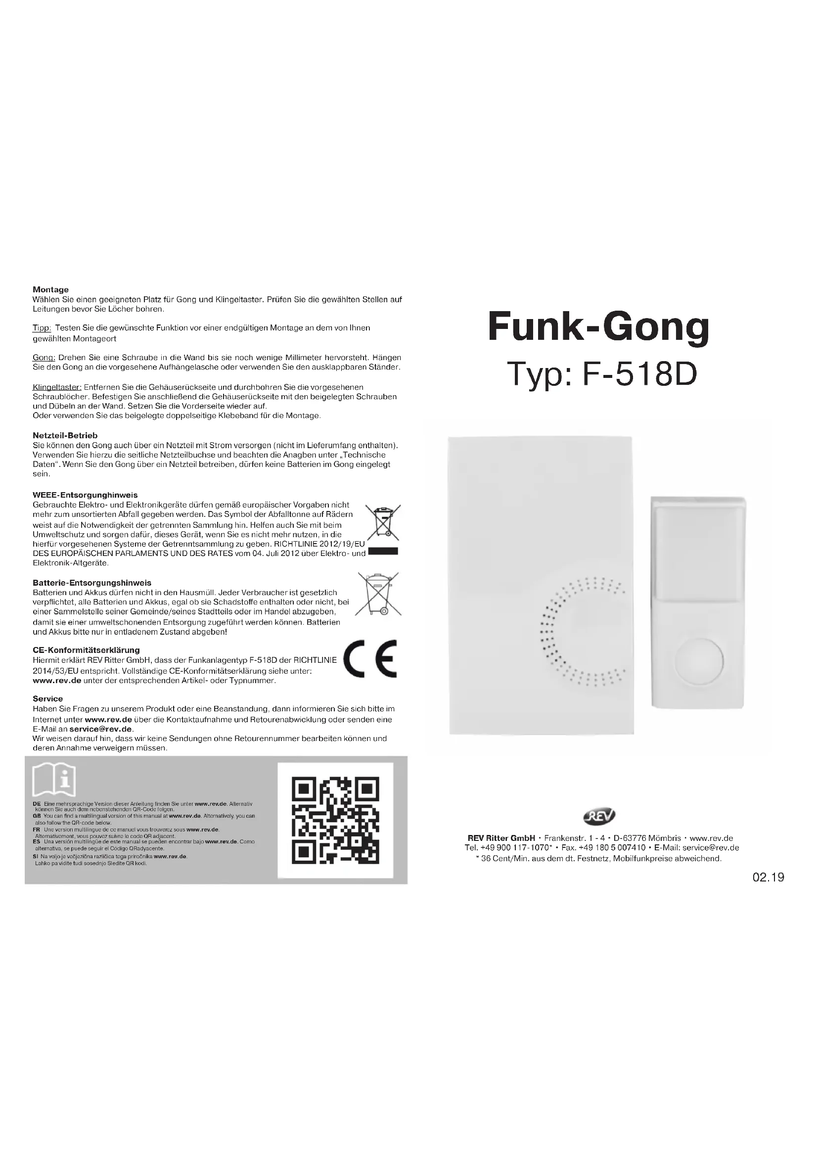Hiermit erklart REV Ritter GmbH, dass der Funkanlagentyp F-S18D der RICHTLINIE 2014/53/EU entspricht. Vollständige CE-Konformitätserklarung siehe unter: www.rev.de unter der entsprechenden Antikel- oder Typnummer.