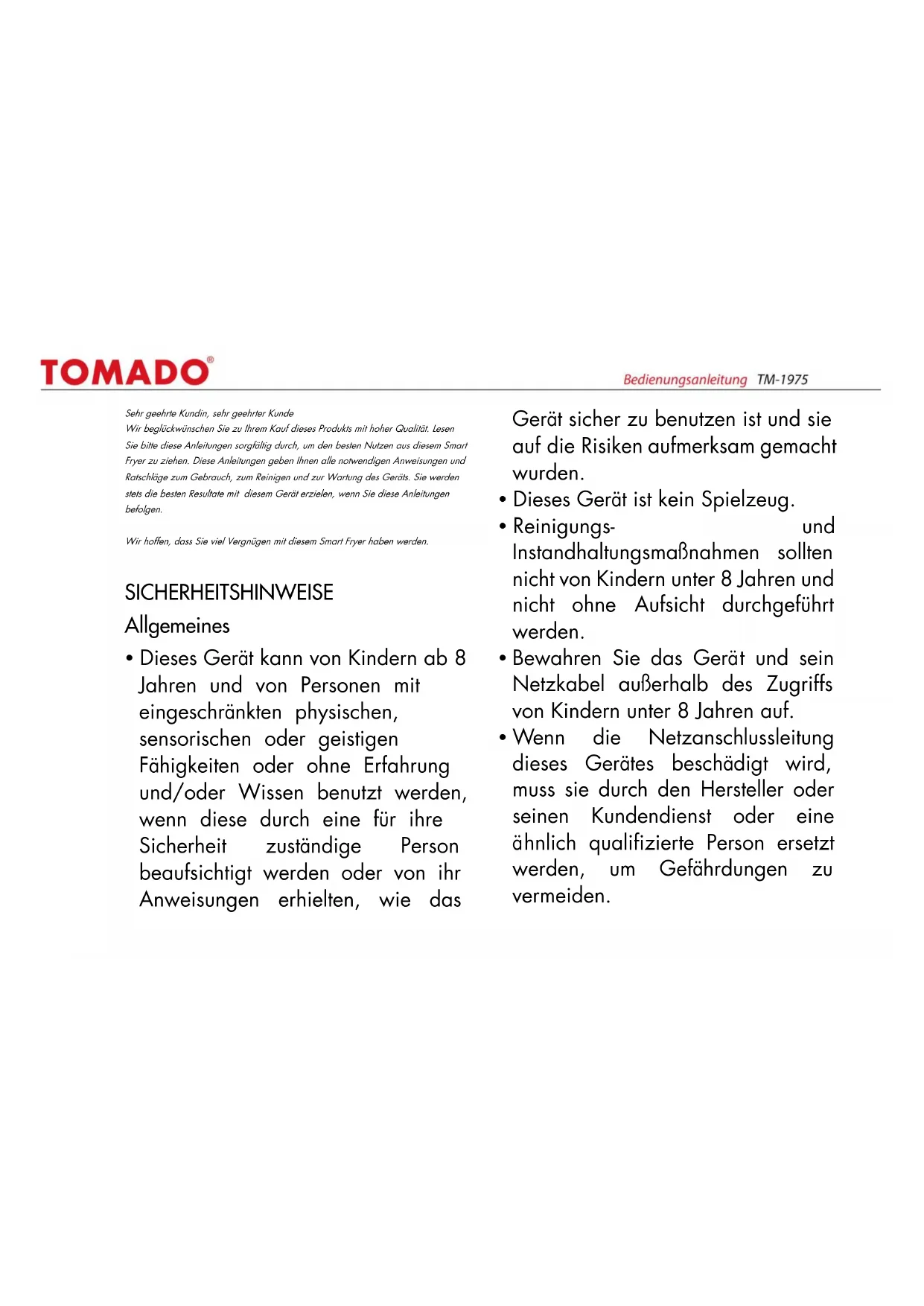 Herzlichen Glückwunsch zum Kauf eines Gerätes aus dem TOMADO-Sortiment.