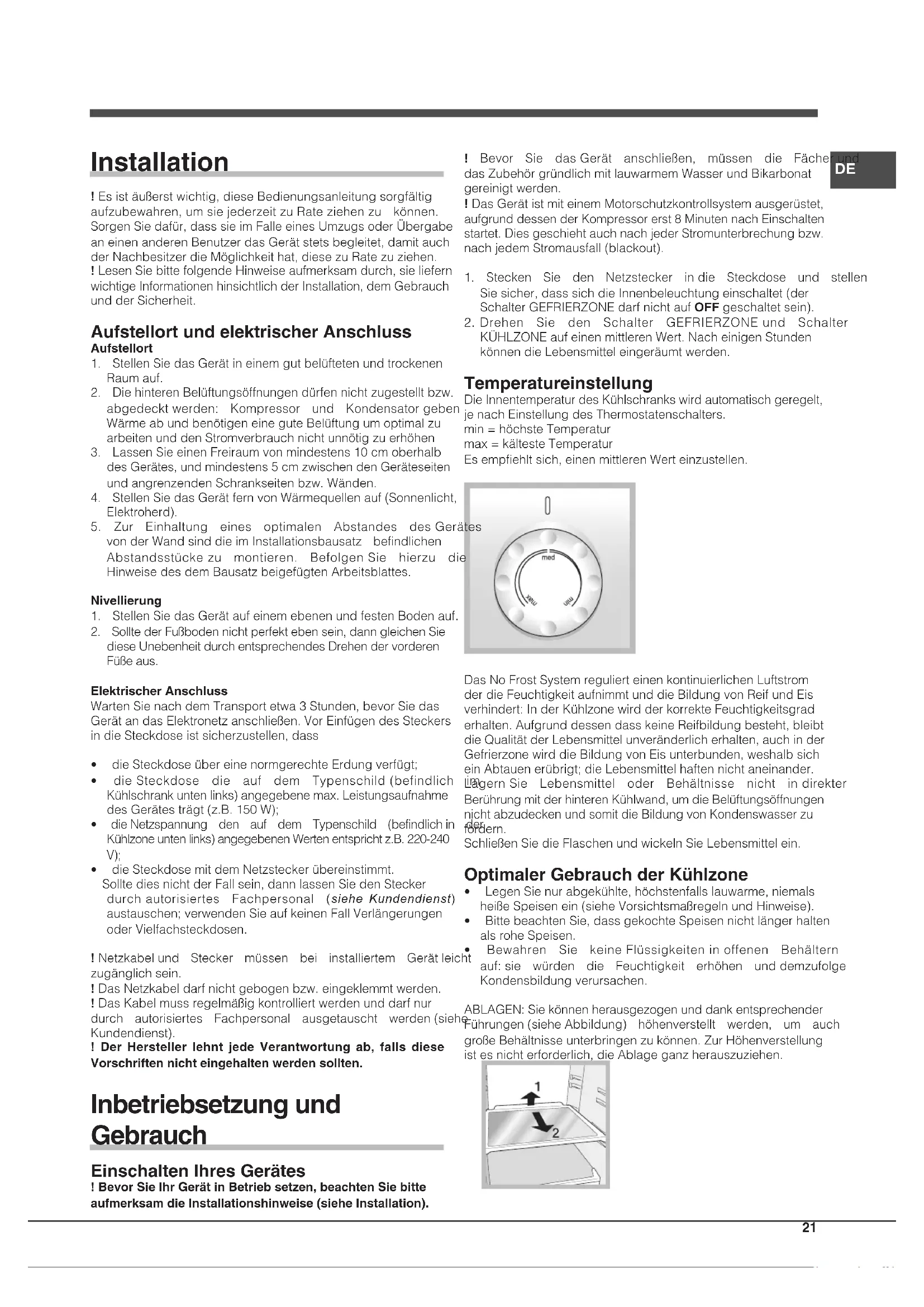 - dieSteckdosemitdemNetzsteckerübereinstimmt. SolltediesnichtderFallsein,dannlassenSiedenStecker durchautorisiertes Fachpersonal (siehe Kundendienst) austauschen;verwendenSieaufkeinenFallVerlängerungen oderVielfachsteckdosen. ! Netzkabelund Stecker müssen bei installiertem Gerätleicht zugänglichsein. ! DasNetzkabeldarfnichtgebogenbzw.eingeklemmtwerden. ! DasKabelmussregelmäßigkontrolliertwerdenunddarfnur durch autorisiertes Fachpersonal ausgetauscht werden(siehe Kundendienst). ! Der Hersteller lehnt jede Verantwortung ab, falls diese Vorschriften nicht eingehalten werden sollten. Inbetriebsetzung und Gebrauch Einschalten Ihres Gerätes ! Bevor Sie Ihr Gerät in Betrieb setzen, beachten Sie bitte aufmerksam die Installationshinweise (siehe Installation). ! Bevor Sie dasGerät anschließen, müssen die Fächerund dasZubehörgründlichmitlauwarmemWasserundBikarbonat gereinigtwerden. !DasGerätistmiteinemMotorschutzkontrollsystemausgerüstet, aufgrunddessenderKompressorerst8MinutennachEinschalten startet.DiesgeschiehtauchnachjederStromunterbrechungbzw. nachjedemStromausfall(blackout).
