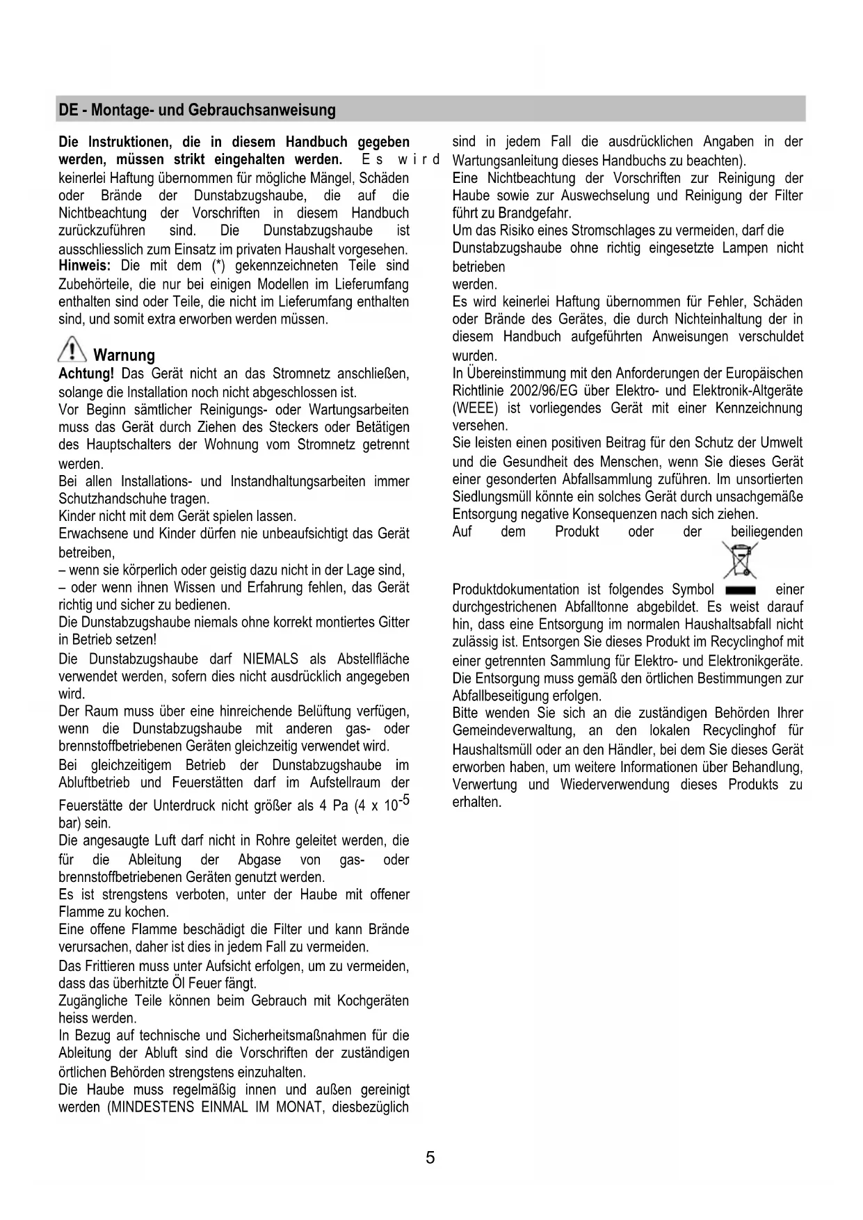 SV Monterings- och bruksanvisningar NO Instrukser for montering og bruk DA Bruger- og monteringsvejledning5 DE - Montage- und Gebrauchsanweisung Die Instruktionen, die in diesem Handbuch gegeben werden, müssen strikt eingehalten werden. Es wird keinerlei Haftung übernommen für mögliche Mängel, Schäden oder Brände der Dunstabzugshaube, die auf die Nichtbeachtung der Vorschriften in diesem Handbuch zurückzuführen sind. Die Dunstabzugshaube ist ausschliesslich zum Einsatz im privaten Haushalt vorgesehen. Hinweis: Die mit dem (*) gekennzeichneten Teile sind Zubehörteile, die nur bei einigen Modellen im Lieferumfang enthalten sind oder Teile, die nicht im Lieferumfang enthalten sind, und somit extra erworben werden müssen. Warnung Achtung! Das Gerät nicht an das Stromnetz anschließen, solange die Installation noch nicht abgeschlossen ist. Vor Beginn sämtlicher Reinigungs- oder Wartungsarbeiten muss das Gerät durch Ziehen des Steckers oder Betätigen des Hauptschalters der Wohnung vom Stromnetz getrennt werden. Bei allen Installations- und Instandhaltungsarbeiten immer Schutzhandschuhe tragen. Kinder nicht mit dem Gerät spielen lassen. Erwachsene und Kinder dürfen nie unbeaufsichtigt das Gerät betreiben, – wenn sie körperlich oder geistig dazu nicht in der Lage sind, – oder wenn ihnen Wissen und Erfahrung fehlen, das Gerät richtig und sicher zu bedienen. Die Dunstabzugshaube niemals ohne korrekt montiertes Gitter in Betrieb setzen! Die Dunstabzugshaube darf NIEMALS als Abstellfläche verwendet werden, sofern dies nicht ausdrücklich angegeben wird. Der Raum muss über eine hinreichende Belüftung verfügen, wenn die Dunstabzugshaube mit anderen gas- oder brennstoffbetriebenen Geräten gleichzeitig verwendet wird. Bei gleichzeitigem Betrieb der Dunstabzugshaube im Abluftbetrieb und Feuerstätten darf im Aufstellraum der Feuerstätte der Unterdruck nicht größer als 4 Pa (4 x 10