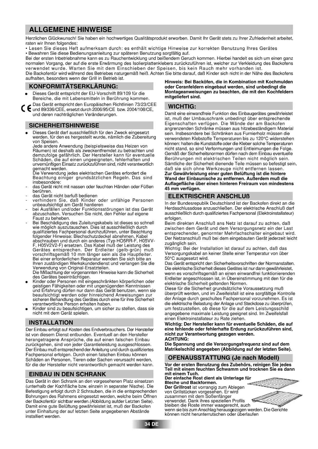 - Bewahren Sie diese Bedienungsanleitung zur späteren Benutzung sorgfältig auf. Bei der ersten Inbetriebnahme kann es zu Rauchentwicklung und beißendem Geruch kommen. Hierbei handelt es sich um einen ganz normalen Vorgang, der auf die erste Erwärmung des Isolierplattenklebers zurückzuführen ist, welcher zur Verkleidung des Backofens verwendet wurde. Warten Sie mit dem Einschieben der Speisen, bis kein Rauch mehr vorhanden ist. Die Backofentür wird während des Betriebes naturgemäß heiß. Achten Sie bitte darauf, daß Kinder sich nicht in der Nähe des Backofens aufhalten, besonders wenn der Grill in Betrieb ist. ALLGEMEINE HINWEISE 34 DE Hinweis: Bei Backöfen, die in Kombination mit Kochmulden oder Ceranfeldern eingebaut werden, sind unbedingt die Montageanweisungen zu beachten, die mit den Kochfeldern mitgeliefert sind. WICHTIG: Damit eine einwandfreie Funktion des Einbaugerätes gewährleistet ist, muß der Umbauschrank unbedingt über entsprechende Eigenschaften verfügen. Die Wände der am Backofen angrenzenden Schränke müssen aus hitzebeständigem Material sein. Insbesondere bei Schränken aus Furnierholz müssen die verwendeten Klebstoffe Temperaturen bis zu 120°C widerstehen können: halten die Kunststoffe oder die Kleber solche Temperaturen nicht stand, so sind Verformungen und Entleimungen die Folge. Gemäß der Sicherheitsnormen dürfen nach dem Einbau eventuelle Berührungen mit elektrischen Teilen nicht möglich sein. Sämtliche der Sicherheit dienende Teile müssen so befestigt sein, daß sie sich ohne Werkzeuge nicht entfernen lassen. Zur Gewährleistung einer guten Belüftung ist die hintere Wand der Einbaunische zu entfernen. Außerdem muß die Auflagefläche über einen hinteren Freiraum von mindestens 45 mm verfügen. ELEKTRISCHER ANSCHLUß In der Bundesrepublik Deutschland ist der Backofen direkt an die Herdaschlussdose anzuschließen. Der elektrische Anschluß darf ausschließlich durch qualifiziertes Fachpersonal (Elektroinstallateur) erfolgen. Beim direkten Anschluß ans Netz ist darauf zu achten, daß zwischen dem Gerät und dem Versorgungsnetz ein der Last entsprechender, genormter Mehrfachschalter eingebaut wird. Der Netzanschluß muß bei dem eingebauten Gerät jederzeit leicht zugänglich sein. Wichtig: Bei der Installation ist darauf zu achten, daß das Versorgungskabel an keiner Stelle einer Temperatur von über 50°C ausgesetzt wird. Das Gerät entspricht den Sicherheitsvorschriften der Normanstalten. Die elektrische Sicherheit dieses Gerätes ist nur dann gewährleistet, wenn es vorschriftsgemäß an einen einwandfrei funktionierenden Erdleiter angeschlossen ist, in Übereinstimmung mit den für die elektrische Sicherheit geltenden Normen. Diese für die Sicherheit grundsätzliche Voraussetzung muß überprüft werden, und im Zweifelsfall ist eine sorgfältige Kontrolle der Anlage durch geschultes Fachpersonal vorzunehmen. Es ist die elektrische Belastung der Anlage und Steckdose zu überprüfen, um festzustellen, ob diese für die auf dem Leistungsschild angegebene maximale Leistung geeignet sind. Im Zweifelsfall einen Elektroinstallateur zu Rate ziehen. Wichtig: Der Hersteller kann für eventuelle Schäden, die auf eine fehlende oder fehlerhafte Erdung zurückzuführen sind, nicht zur Verantwortung gezogen werden. ACHTUNG: Die Spannung und die Versorgungsfrequenz sind auf dem Matrikelschild angegeben (Abbildung auf der letzten Seite). KONFORMITÄTSERKLÄRUNG: Dieses Gerät entspricht der EU-Vorschrift 89/109 für die Bereiche, die mit Lebensmitteln in Berührung kommen. Das Gerät entspricht den Europäischen Richtlinien 73/23/CEE und 89/336/CEE, ersetzt durch 2006/95/CE bzw. 2004/108/CE, und deren nachträglichen Veränderungen. SICHERHEITSHINWEISE Dieses Gerät darf ausschließlich für den Zweck eingesetzt werden, für den es hergestellt wurde, nämlich die Zubereitung von Speisen. Jede andere Anwendung (beispielsweise das Heizen von Räumen) ist deshalb als zweckentfremdet zu betrachten und demzufolge gefährlich. Der Hersteller kann für eventuelle Schäden, die auf einen ungeeigneten, fehlerhaften und unvernünftigen Einsatz zurückzuführen sind, nicht verantwortlich gemacht werden. Die Verwendung jedes elektrischen Gerätes erfordert die Beachtung einiger grundsätzlichen Regeln. Das sind insbesondere: - das Gerät nicht mit nassen oder feuchten Händen oder Füßen berühren. - das Gerät nicht barfuß bedienen - verhindern Sie, daß Kinder oder unfähige Personen unbeaufsichtigt am Gerät hantieren - bei Ausfällen und/oder Funktionsstörungen ist das Gerät abzuschalten. Versuchen Sie nicht, den Fehler auf eigene Faust zu beheben. - Bei Beschädigung des Zuleitungskabels ist dieses so schnell wie möglich auszutauschen. Dies ist ausschließlich durch qualifiziertes Fachpersonal durchzuführen, unter Beachtung folgender Hinweise: Blechschutzdeckel abnehmen, Kabel abschrauben und durch ein anderes (Typ HO5RR-F, H05VV- F, H05V2V2-F) ersetzen. Das Kabel muß der Leistung des Gerätes entsprechen. Der Erdleiter (gelb-grün) muß vorschriftsgemäß 10 mm länger sein als die Hauptleiter. Bei einer erforderlichen Reparatur wenden Sie sich bitte an Ihren zuständigen Werkskundendienst und verlangen Sie die Verwendung von Original-Ersatzteilen. Die Mißachtung der vorgenannten Hinweise kann die Sicherheit des Gerätes beeinträchtigen. Kinder oder Personen mit eingeschränkten körperlichen oder geistigen Fähigkeiten oder mit ungenügenden Kenntnissen und Erfahrung dürfen nur dann das Gerät benutzen, wenn sie beaufsichtigt werden oder hinreichend Anweisungen zur sicheren Behandlung des Gerätes durch eine für ihre Sicherheit verantwortliche Person erhalten haben. Kinder sind zu beaufsichtigen, um sicher zu stellen, dass sie nicht mit dem Gerät spielen. INSTALLATION Der Einbau erfolgt auf Kosten des Endverbrauchers. Der Hersteller ist von diesem Dienst entbunden. Eventuell an den Hersteller herangetragene Ansprüche, die auf einen falsc