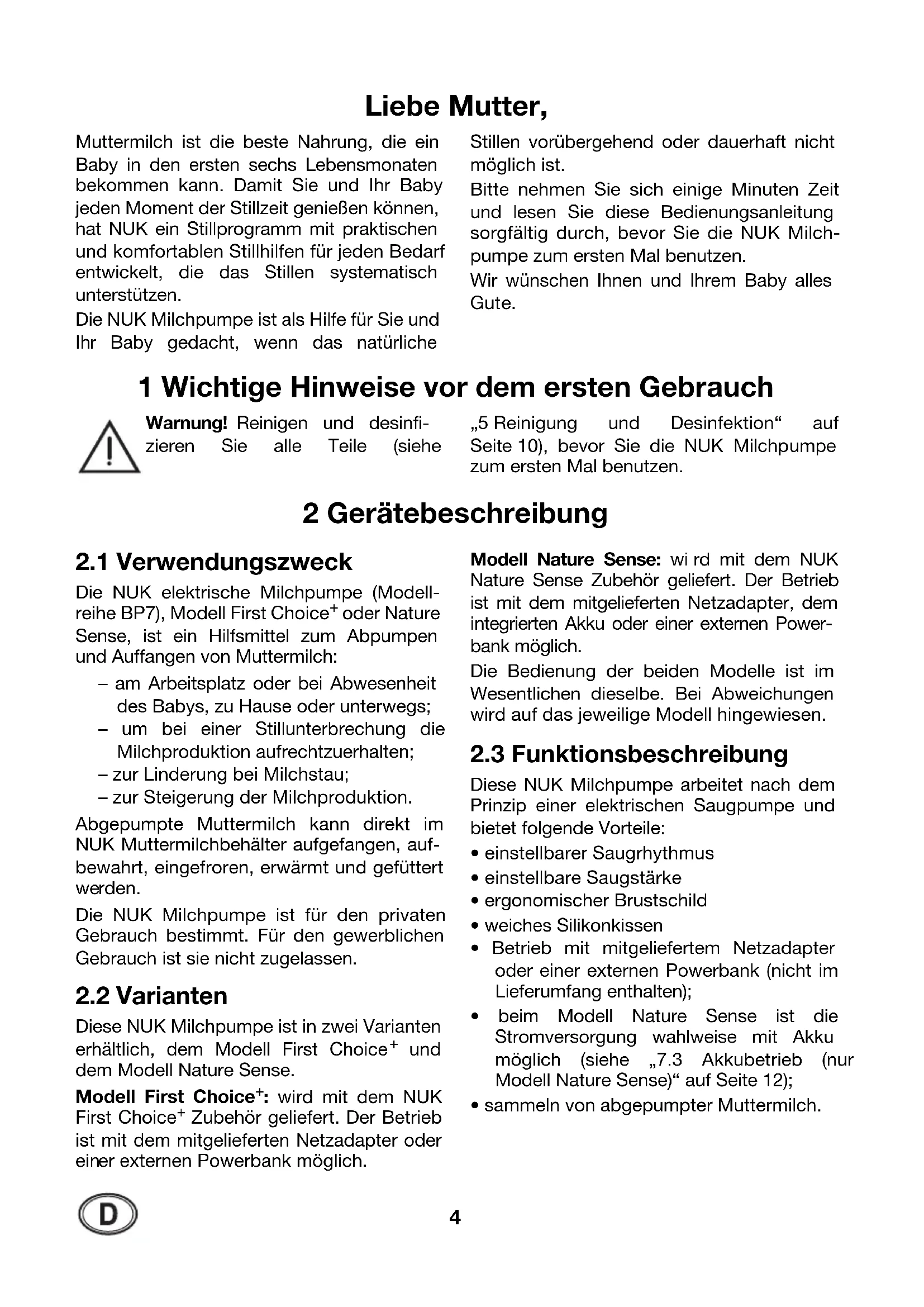 - Lesen Sie diese Bedienungsanleitung bitte sorgfältig vor dem Gebrauch der Milchpumpe. Sie ist Bestandteil des Gerätes und muss jederzeit verfügbar sein.