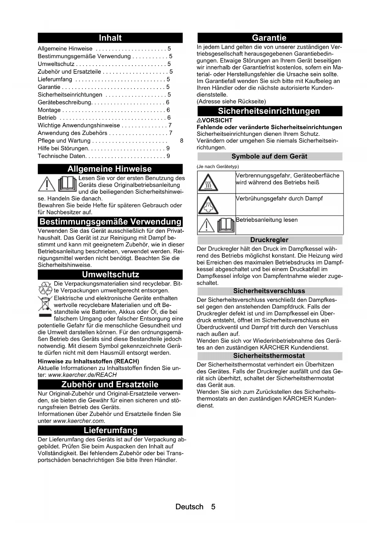 • L M 3N O P 4Deutsch 5 Inhalt Allgemeine Hinweise Lesen Sie vor der ersten Benutzung des Geräts diese Originalbetriebsanleitung und die beiliegenden Sicherheitshinwei- se. Handeln Sie danach. Bewahren Sie beide Hefte für späteren Gebrauch oder für Nachbesitzer auf. Bestimmungsgemäße Verwendung Verwenden Sie das Gerät ausschließlich für den Privat- haushalt. Das Gerät ist zur Reinigung mit Dampf be- stimmt und kann mit geeignetem Zubehör, wie in dieser Betriebsanleitung beschrieben, verwendet werden. Rei- nigungsmittel werden nicht benötigt. Beachten Sie die Sicherheitshinweise. Umweltschutz Die Verpackungsmaterialien sind recyclebar. Bit- te Verpackungen umweltgerecht entsorgen. Elektrische und elektronische Geräte enthalten wertvolle recyclebare Materialien und oft Be- standteile wie Batterien, Akkus oder Öl, die bei falschem Umgang oder falscher Entsorgung eine potentielle Gefahr für die menschliche Gesundheit und die Umwelt darstellen können. Für den ordnungsgemä- ßen Betrieb des Geräts sind diese Bestandteile jedoch notwendig. Mit diesem Symbol gekennzeichnete Gerä- te dürfen nicht mit dem Hausmüll entsorgt werden. Hinweise zu Inhaltsstoffen (REACH) Aktuelle Informationen zu Inhaltsstoffen finden Sie un- ter: www.kaercher.de/REACH Zubehör und Ersatzteile Nur Original-Zubehör und Original-Ersatzteile verwen- den, sie bieten die Gewähr für einen sicheren und stö- rungsfreien Betrieb des Geräts. Informationen über Zubehör und Ersatzteile finden Sie unter www.kaercher.com. Lieferumfang Der Lieferumfang des Geräts ist auf der Verpackung ab- gebildet. Prüfen Sie beim Auspacken den Inhalt auf Vollständigkeit. Bei fehlendem Zubehör oder bei Trans- portschäden benachrichtigen Sie bitte Ihren Händler. Garantie In jedem Land gelten die von unserer zuständigen Ver- triebsgesellschaft herausgegebenen Garantiebedin- gungen. Etwaige Störungen an Ihrem Gerät beseitigen wir innerhalb der Garantiefrist kostenlos, sofern ein Ma- terial- oder Herstellungsfehler die Ursache sein sollte. Im Garantiefall wenden Sie sich bitte mit Kaufbeleg an Ihren Händler oder die nächste autorisierte Kunden- dienststelle. (Adresse siehe Rückseite) Sicherheitseinrichtungen 몇 VORSICHT Fehlende oder veränderte Sicherheitseinrichtungen Sicherheitseinrichtungen dienen Ihrem Schutz. Verändern oder umgehen Sie niemals Sicherheitsein- richtungen. Symbole auf dem Gerät (Je nach Gerätetyp) Druckregler Der Druckregler hält den Druck im Dampfkessel wäh- rend des Betriebs möglichst konstant. Die Heizung wird bei Erreichen des maximalen Betriebsdrucks im Dampf- kessel abgeschaltet und bei einem Druckabfall im Dampfkessel infolge von Dampfentnahme wieder zuge- schaltet. Sicherheitsverschluss Der Sicherheitsverschluss verschließt den Dampfkes- sel gegen den anstehenden Dampfdruck. Falls der Druckregler defekt ist und im Dampfkessel ein Über- druck entsteht, öffnet im Sicherheitsverschluss ein Überdruckventil und Dampf tritt durch den Verschluss nach außen auf. Wenden Sie sich vor Wiederinbetriebnahme des Gerä- tes an den zuständigen KÄRCHER Kundendienst. Sicherheitsthermostat Der Sicherheitsthermostat verhindert ein Überhitzen des Gerätes. Falls der Druckregler ausfällt und das Ge- rät sich überhitzt, schaltet der Sicherheitsthermostat das Gerät aus. Wenden Sie sich zum Zurückstellen des Sicherheits- thermostats an den zuständigen KÄRCHER Kunden- dienst. Allgemeine Hinweise p. 5