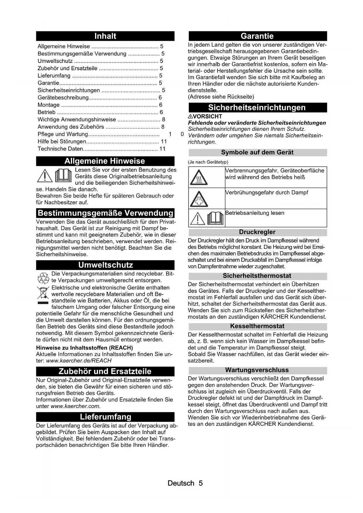 - 4Deutsch 5 Inhalt Allgemeine Hinweise Lesen Sie vor der ersten Benutzung des Geräts diese Originalbetriebsanleitung und die beiliegenden Sicherheitshinwei- se. Handeln Sie danach. Bewahren Sie beide Hefte für späteren Gebrauch oder für Nachbesitzer auf. Bestimmungsgemäße Verwendung Verwenden Sie das Gerät ausschließlich für den Privat- haushalt. Das Gerät ist zur Reinigung mit Dampf be- stimmt und kann mit geeignetem Zubehör, wie in dieser Betriebsanleitung beschrieben, verwendet werden. Rei- nigungsmittel werden nicht benötigt. Beachten Sie die Sicherheitshinweise. Umweltschutz Die Verpackungsmaterialien sind recyclebar. Bit- te Verpackungen umweltgerecht entsorgen. Elektrische und elektronische Geräte enthalten wertvolle recyclebare Materialien und oft Be- standteile wie Batterien, Akkus oder Öl, die bei falschem Umgang oder falscher Entsorgung eine potentielle Gefahr für die menschliche Gesundheit und die Umwelt darstellen können. Für den ordnungsgemä- ßen Betrieb des Geräts sind diese Bestandteile jedoch notwendig. Mit diesem Symbol gekennzeichnete Gerä- te dürfen nicht mit dem Hausmüll entsorgt werden. Hinweise zu Inhaltsstoffen (REACH) Aktuelle Informationen zu Inhaltsstoffen finden Sie un- ter: www.kaercher.de/REACH Zubehör und Ersatzteile Nur Original-Zubehör und Original-Ersatzteile verwen- den, sie bieten die Gewähr für einen sicheren und stö- rungsfreien Betrieb des Geräts. Informationen über Zubehör und Ersatzteile finden Sie unter www.kaercher.com. Lieferumfang Der Lieferumfang des Geräts ist auf der Verpackung ab- gebildet. Prüfen Sie beim Auspacken den Inhalt auf Vollständigkeit. Bei fehlendem Zubehör oder bei Trans- portschäden benachrichtigen Sie bitte Ihren Händler. Garantie In jedem Land gelten die von unserer zuständigen Ver- triebsgesellschaft herausgegebenen Garantiebedin- gungen. Etwaige Störungen an Ihrem Gerät beseitigen wir innerhalb der Garantiefrist kostenlos, sofern ein Ma- terial- oder Herstellungsfehler die Ursache sein sollte. Im Garantiefall wenden Sie sich bitte mit Kaufbeleg an Ihren Händler oder die nächste autorisierte Kunden- dienststelle. (Adresse siehe Rückseite) Sicherheitseinrichtungen 몇 VORSICHT Fehlende oder veränderte Sicherheitseinrichtungen Sicherheitseinrichtungen dienen Ihrem Schutz. Verändern oder umgehen Sie niemals Sicherheitsein- richtungen. Symbole auf dem Gerät (Je nach Gerätetyp) Druckregler Der Druckregler hält den Druck im Dampfkessel während des Betriebs möglichst konstant. Die Heizung wird bei Errei- chen des maximalen Betriebsdrucks im Dampfkessel abge- schaltet und bei einem Druckabfall im Dampfkessel infolge von Dampfentnahme wieder zugeschaltet. Sicherheitsthermostat Der Sicherheitsthermostat verhindert ein Überhitzen des Gerätes. Falls der Druckregler und der Kesselther- mostat im Fehlerfall ausfallen und das Gerät sich über- hitzt, schaltet der Sicherheitsthermostat das Gerät aus. Wenden Sie sich zum Rückstellen des Sicherheitsther- mostats an den zuständigen KÄRCHER Kundendienst. Kesselthermostat Der Kesselthermostat schaltet im Fehlerfall die Heizung ab, z. B. wenn sich kein Wasser im Dampfkessel befin- det und die Temperatur im Dampfkessel steigt. Sobald Sie Wasser nachfüllen, ist das Gerät wieder ein- satzbereit. Wartungsverschluss Der Wartungsverschluss verschließt den Dampfkessel gegen den anstehenden Druck. Der Wartungsver- schluss ist zugleich ein Überdruckventil. Falls der Druckregler defekt ist und der Dampfdruck im Dampf- kessel steigt, öffnet das Überdruckventil und Dampf tritt durch den Wartungsverschluss nach außen aus. Wenden Sie sich vor Wiederinbetriebnahme des Gerä- tes an den zuständigen KÄRCHER Kundendienst. Allgemeine Hinweise p. 5