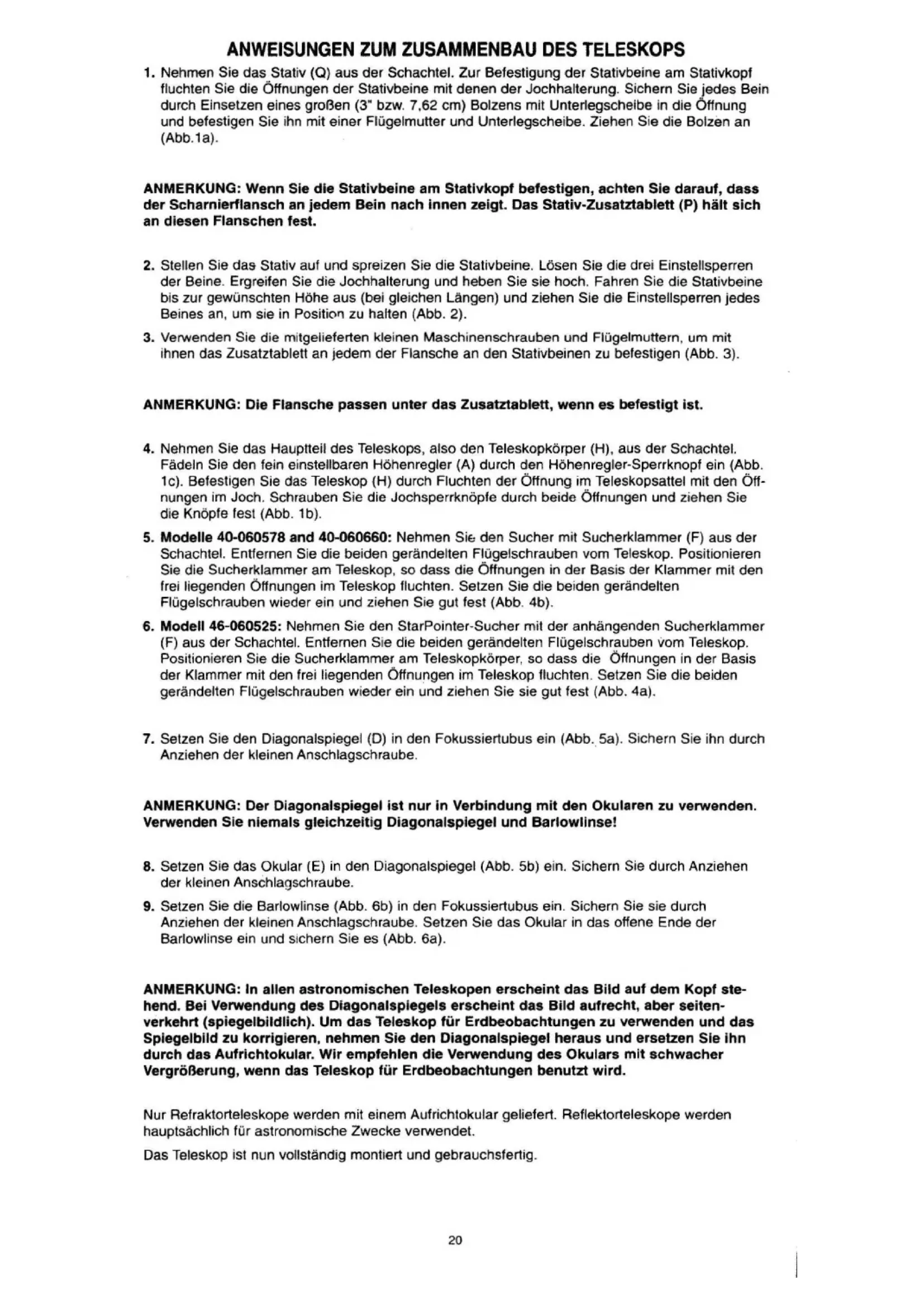 Anziehen der kleinen Anschlagschraube . Setzen Sie das Okular in das offene Ende der Barlowlinse ein und sichern Sie es (Abb. 6a). ANMERKUNG: In allen astronomischen Teleskopen erscheint das Bild auf dem Kopf ste- hend. Bei Verwendung des Diagonalspiegels erscheint das Bild aufrecht, aber seiten- verkehrt (spiegelbildlich). Um das Teleskop für Erdbeobachtungen zu verwenden und das Spiegelbild zu korrigieren, nehmen Sie den Diagonalspiegel heraus und ersetzen Sie ihn durch das Aufrlchtokular. Wir empfehlen die Verwendung des Okulars mit schwacher Vergrößerung, wenn das Teleskop für Erdbeobachtungen benutzt wird. Nur Refraktorteleskope werden mit einem Aufrichtokular geliefert. Reflektorteleskope werden hauptsächlich für astronomische Zwecke verwendet. Das Teleskop ist nun vollständig montiert und gebrauchsfertig . 20'