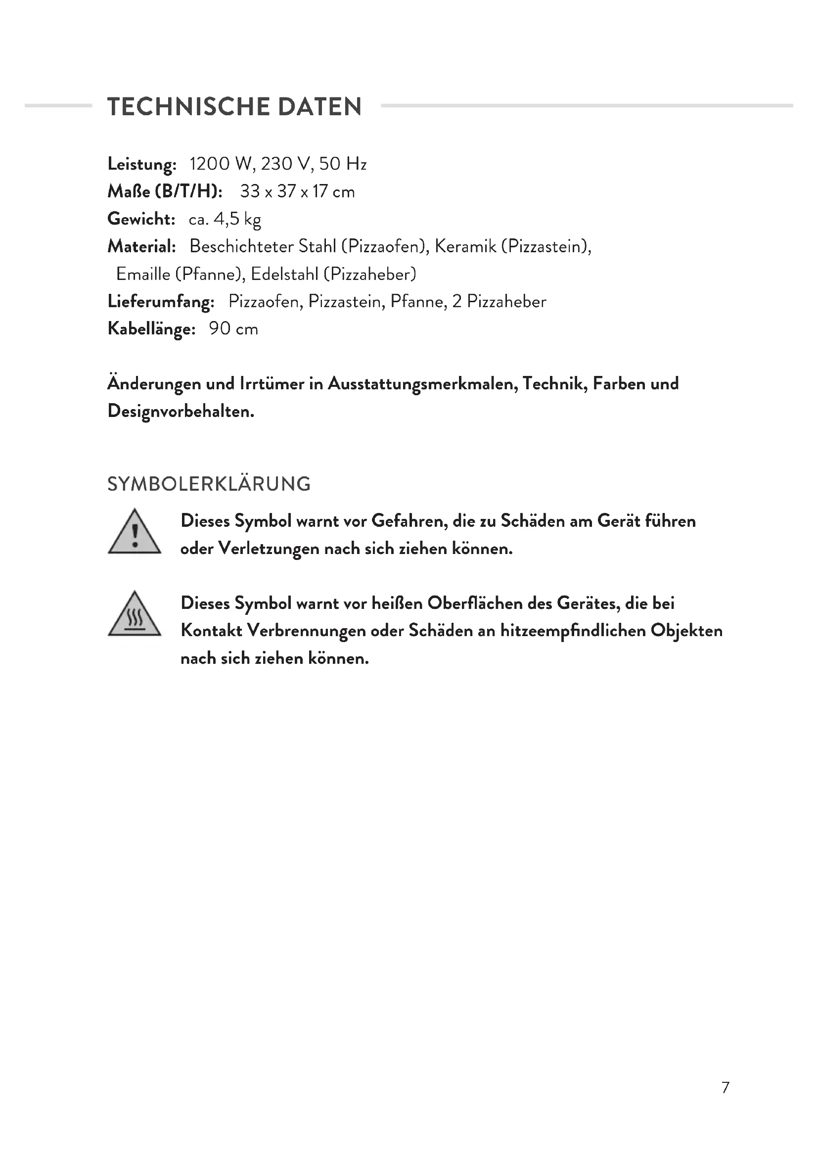 - Um Gefährdungen zu vermeiden und um Sicherheitsbestimmungen einzuhalten, dürfen Reparaturen am Gerät und an der Anschlussleitung nur von einem autorisierten Fachmann durchgeführt werden. Dafür muss der Pizzaofen vom Leitungsnetz getrennt werden. Kontaktiere im Reparaturfall unseren Kunden-dienst telefonisch oder per Mail.