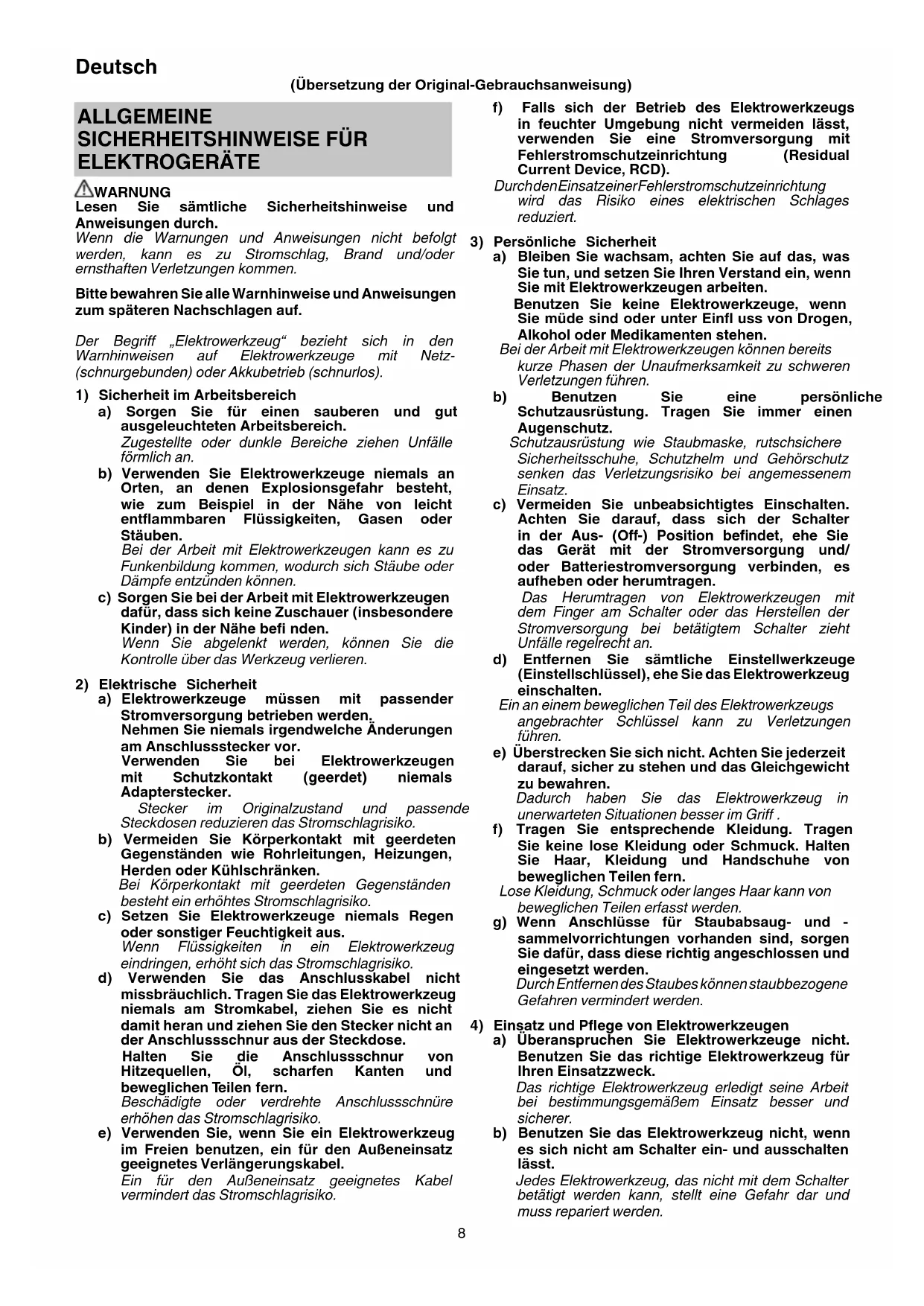a) Überanspruchen Sie Elektrowerkzeuge nicht. Benutzen Sie das richtige Elektrowerkzeug für Ihren Einsatzzweck. Das richtige Elektrowerkzeug erledigt seine Arbeit bei bestimmungsgemäßem Einsatz besser und sicherer. b) Benutzen Sie das Elektrowerkzeug nicht, wenn es sich nicht am Schalter ein- und ausschalten lässt. Jedes Elektrowerkzeug, das nicht mit dem Schalter betätigt werden kann, stellt eine Gefahr dar und muss repariert werden. ALLGEMEINE