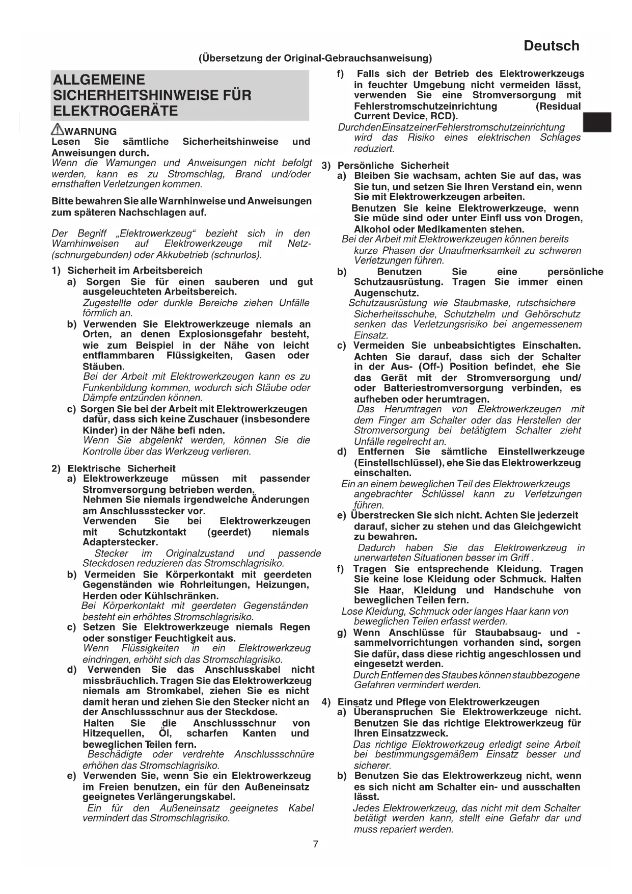 a) Überanspruchen Sie Elektrowerkzeuge nicht. Benutzen Sie das richtige Elektrowerkzeug für Ihren Einsatzzweck. Das richtige Elektrowerkzeug erledigt seine Arbeit bei bestimmungsgemäßem Einsatz besser und sicherer. b) Benutzen Sie das Elektrowerkzeug nicht, wenn es sich nicht am Schalter ein- und ausschalten lässt. Jedes Elektrowerkzeug, das nicht mit dem Schalter betätigt werden kann, stellt eine Gefahr dar und muss repariert werden. ALLGEMEINE