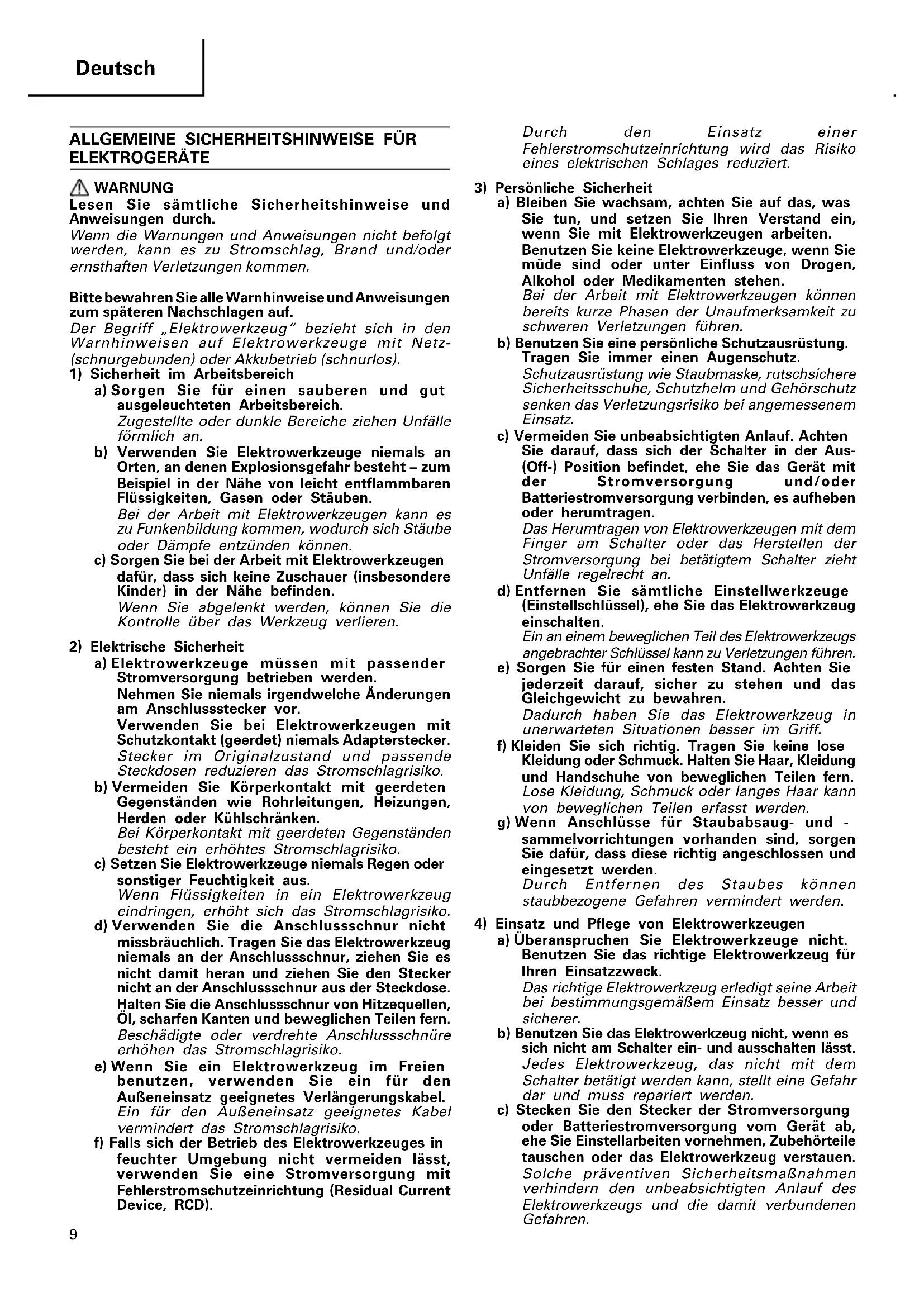 der Arbeit Die Schleifscheibe dreht sich auch nach dem Ausschalten des Werkzeugs noch weiter. Nach dem Ausschalten darf die Maschine erst abgelegt werden, wenn die Schleifscheibe völlig zum Stillstand gekommen ist. Abgesehen vom Vermeiden ernsthafter Unfälle wird durch diese Vorsichtsma nahme vermieden, daß Staub und Späne in die Maschine gesaugt werden. ACHTUNG 䡬 Überprüfen Sie, daß das Werkstück richtig unterstützt ist. 䡬 Überprüfen Sie bei Arbeit an einem staubigen Ort, daß die Ventilationsöffnungen freigehalten werden. Wenn Beseitigung von Staub erforderlich werden sollte, so ziehen Sie zuerst den Stecker des Netzkabels aus der Steckdose (verwenden Sie nichtmetallische Gegenstände) und vermeiden Sie Beschädigung innerer Teile. 䡬 Stellen Sie sicher, daß bei der Verwendung auftretende Funken keine Gefährdung darstellen, d.h. daß sie keine Personen treffen und keine entflammbaren Substanzen entzünden. 䡬 Verwenden Sie immer Augen- und Ohrenschutz. Sonstige persönliche Schutzausrüstung wie eine Staubmaske, Handschuhe, ein Helm und eine Schürze sollte getragen werden, wenn sie erforderlich ist. Tragen Sie im Zweifelsfall Schutzausrüstung. 䡬 Wenn die Maschine nicht benutzt wird, sollte der Netzstecker gezogen werden.