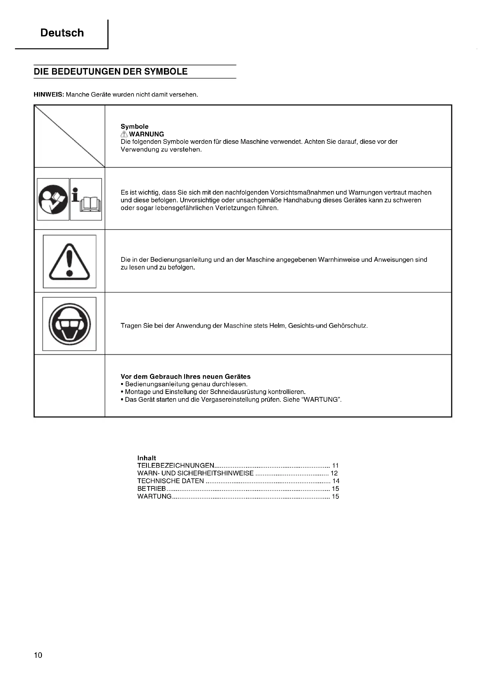 HINWEIS: Manche Geräte wurden nicht damit versehen. Symbole WARNUNG Die folgenden Symbole werden für diese Maschine verwendet. Achten Sie darauf, diese vor der Verwendung zu verstehen. Es ist wichtig, dass Sie sich mit den nachfolgenden Vorsichtsmaßnahmen und Warnungen vertraut machen und diese befolgen. Unvorsichtige oder unsachgemäße Handhabung dieses Gerätes kann zu schweren oder sogar lebensgefährlichen Verletzungen führen. Die in der Bedienungsanleitung und an der Maschine angegebenen Warnhinweise und Anweisungen sind zu lesen und zu befolgen. Tragen Sie bei der Anwendung der Maschine stets Helm, Gesichts-und Gehörschutz. Vor dem Gebrauch Ihres neuen Gerätes