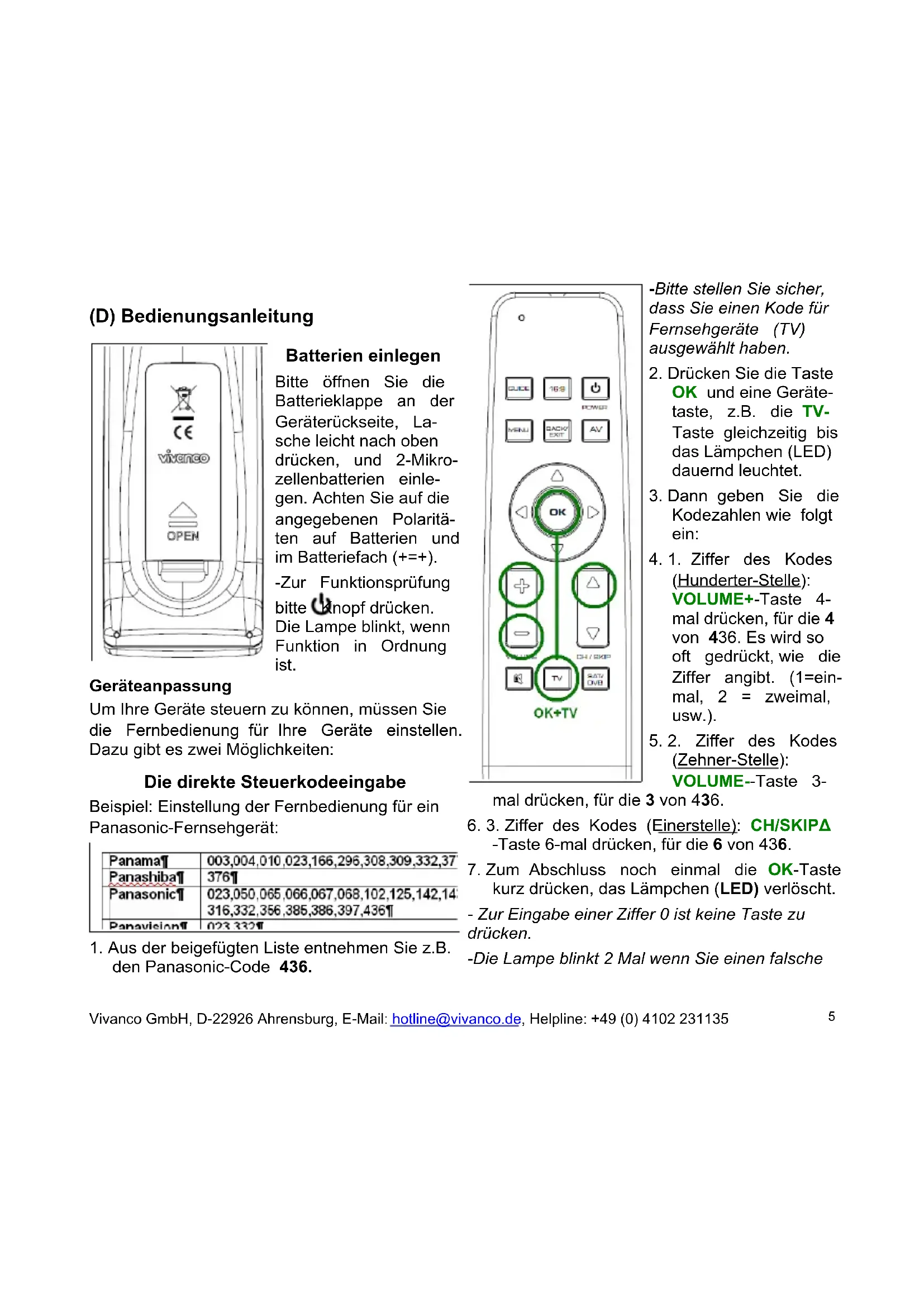 OK+VOLUME+ briefly and count the number of times the hundred blinks, then press OK+ VOLUME- briefly and count the number of times the ten blinks and finally, press OK+CH/SKIPΔ briefly the number of times the one blinks. – No blink means 0. Reset To Factotry Settings Press OK+ button until the lamp blinks twice in order to reset the remote to factory settings. Operation You operate your universal remote control ba- sically in the same way as if you were using the original remote control. As the symbols on a uni- versal remote control could differ from those on the original remote controls, you may have to try out all the buttons in order to find the right func- tions. Specifications Batteries: 2x AAA batteries, R03, UM4 Range: max. 7 m Not for 400 kHz equipment Two Year Guarantee This product is covered by a two year warranty against faulty parts and workmanship. Exclu- sions to this warranty are missing codes, normal wear and tear and misuse. Vivanco GmbH, D-22926 Ahrensburg, E-Mail: hotline@vivanco.de, Helpline: +49 (0) 4102 231135 4(D) Bedienungsanleitung Batterien einlegen Bitte öffnen Sie die Batterieklappe an der Geräterückseite, La- sche leicht nach oben drücken, und 2-Mikro- zellenbatterien einle- gen. Achten Sie auf die angegebenen Polaritä- ten auf Batterien und im Batteriefach (+=+). -Zur Funktionsprüfung bitte Knopf drücken. Die Lampe blinkt, wenn Funktion in Ordnung ist. Geräteanpassung Um Ihre Geräte steuern zu können, müssen Sie die Fernbedienung für Ihre Geräte einstellen. Dazu gibt es zwei Möglichkeiten: Die direkte Steuerkodeeingabe Beispiel: Einstellung der Fernbedienung für ein Panasonic-Fernsehgerät: