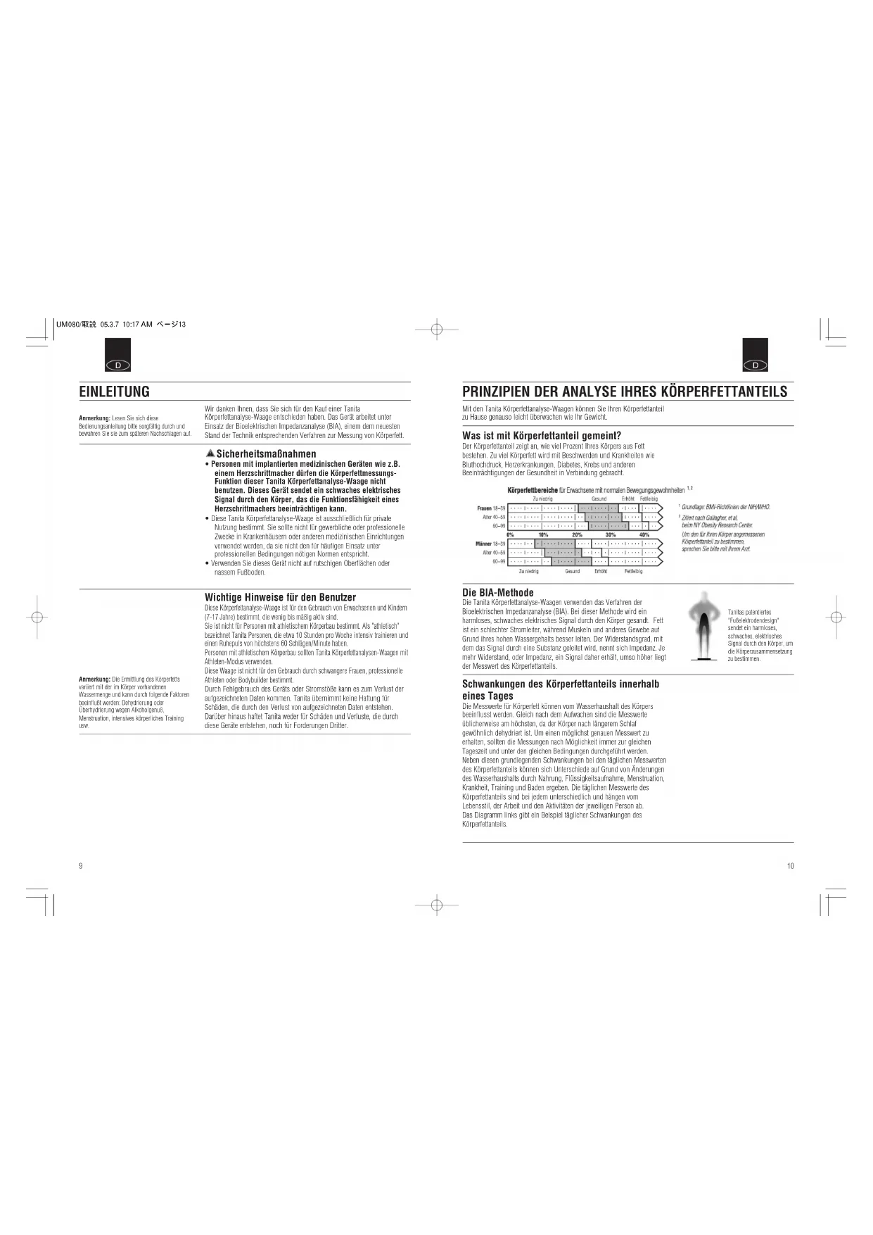 - Verwenden Sie dieses Gerät nicht auf rutschigen Oberflächen oder nassem Fußboden. Wichtige Hinweise für den Benutzer Diese Körperfettanalyse-Waage ist für den Gebrauch von Erwachsenen und Kindern (7-17 Jahre) bestimmt, die wenig bis mäßig aktiv sind. Sie ist nicht für Personen mit athletischem Körperbau bestimmt. Als "athletisch" bezeichnet Tanita Personen, die etwa 10 Stunden pro Woche intensiv trainieren und einen Ruhepuls von höchstens 60 Schlägen/Minute haben. Personen mit athletischem Körperbau sollten Tanita Körperfettanalysen-Waagen mit Athleten-Modus verwenden. Diese Waage ist nicht für den Gebrauch durch schwangere Frauen, professionelle Athleten oder Bodybuilder bestimmt. Durch Fehlgebrauch des Geräts oder Stromstöße kann es zum Verlust der aufgezeichneten Daten kommen. Tanita übernimmt keine Haftung für Schäden, die durch den Verlust von aufgezeichneten Daten entstehen. Darüber hinaus haftet Tanita weder für Schäden und Verluste, die durch diese Geräte entstehen, noch für Forderungen Dritter. Anmerkung: Lesen Sie sich dieseBedienungsanleitung bitte sorgfältig durch undbewahren Sie sie zum späteren Nachschlagen auf.Anmerkung: Die Ermittlung des Körperfettsvariiert mit der im Körper vorhandenenWassermenge und kann durch folgende Faktorenbeeinflußt werden: Dehydrierung oderÜberhydrierung wegen Alkoholgenuß,Menstruation, intensives körperliches Training usw.