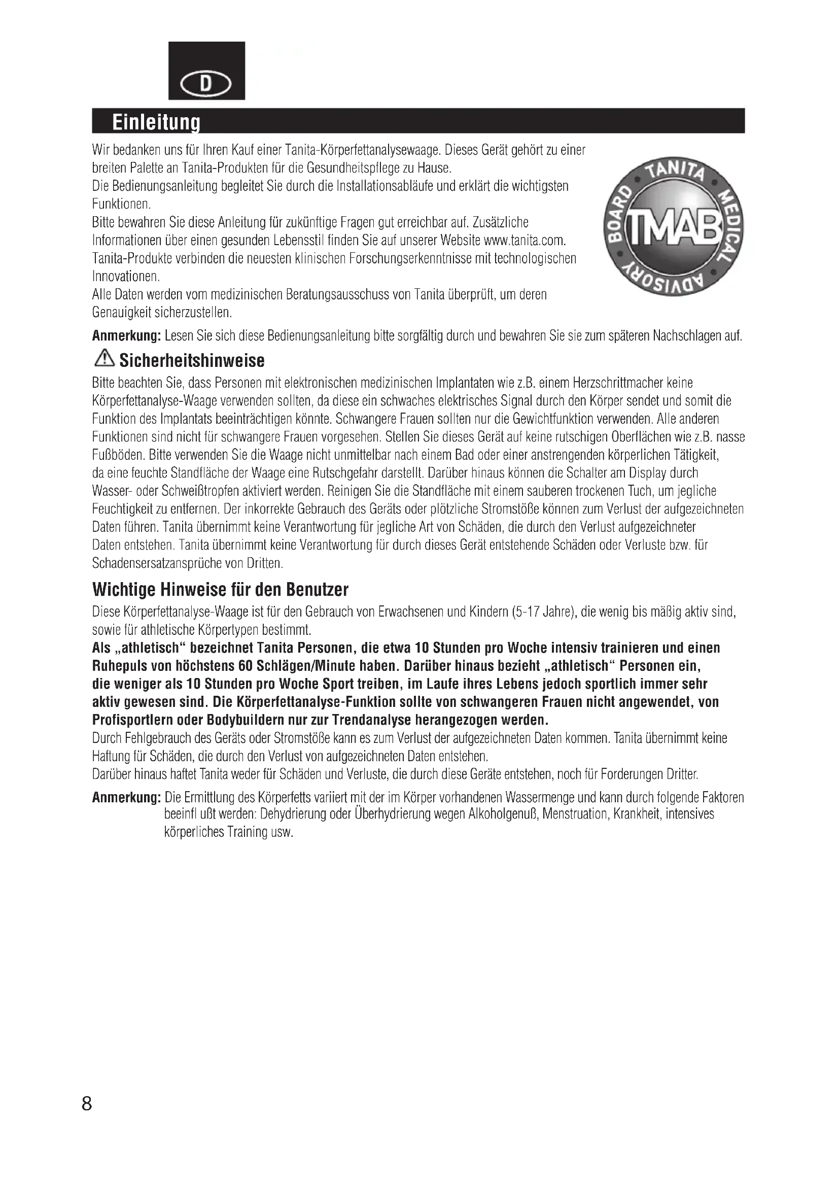 Body Fat Increments 0.1% Personal Data 4 memories Power Supply 2 pcs. Lithium batteries CR2032 (included) Power Consumption 60 mA maximum Measuring Current 50 kHz, 6.25 kHz, 100 µA Not allowed to mix batteries with consumer wastes! As consumer you are legally bound to return used or discharged batteries. You can deposit your old batteries at the public collecting points in your town, or wherever the corresponding batteries are sold and specifically marked collecting boxes have been set up. In case of scrapping the apparatus, the batteries should be removed from it and deposited at the collecting points as well. Notice: These marks can be found out on contaminant-containing Batteries: Pb Pb = Battery contains lead, Cd Cd = Battery contains cadmium, Hg Hg = Battery contains mercury. The device features radio interference suppression in compliance with EC regulation 2004/108/EC8 Einleitung Wir bedanken uns für Ihren Kauf einer Tanita-Körperfettanalysewaage. Dieses Gerät gehört zu einer breiten Palette an Tanita-Produkten für die Gesundheitspflege zu Hause. Die Bedienungsanleitung begleitet Sie durch die Installationsabläufe und erklärt die wichtigsten Funktionen. Bitte bewahren Sie diese Anleitung für zukünftige Fragen gut erreichbar auf. Zusätzliche Informationen über einen gesunden Lebensstil finden Sie auf unserer Website www.tanita.com. Tanita-Produkte verbinden die neuesten klinischen Forschungserkenntnisse mit technologischen Innovationen. Alle Daten werden vom medizinischen Beratungsausschuss von Tanita überprüft, um deren Genauigkeit sicherzustellen. Anmerkung: Lesen Sie sich diese Bedienungsanleitung bitte sorgfältig durch und bewahren Sie sie zum späteren Nachschlagen auf. Sicherheitshinweise Bitte beachten Sie, dass Personen mit elektronischen medizinischen Implantaten wie z.B. einem Herzschrittmacher keine Körperfettanalyse-Waage verwenden sollten, da diese ein schwaches elektrisches Signal durch den Körper sendet und somit die Funktion des Implantats beeinträchtigen könnte. Schwangere Frauen sollten nur die Gewichtfunktion verwenden. Alle anderen Funktionen sind nicht für schwangere Frauen vorgesehen. Stellen Sie dieses Gerät auf keine rutschigen Oberflächen wie z.B. nasse Fußböden. Bitte verwenden Sie die Waage nicht unmittelbar nach einem Bad oder einer anstrengenden körperlichen Tätigkeit, da eine feuchte Standfläche der Waage eine Rutschgefahr darstellt. Darüber hinaus können die Schalter am Display durch Wasser- oder Schweißtropfen aktiviert werden. Reinigen Sie die Standfläche mit einem sauberen trockenen Tuch, um jegliche Feuchtigkeit zu entfernen. Der inkorrekte Gebrauch des Geräts oder plötzliche Stromstöße können zum Verlust der aufgezeichneten Daten führen. Tanita übernimmt keine Verantwortung für jegliche Art von Schäden, die durch den Verlust aufgezeichneter Daten entstehen. Tanita übernimmt keine Verantwortung für durch dieses Gerät entstehende Schäden oder Verluste bzw. für Schadensersatzansprüche von Dritten. Wichtige Hinweise für den Benutzer Diese Körperfettanalyse-Waage ist für den Gebrauch von Erwachsenen und Kindern (5-17 Jahre), die wenig bis mäßig aktiv sind, sowie für athletische Körpertypen bestimmt. Als „athletisch“ bezeichnet Tanita Personen, die etwa 10 Stunden pro Woche intensiv trainieren und einen Ruhepuls von höchstens 60 Schlägen/Minute haben. Darüber hinaus bezieht „athletisch“ Personen ein, die weniger als 10 Stunden pro Woche Sport treiben, im Laufe ihres Lebens jedoch sportlich immer sehr aktiv gewesen sind. Die Körperfettanalyse-Funktion sollte von schwangeren Frauen nicht angewendet, von Profisportlern oder Bodybuildern nur zur Trendanalyse herangezogen werden. Durch Fehlgebrauch des Geräts oder Stromstöße kann es zum Verlust der aufgezeichneten Daten kommen. Tanita übernimmt keine Haftung für Schäden, die durch den Verlust von aufgezeichneten Daten entstehen. Darüber hinaus haftet Tanita weder für Schäden und Verluste, die durch diese Geräte entstehen, noch für Forderungen Dritter. Anmerkung: Die Ermittlung des Körperfetts variiert mit der im Körper vorhandenen Wassermenge und kann durch folgende Faktoren beeinfl ußt werden: Dehydrierung oder Überhydrierung wegen Alkoholgenuß, Menstruation, Krankheit, intensives körperliches Training usw.9 S E T RECALL