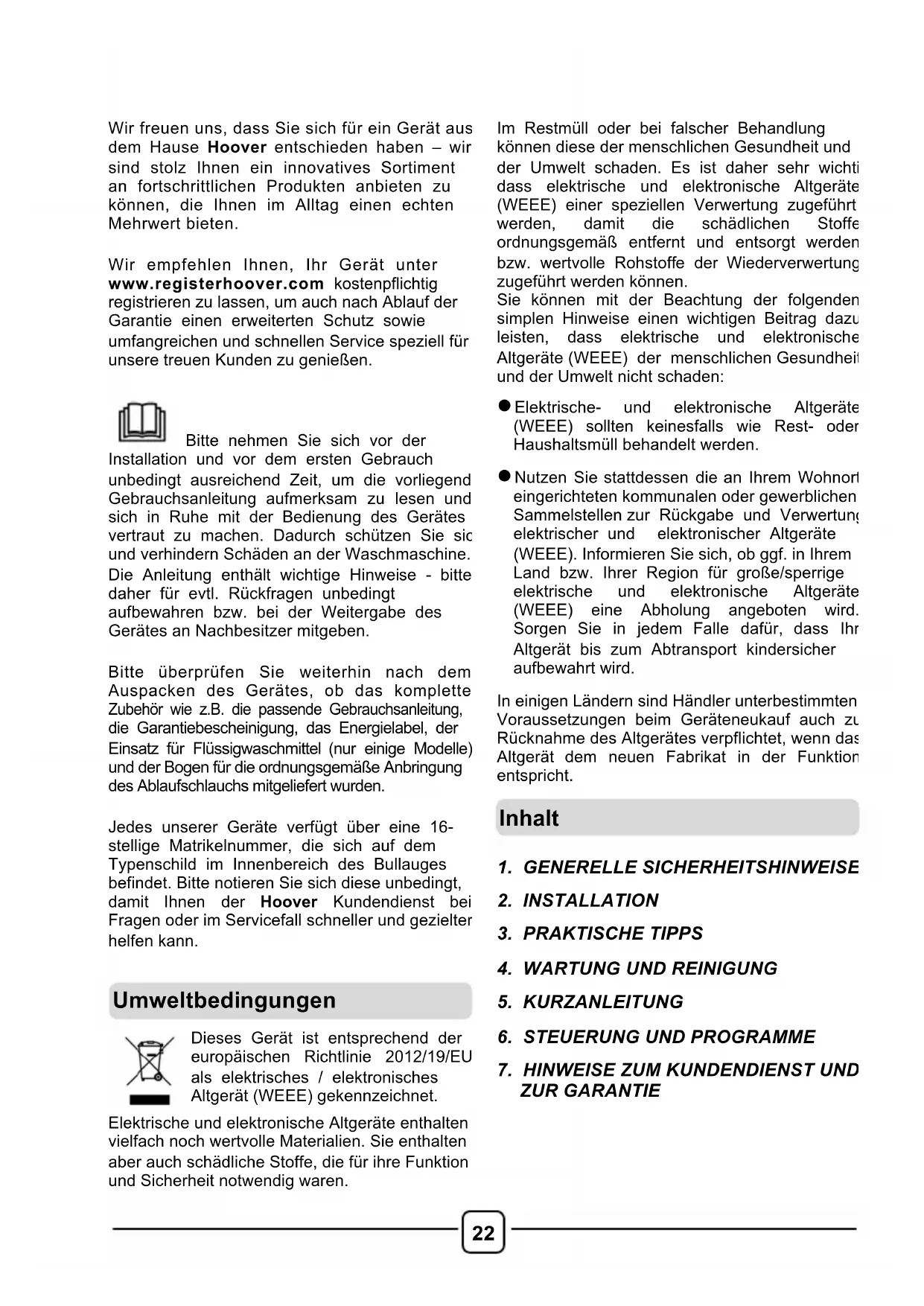 Wir freuen uns, dass Sie sich für ein Gerät aus dem Hause Hoover entschieden haben – wir sind stolz Ihnen ein innovatives Sortiment an fortschrittlichen Produkten anbieten zu können, die Ihnen im Alltag einen echten Mehrwert bieten.