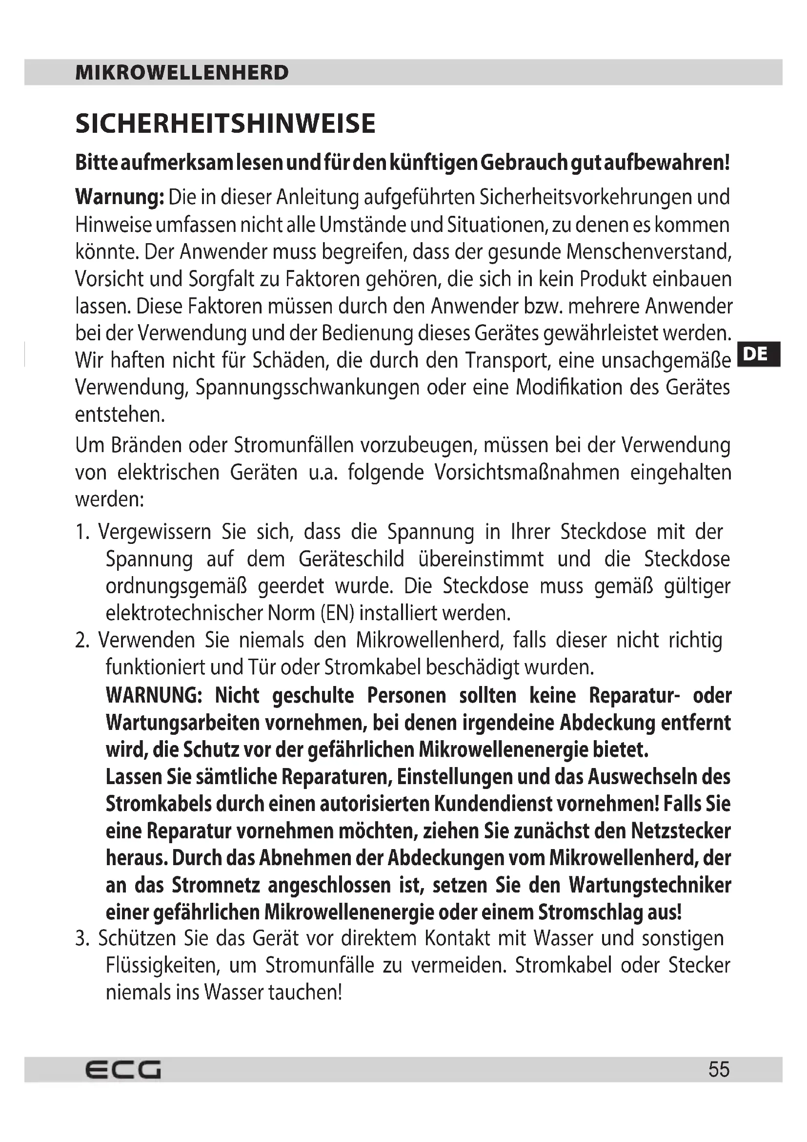 Sollten Sie Zweifel bzgl. der Elektroinstallation haben oder sollten irgendwelche Störungen am Mikrowellenherd auftauchen, wenden Sie sich bitte an einen qualifizierten Elektromonteur oder einen Wartungstechniker.