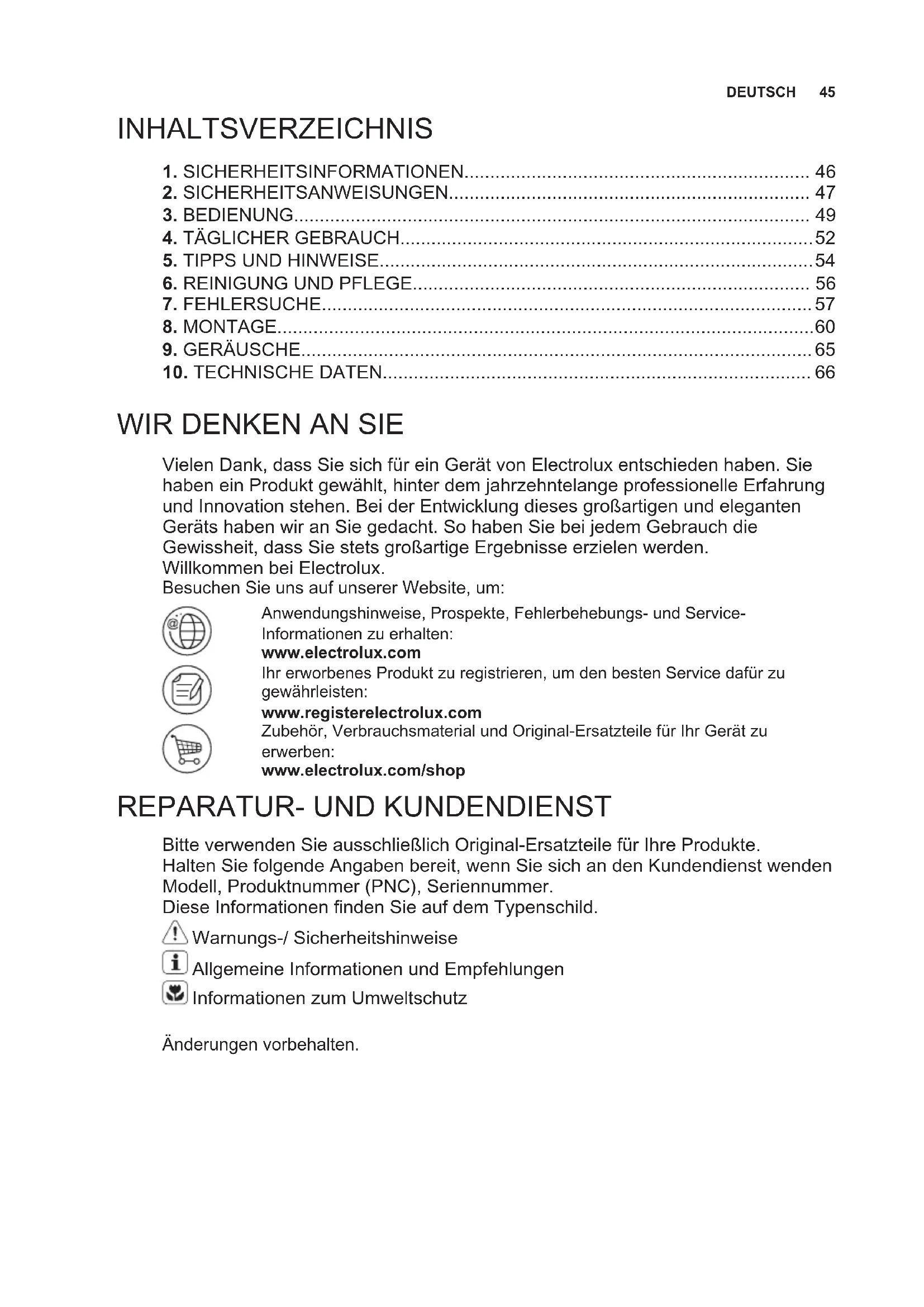 Bitte verwenden Sie ausschließlich Original-Ersatzteile für Ihre Produkte. Halten Sie folgende Angaben bereit, wenn Sie sich an den Kundendienst wenden Modell, Produktnummer (PNC), Seriennummer. Diese Informationen finden Sie auf dem Typenschild. Warnungs-/ Sicherheitshinweise Allgemeine Informationen und Empfehlungen Informationen zum Umweltschutz Änderungen vorbehalten. DEUTSCH