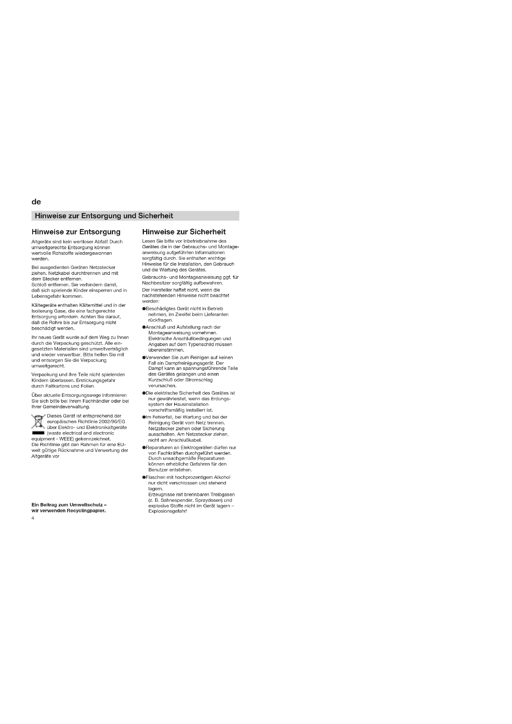 Hinweise zur Entsorgung und Sicherheit Hinweise zur Entsorgung Altgeräte sind kein wertloser Abfall! Durch umweltgerechte Entsorgung können wertvolle Rohstoffe wiedergewonnen werden. Bei ausgedienten Geräten Netzstecker ziehen. Netzkabel durchtrennen und mit dem Stecker entfernen. Schloß entfernen. Sie verhindern damit, daß sich spielende Kinder einsperren und in Lebensgefahr kommen. Kältegeräte enthalten Kältemittel und in der Isolierung Gase, die eine fachgerechte Entsorgung erfordern. Achten Sie darauf, daß die Rohre bis zur Entsorgung nicht beschädigt werden. Ihr neues Gerät wurde auf dem Weg zu Ihnen durch die Verpackung geschützt. Alle ein- gesetzten Materialien sind umweltverträglich und wieder verwertbar. Bitte helfen Sie mit und entsorgen Sie die Verpackung umweltgerecht. Verpackung und ihre Teile nicht spielenden Kindern überlassen. Erstickungsgefahr durch Faltkartons und Folien. Über aktuelle Entsorgungswege informieren Sie sich bitte bei Ihrem Fachhändler oder bei Ihrer Gemeindeverwaltung. Dieses Gerät ist entsprechend der europäischen Richtlinie 2002/96/EG über Elektro- und Elektronikaltgeräte (waste electrical and electronic equipment - WEEE) gekennzeichnet. Die Richtlinie gibt den Rahmen für eine EU- weit gültige Rücknahme und Verwertung der Altgeräte vor Ein Beitrag zum Umweltschutz – wir verwenden Recyclingpapier. Hinweise zur Sicherheit Lesen Sie bitte vor Inbetriebnahme des Gerätes die in der Gebrauchs- und Montage- anweisung aufgeführten Informationen sorgfältig durch. Sie enthalten wichtige Hinweise für die Installation, den Gebrauch und die Wartung des Gerätes. Gebrauchs- und Montageanweisung ggf. für Nachbesitzer sorgfältig aufbewahren. Der Hersteller haftet nicht, wenn die nachstehenden Hinweise nicht beachtet werden: ● Beschädigtes Gerät nicht in Betrieb nehmen, im Zweifel beim Lieferanten rückfragen. ● Anschluß und Aufstellung nach der Montageanweisung vornehmen. Elektrische Anschlußbedingungen und Angaben auf dem Typenschild müssen übereinstimmen. ● Verwenden Sie zum Reinigen auf keinen Fall ein Dampfreinigungsgerät. Der Dampf kann an spannungsführende Teile des Gerätes gelangen und einen Kurzschluß oder Stromschlag verursachen. ● Die elektrische Sicherheit des Gerätes ist nur gewährleistet, wenn das Erdungs- system der Hausinstallation vorschriftsmäßig installiert ist. ● Im Fehlerfall, bei Wartung und bei der Reinigung Gerät vom Netz trennen. Netzstecker ziehen oder Sicherung ausschalten. Am Netzstecker ziehen, nicht am Anschlußkabel. ● Reparaturen an Elektrogeräten dürfen nur von Fachkräften durchgeführt werden. Durch unsachgemäße Reparaturen können erhebliche Gefahren für den Benutzer entstehen. ● Flaschen mit hochprozentigem Alkohol nur dicht verschlossen und stehend lagern. Erzeugnisse mit brennbaren Treibgasen (z. B. Sahnespender, Spraydosen) und explosive Stoffe nicht im Gerät lagern – Explosionsgefahr!5 Bestimmungen Das Gerät eignet sich zum Kühlen und Gefrieren von Lebensmitteln und zur Eis- bereitung. Es ist für die Verwendung im Haushalt bestimmt. Bei Einsatz im gewerblichen Bereich sind die für das Gewerbe gültigen Bestimmungen zu beachten. Es entspricht der Unfallverhütungsvorschrift für Kälteanlagen (VBG 20). Es entspricht den einschlägigen Sicherheitsbestimmungen für Elektrogeräte. Der Kältekreislauf ist auf Dichtheit geprüft. Umgebungstemperatur beachten Abhängig von der „Klimaklasse“ (siehe Typenschild) kann Ihr Gerät bei folgenden Umgebungstemperaturen betrieben werden: (Das Typenschild befindet sich links unten im Gerät. Bild