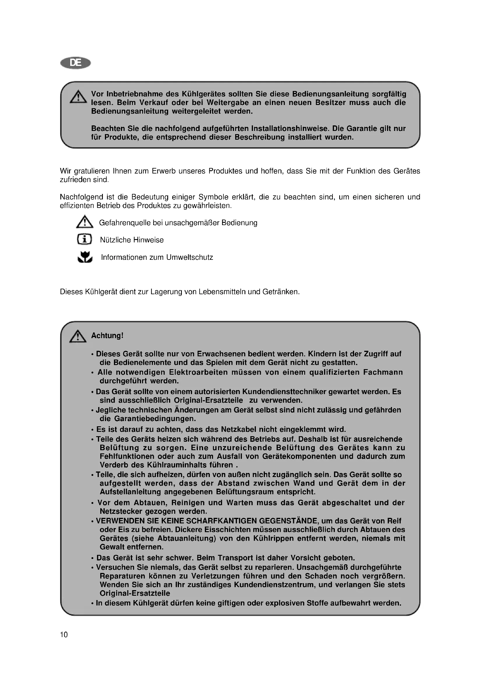 Vor Inbetriebnahme des Kühlgerätes sollten Sie diese Bedienungsanleitung sorgfältig lesen. Beim Verkauf oder bei Weitergabe an einen neuen Besitzer muss auch die Bedienungsanleitung weitergeleitet werden. Beachten Sie die nachfolgend aufgeführten Installationshinweise. Die Garantie gilt nur für Produkte, die entsprechend dieser Beschreibung installiert wurden. Wir gratulieren Ihnen zum Erwerb unseres Produktes und hoffen, dass Sie mit der Funktion des Gerätes zufrieden sind. Nachfolgend ist die Bedeutung einiger Symbole erklärt, die zu beachten sind, um einen sicheren und effizienten Betrieb des Produktes zu gewährleisten. Gefahrenquelle bei unsachgemäßer Bedienung Nützliche Hinweise Informationen zum Umweltschutz Dieses Kühlgerät dient zur Lagerung von Lebensmitteln und Getränken. Achtung!